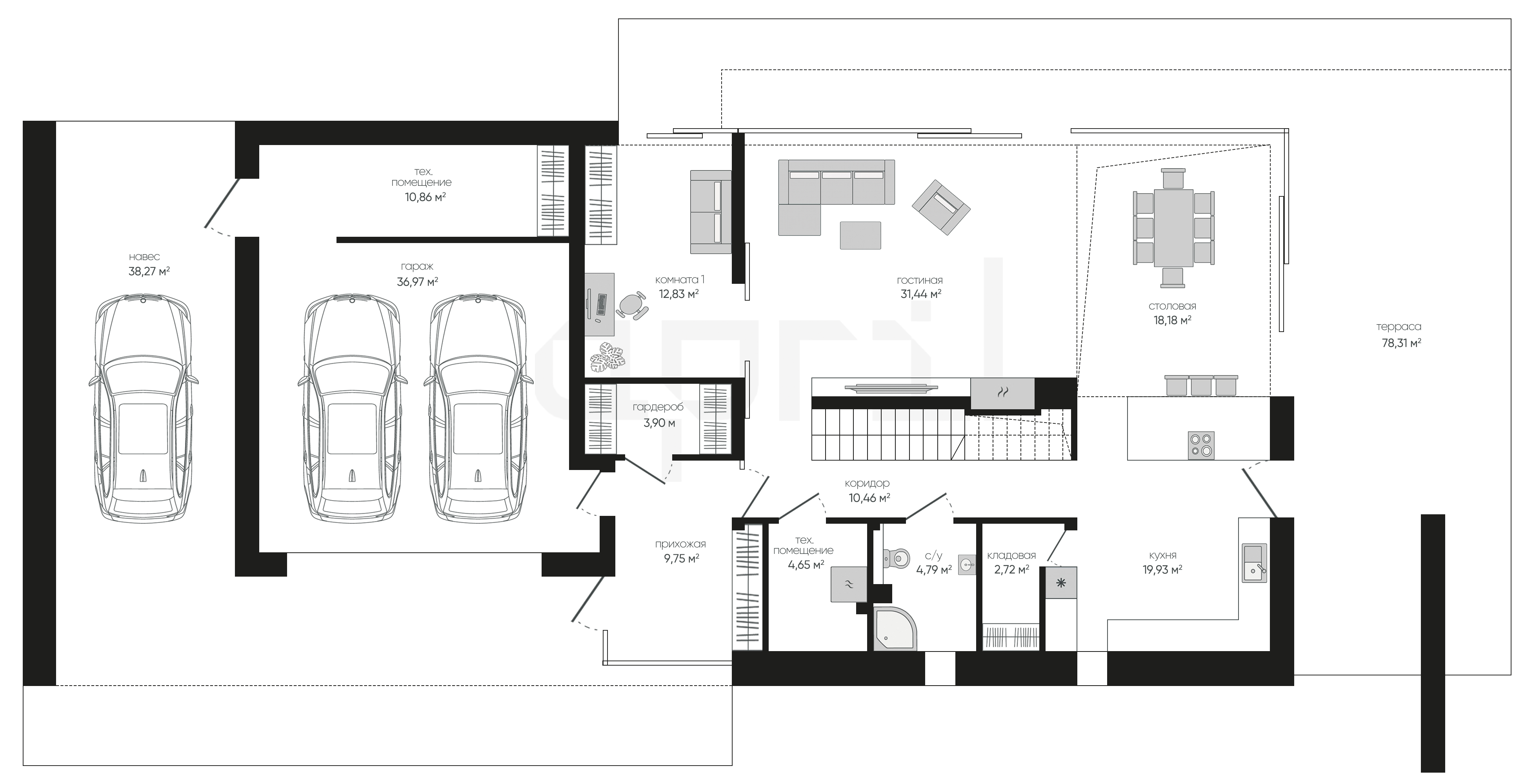 Проект двухэтажного дома с просторным гаражом, плоской крышей и террасой.