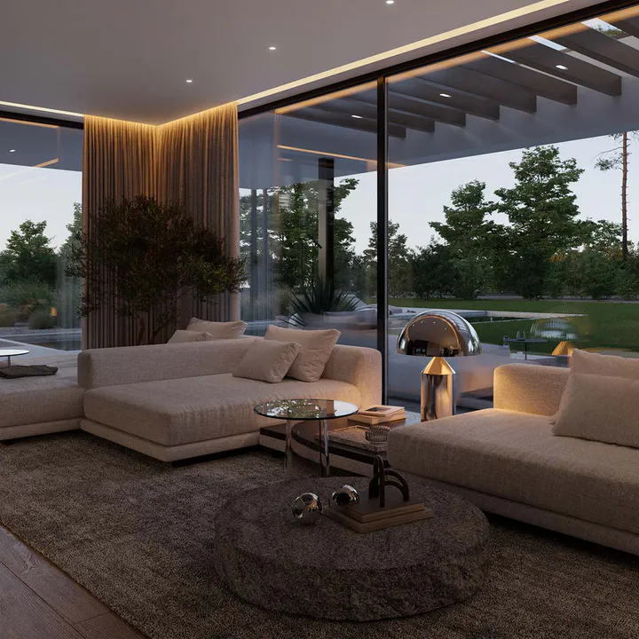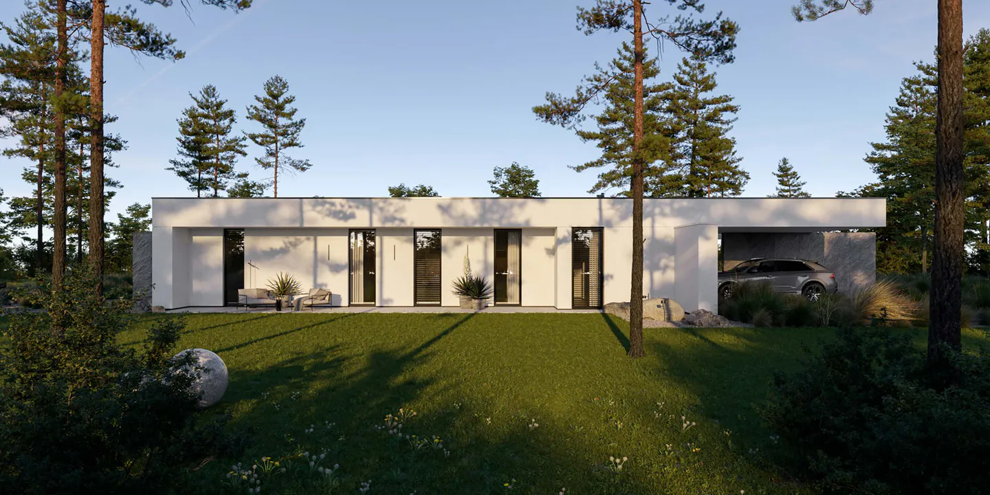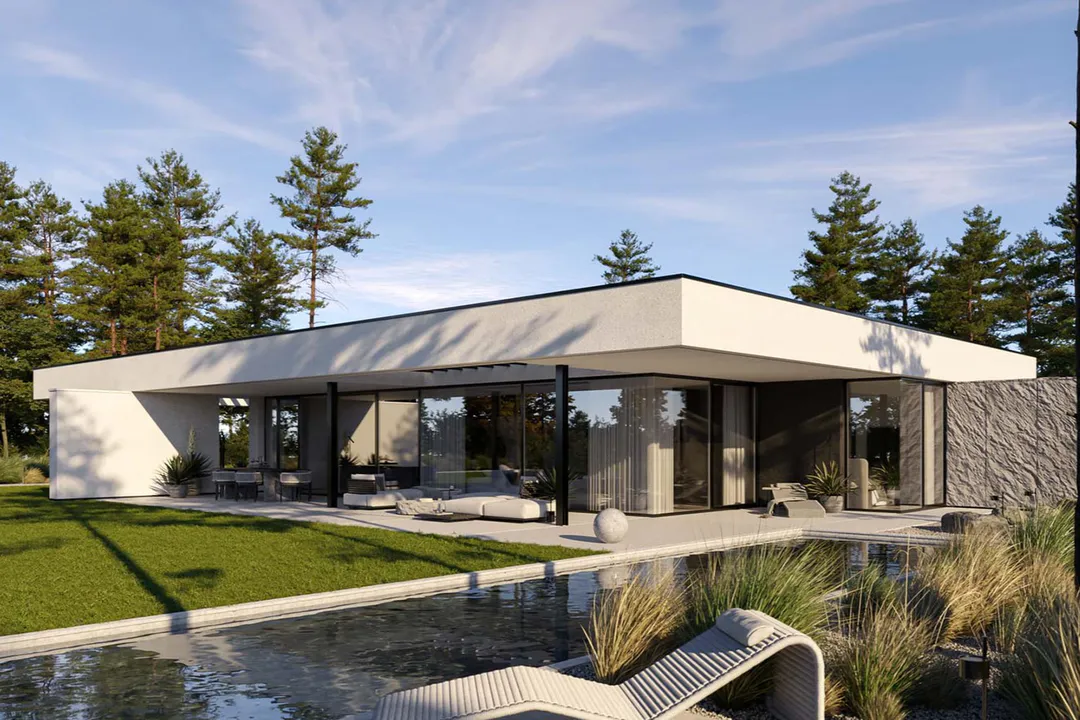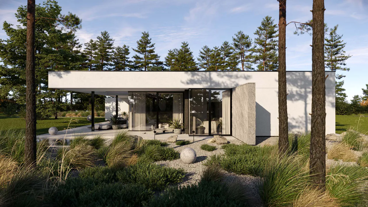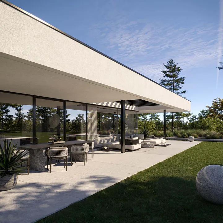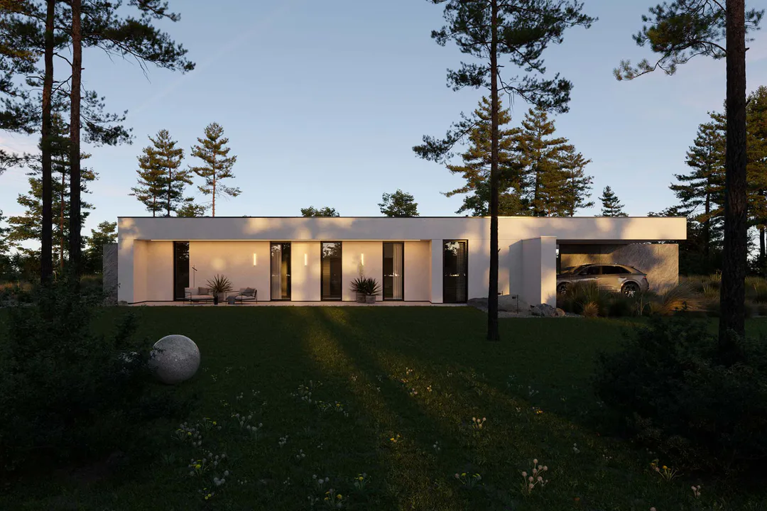 Дом спроектирован с использованием большого количества остекления, что создает открытое и светлое внутреннее пространство и гармонично соединяет его с окружающей природой.
