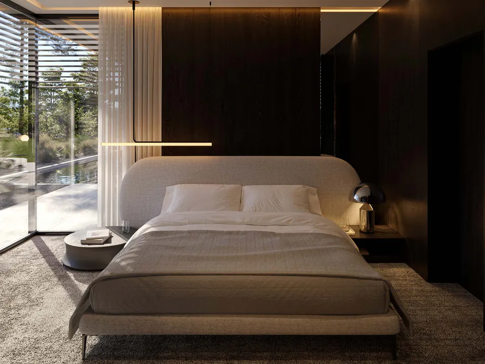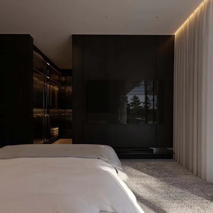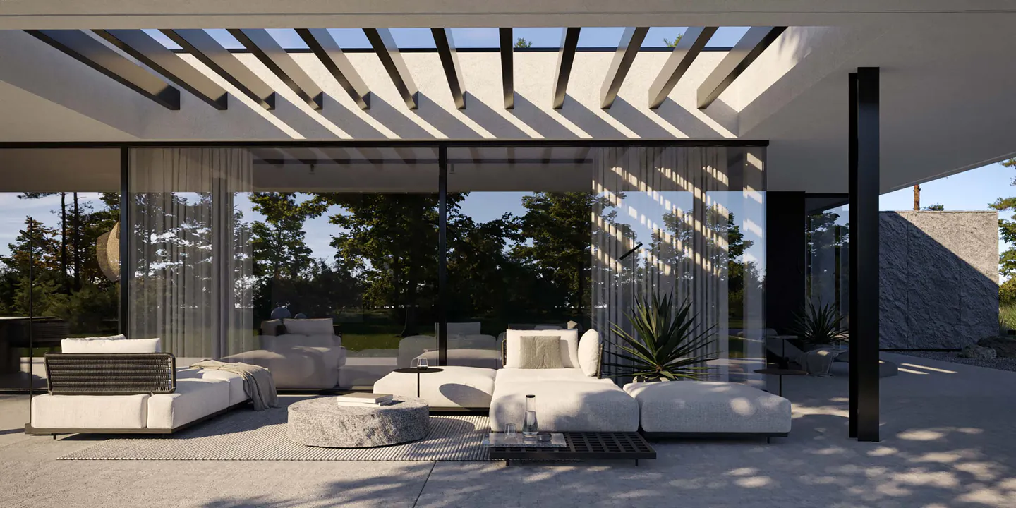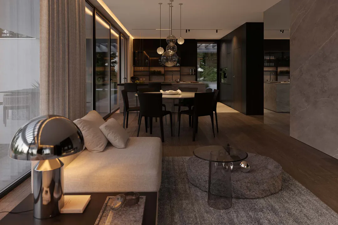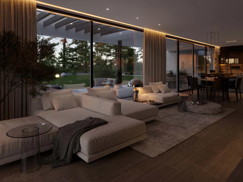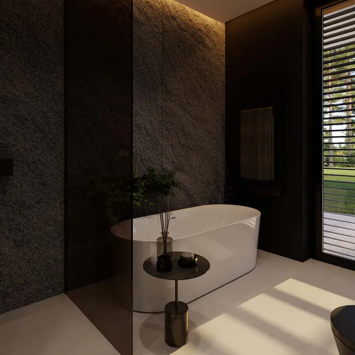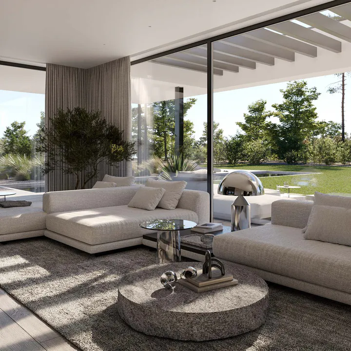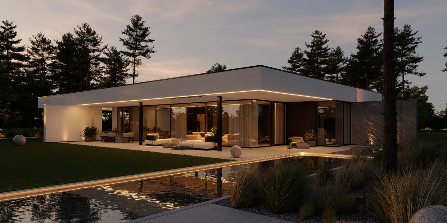 Дом спроектирован с использованием большого количества остекления, что создает открытое и светлое внутреннее пространство и гармонично соединяет его с окружающей природой.