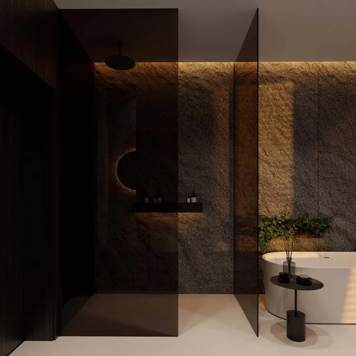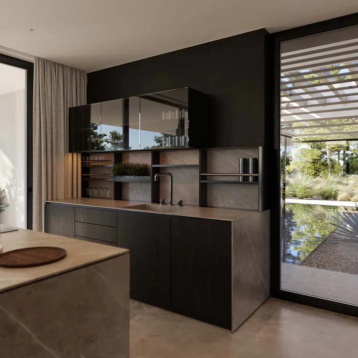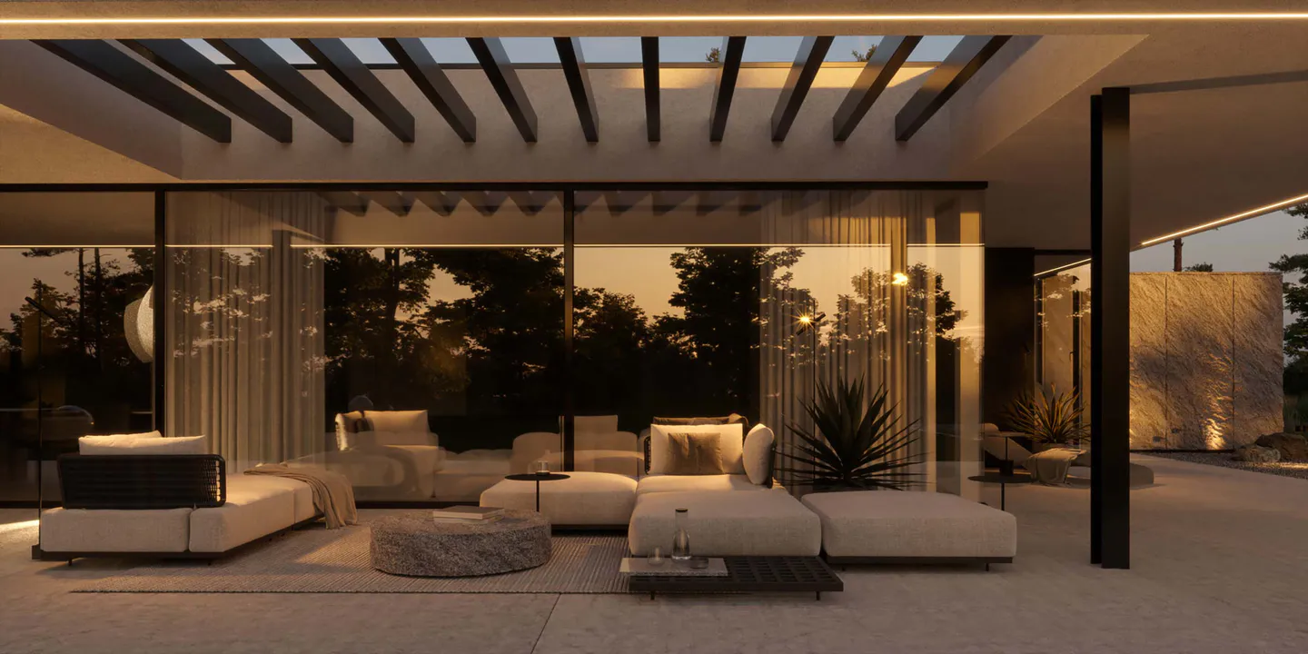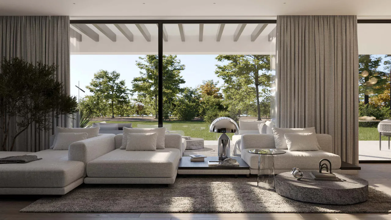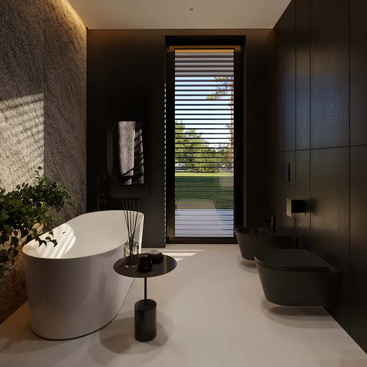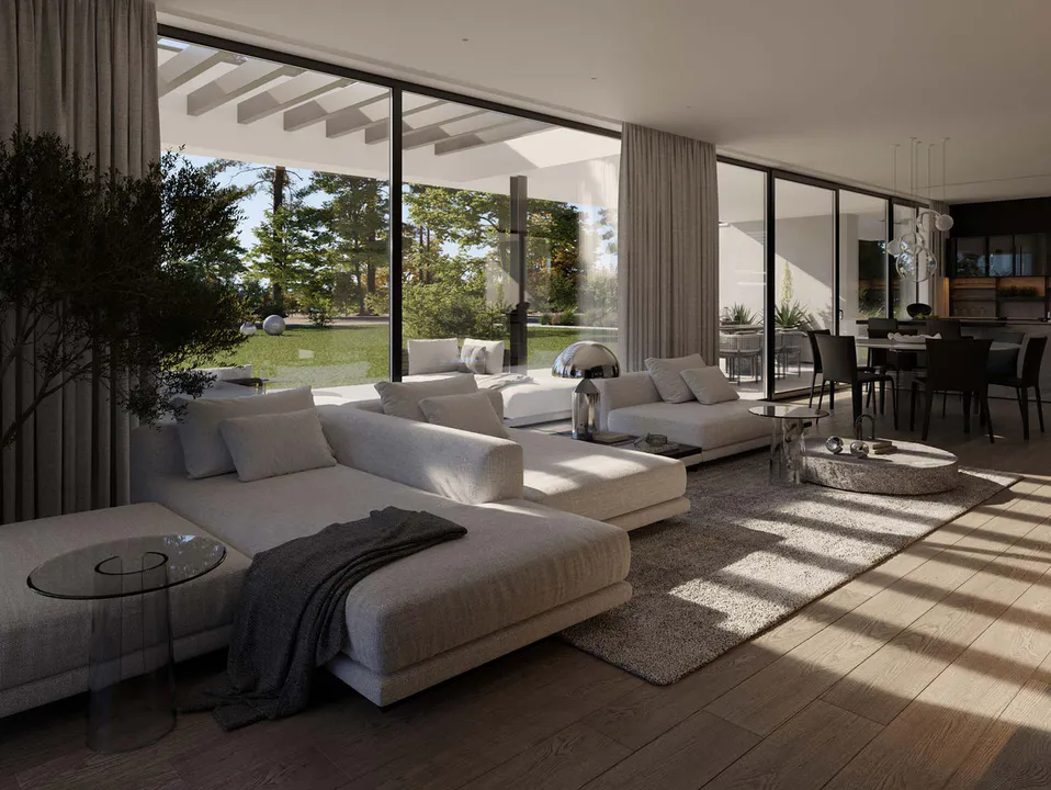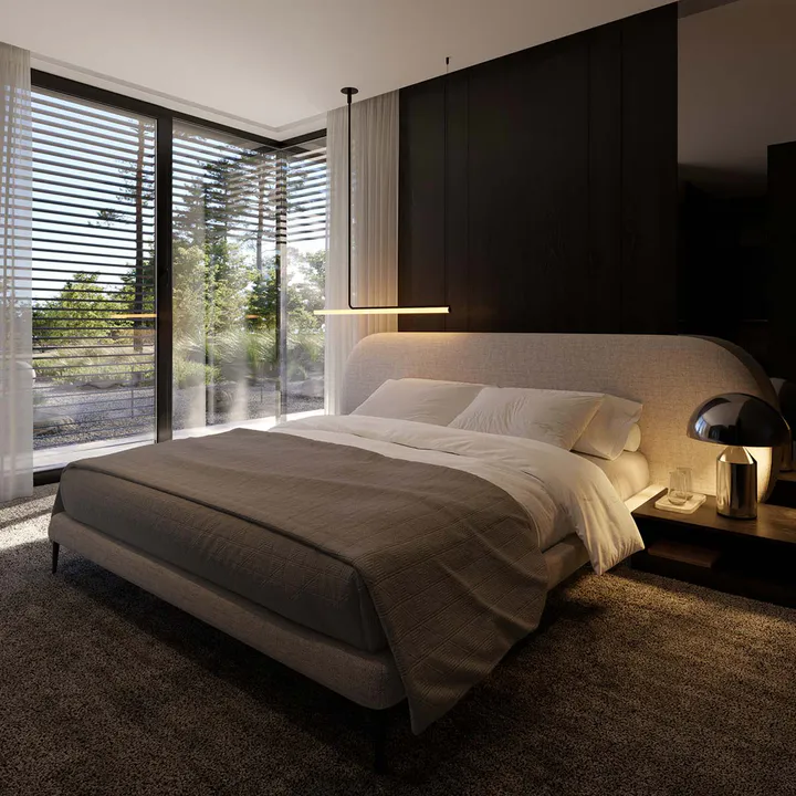 Дом спроектирован с использованием большого количества остекления, что создает открытое и светлое внутреннее пространство и гармонично соединяет его с окружающей природой.