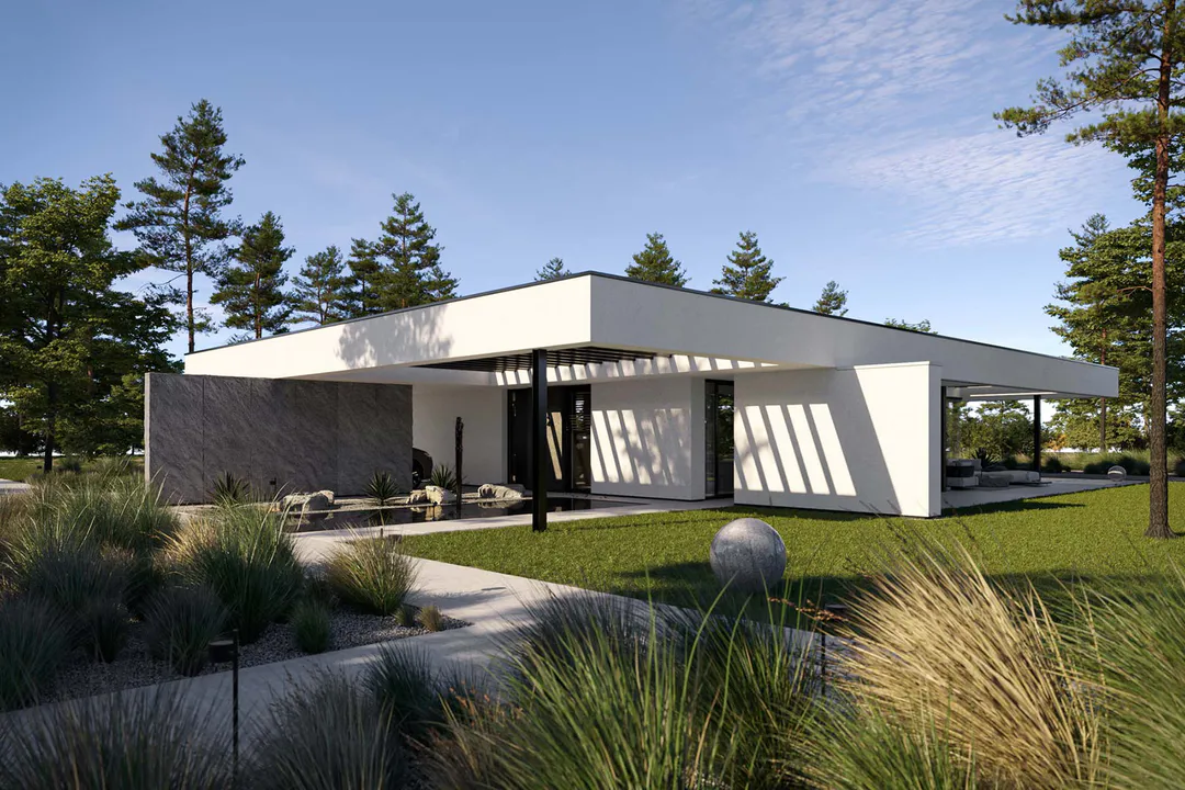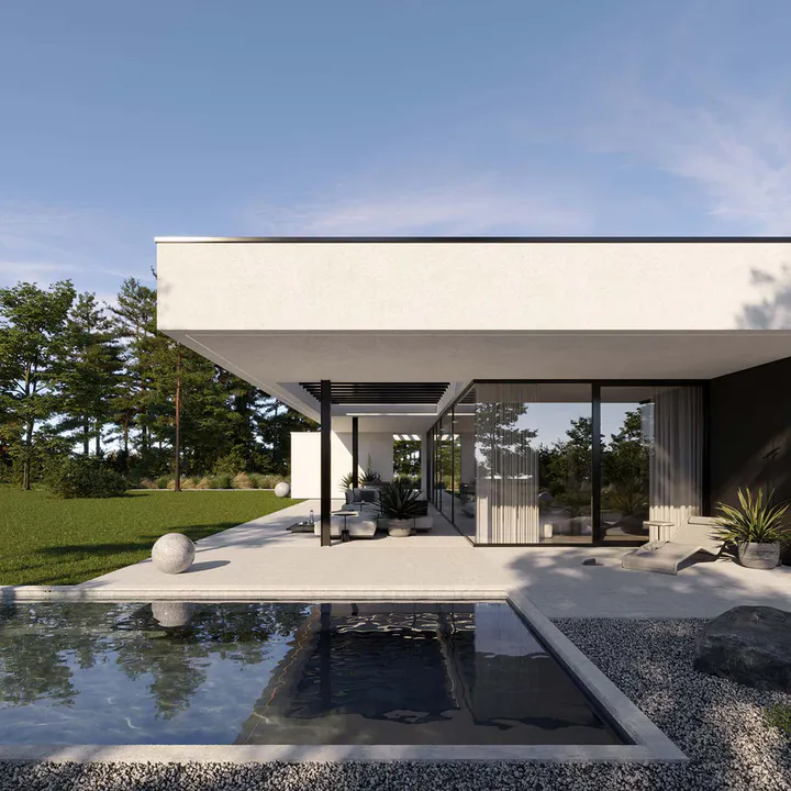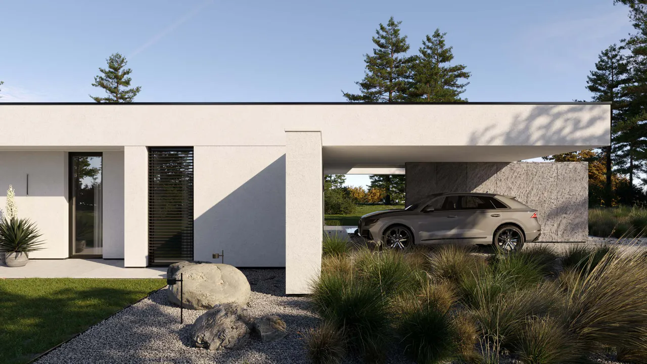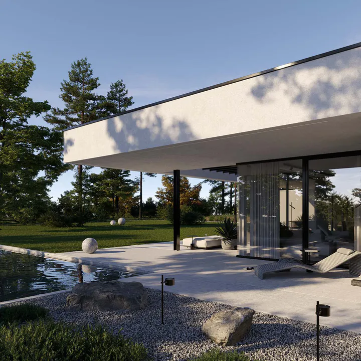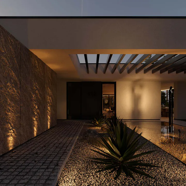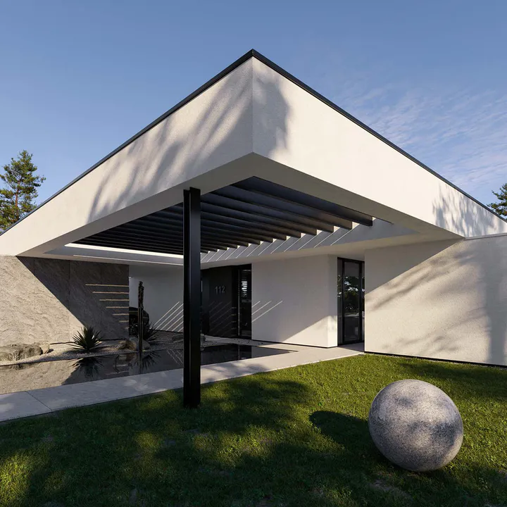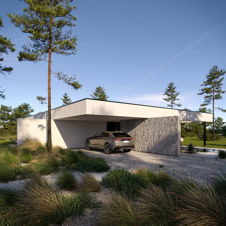 Он имеет плоскую крышу и чистые прямые линии, подчеркивающие его геометрическую форму. Внешние стены комбинируют белую штукатурку с натуральным камнем, добавляя текстурный контраст.