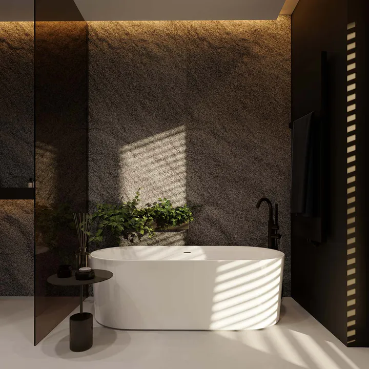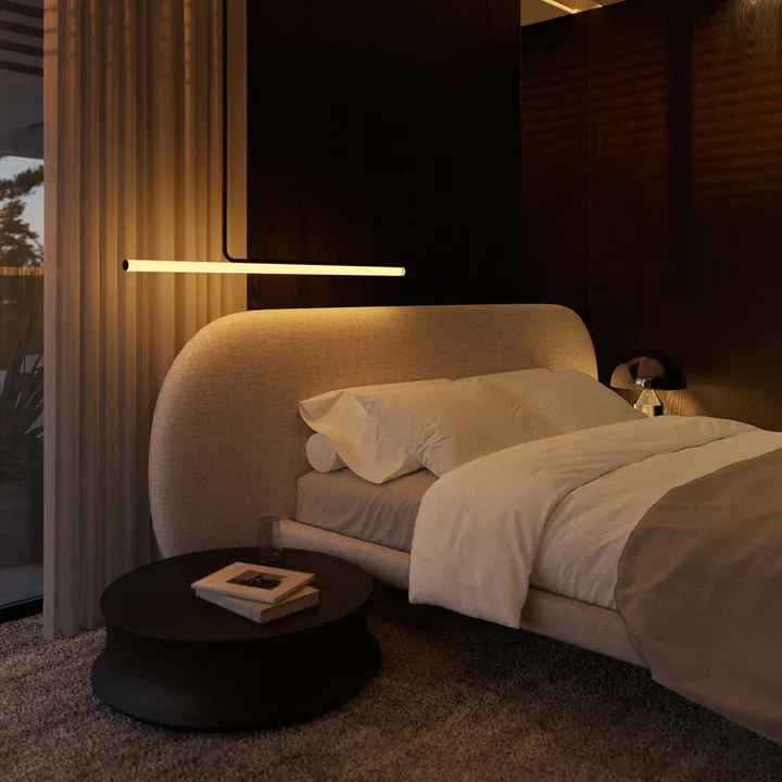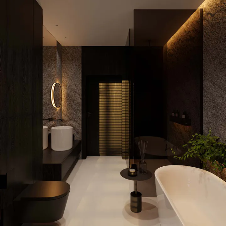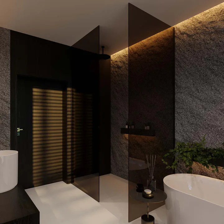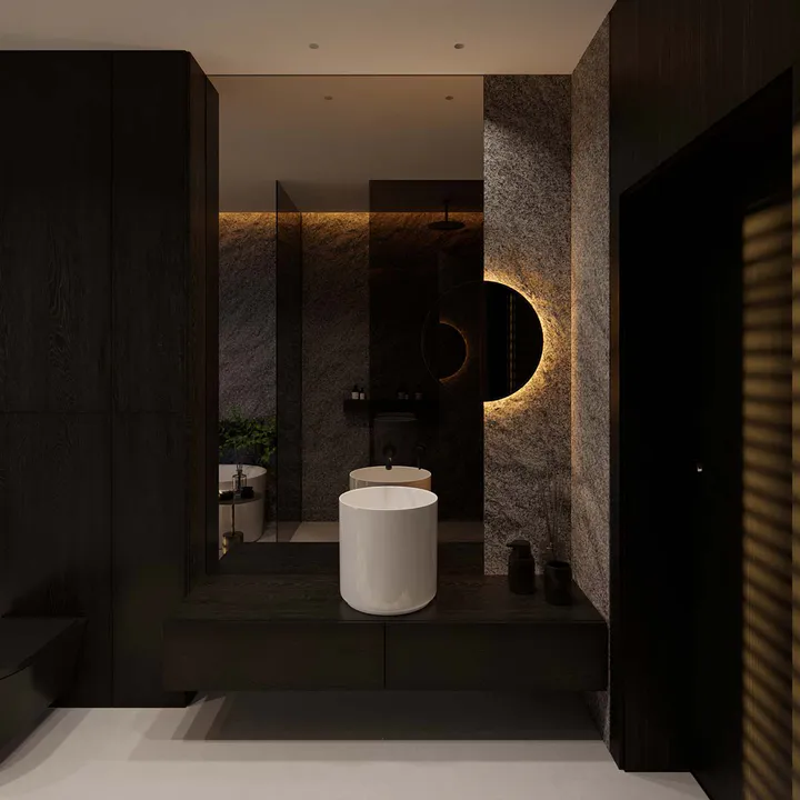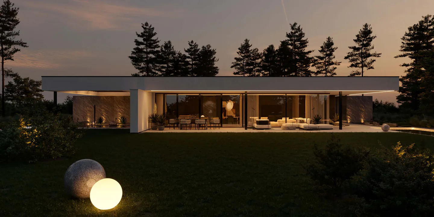 Он имеет плоскую крышу и чистые прямые линии, подчеркивающие его геометрическую форму. Внешние стены комбинируют белую штукатурку с натуральным камнем, добавляя текстурный контраст.
