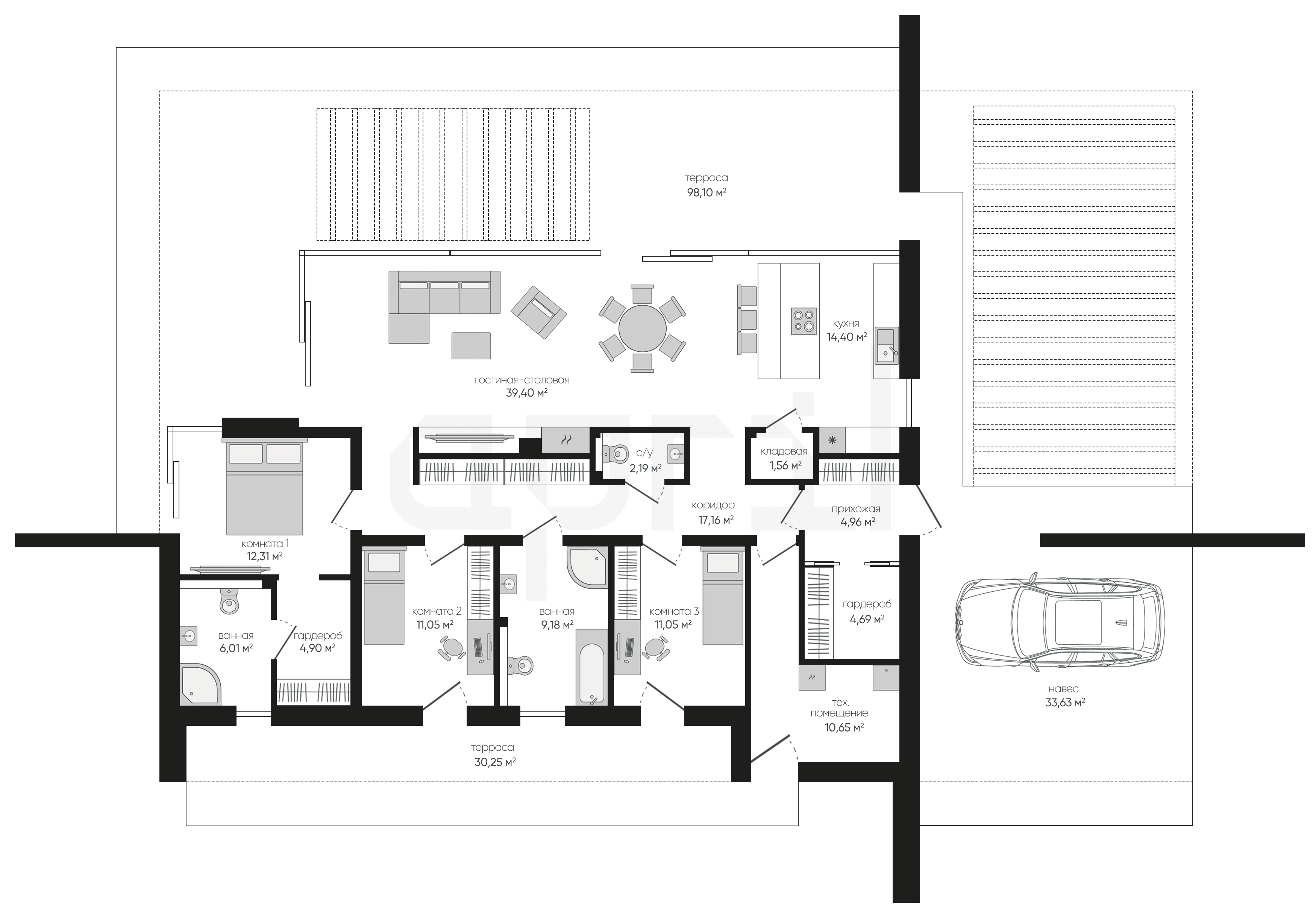 Проект выделяется среди других большой крытой террасой, частично оснащенной ажуром балочной перголы, и большим остеклением.