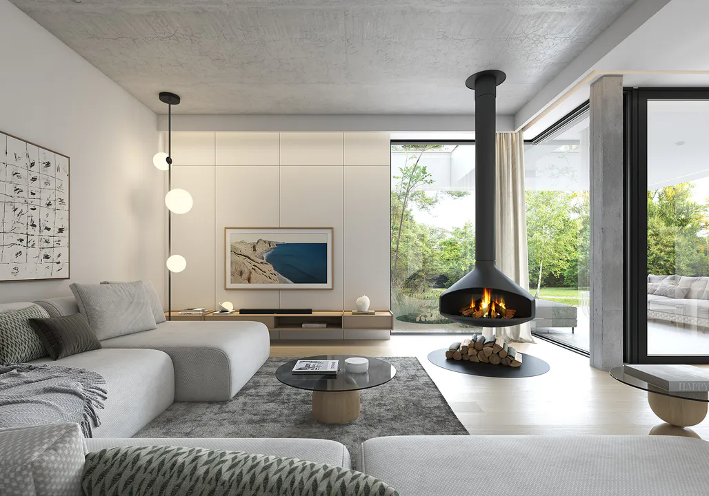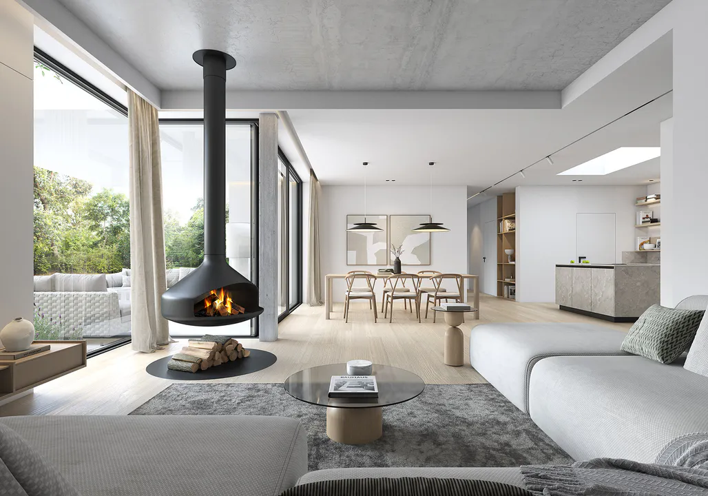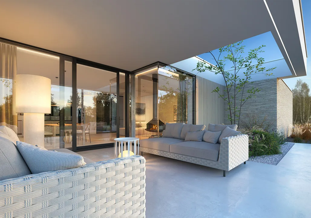 Большое остекление открывает вид на сад, обеспечивает интерьер естественным светом и делает открытым для окружающей среды.