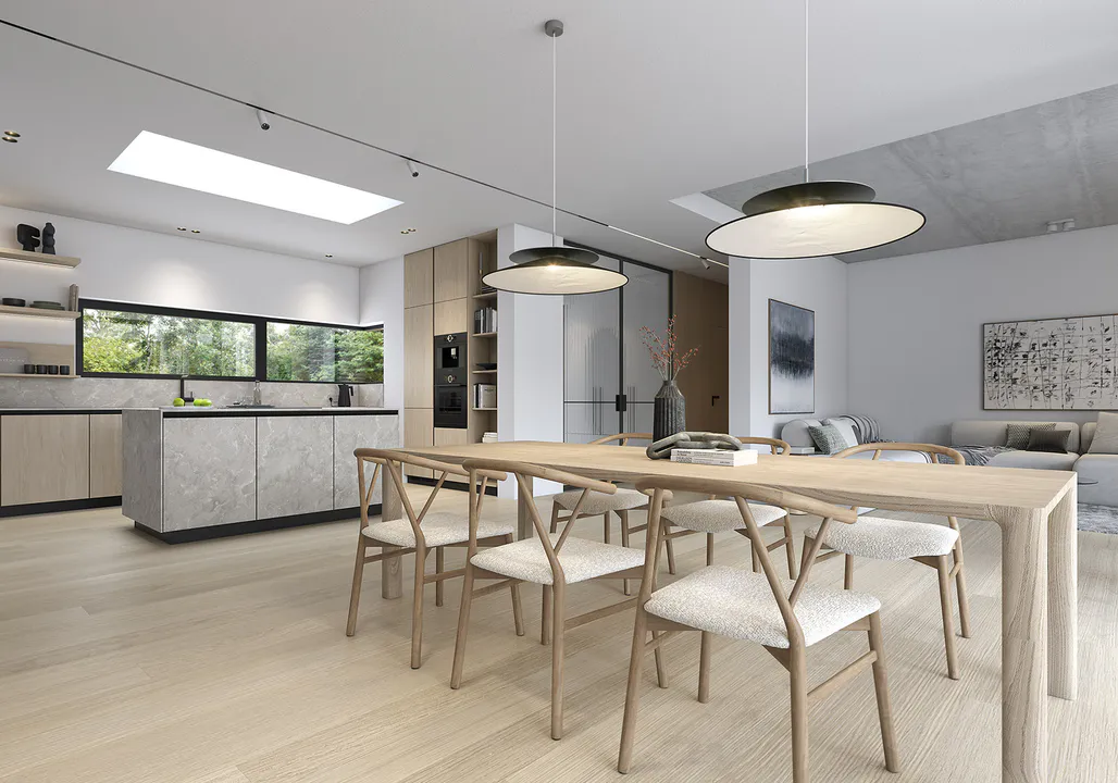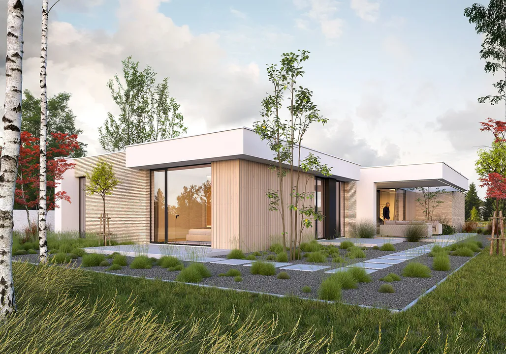 Современная форма дома скрывает в себе функциональный интерьер для семьи из 4-5 человек с четким разделением на зоны.
