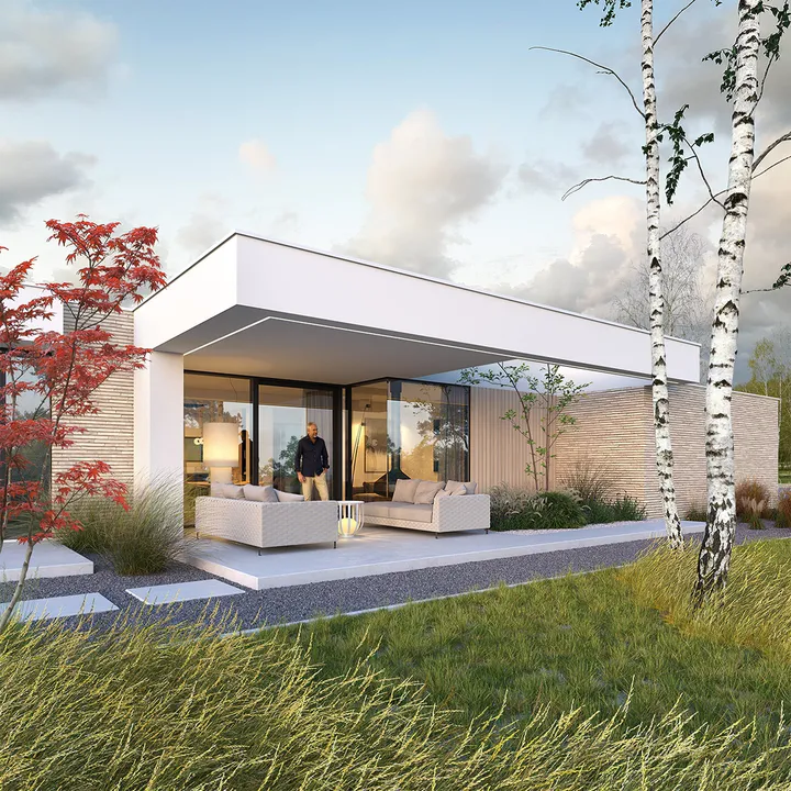 Проект одноэтажного дома в стиле Хайтек с просторным гаражом, плоской крышей и террасой.