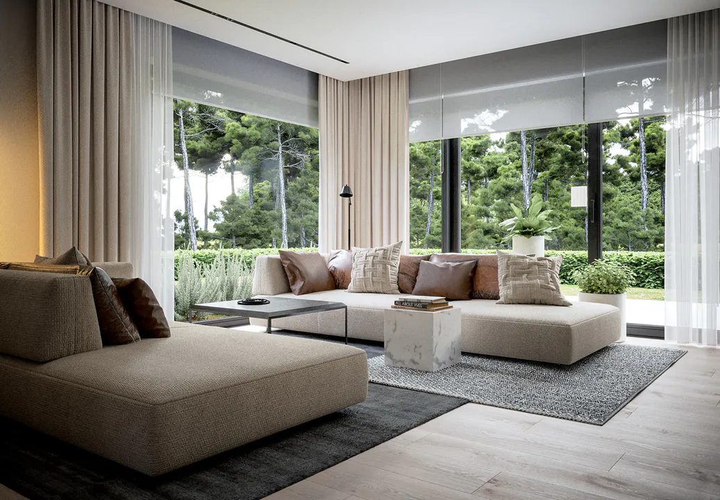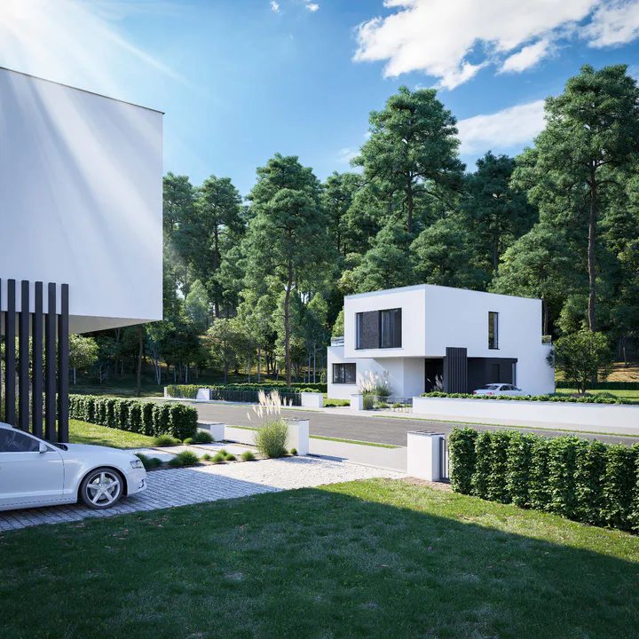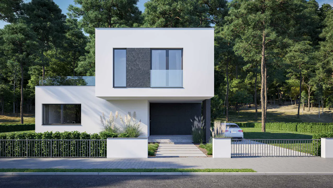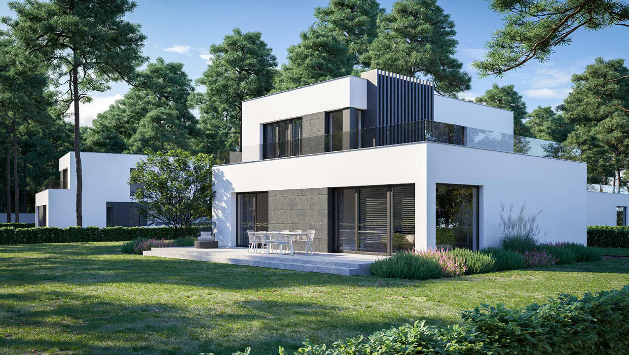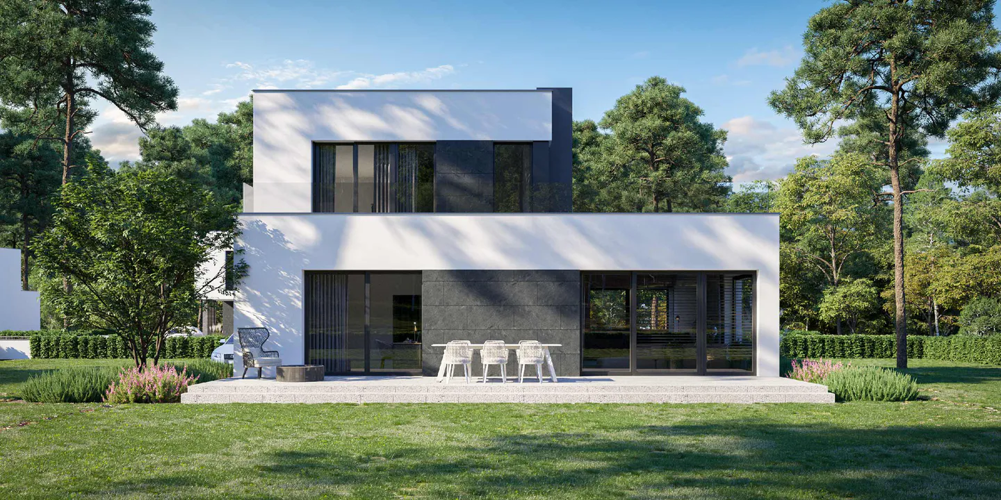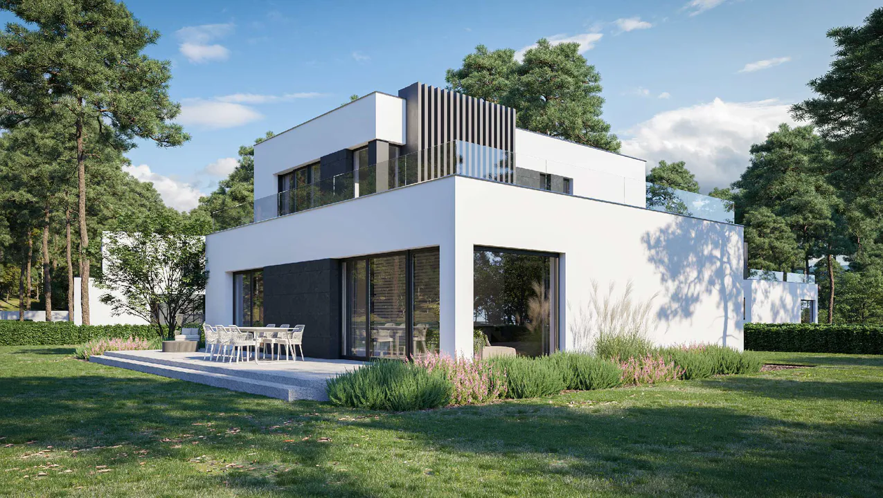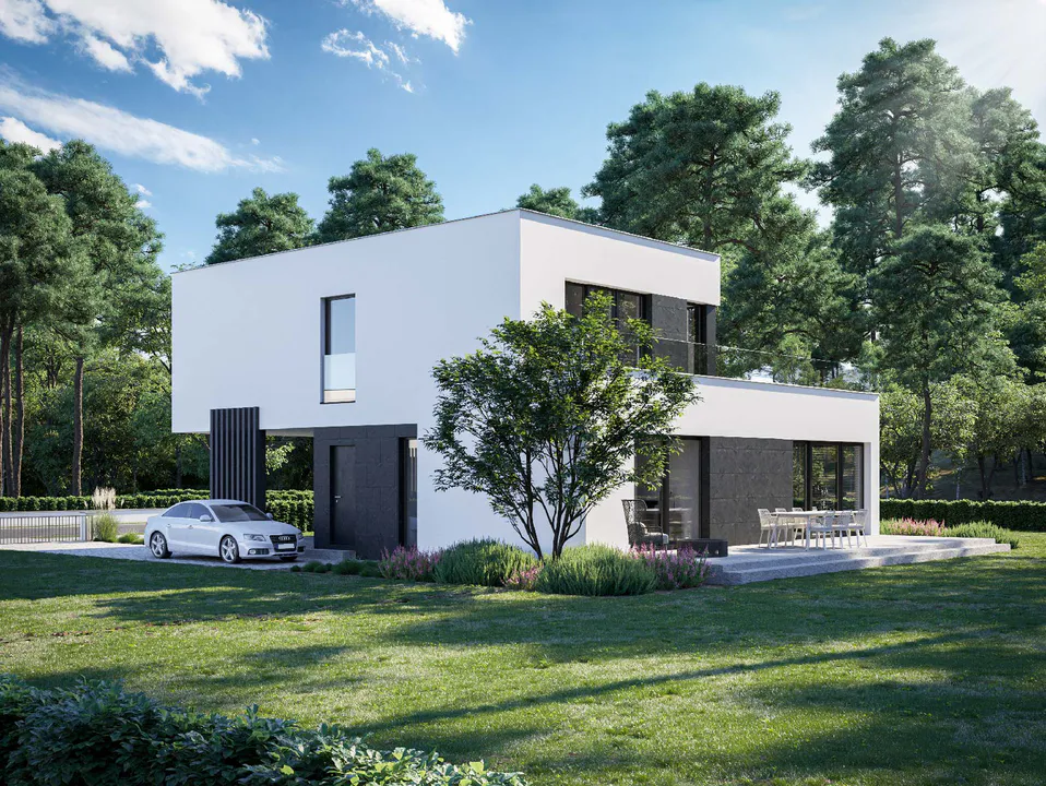 Кубическая форма и плоская крыша создают современный и функциональный проект, подходящий для любителей просторных интерьеров и современной архитектуры.