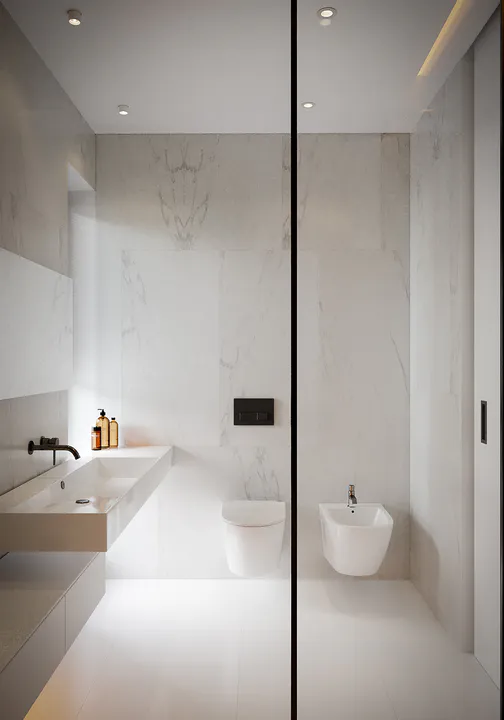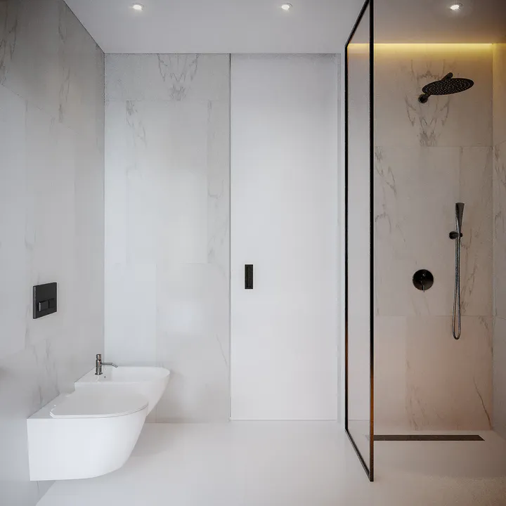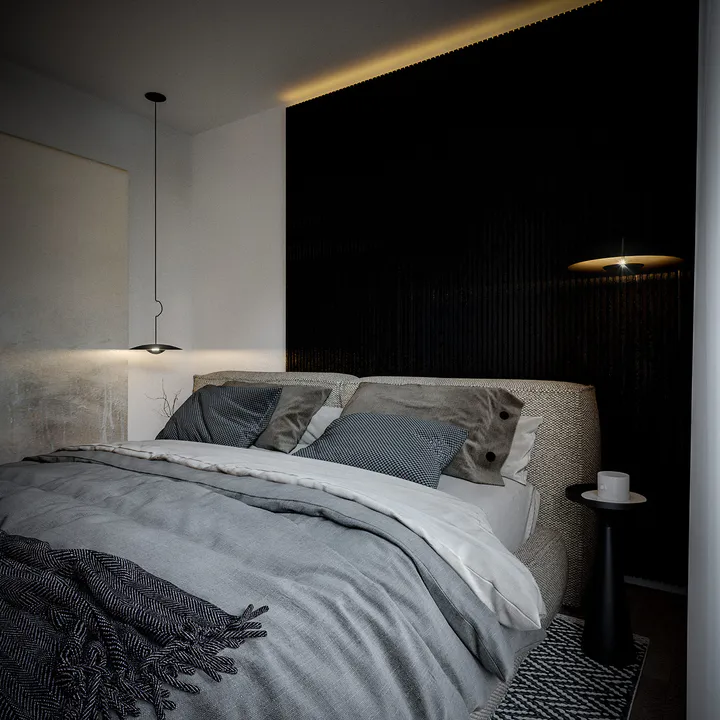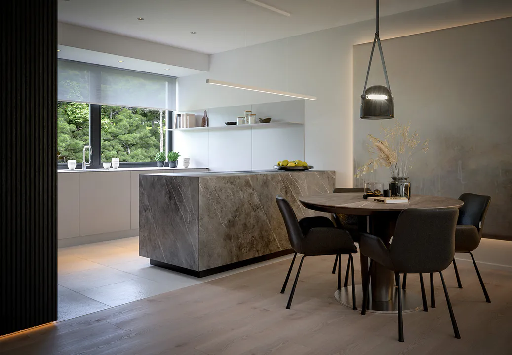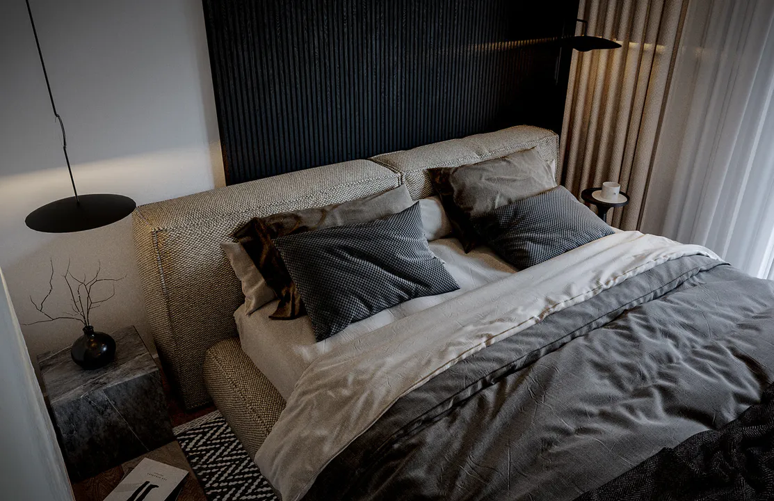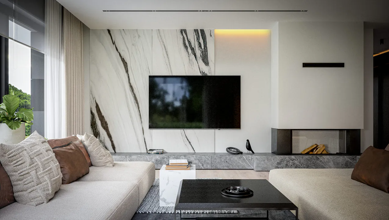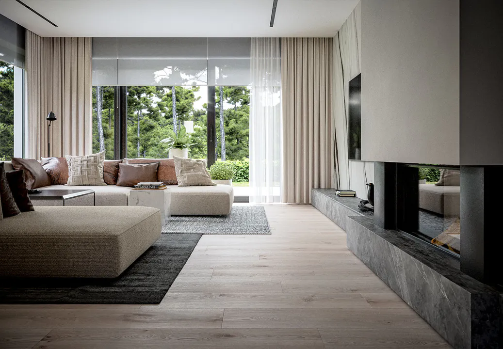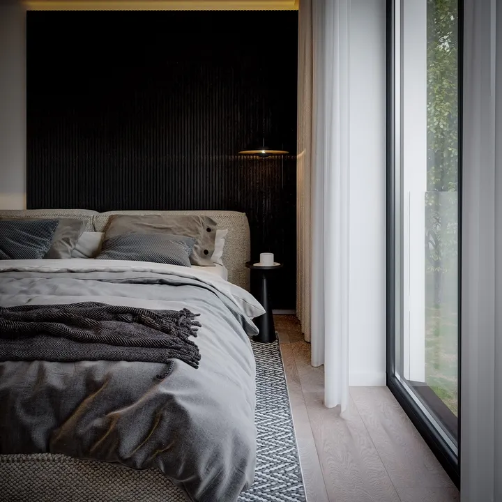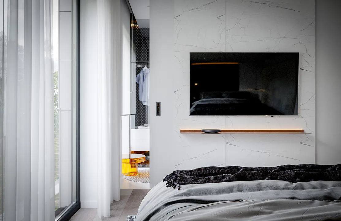 Строгий характер дома подчеркивает отделка фасада белой и серой штукатуркой с фрагментами каменных плит графитового оттенка.