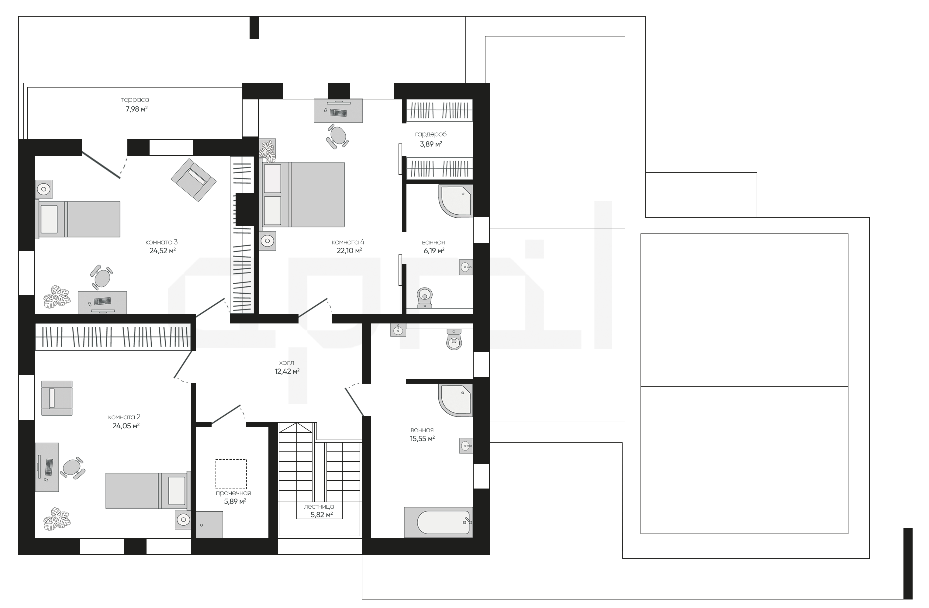 Проект подходит для большой семьи, предлагает простор, функциональность и элегантность, оборудован 4 комнатами, гаражом на 2 автомобиля, 4 ванными комнатами и зонами отдыха, специально разработанными для комфорта и удовлетворения всей семьи.