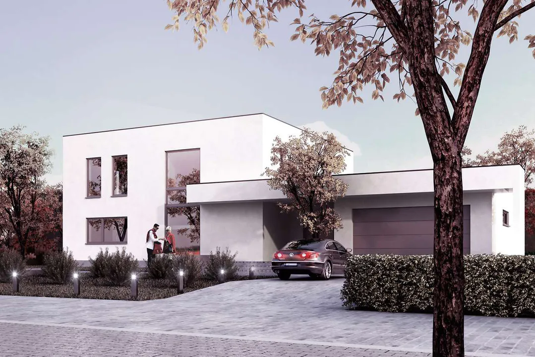 Проект двухэтажного дома в современном стиле Хайтек с большим гаражом и плоской крышей.