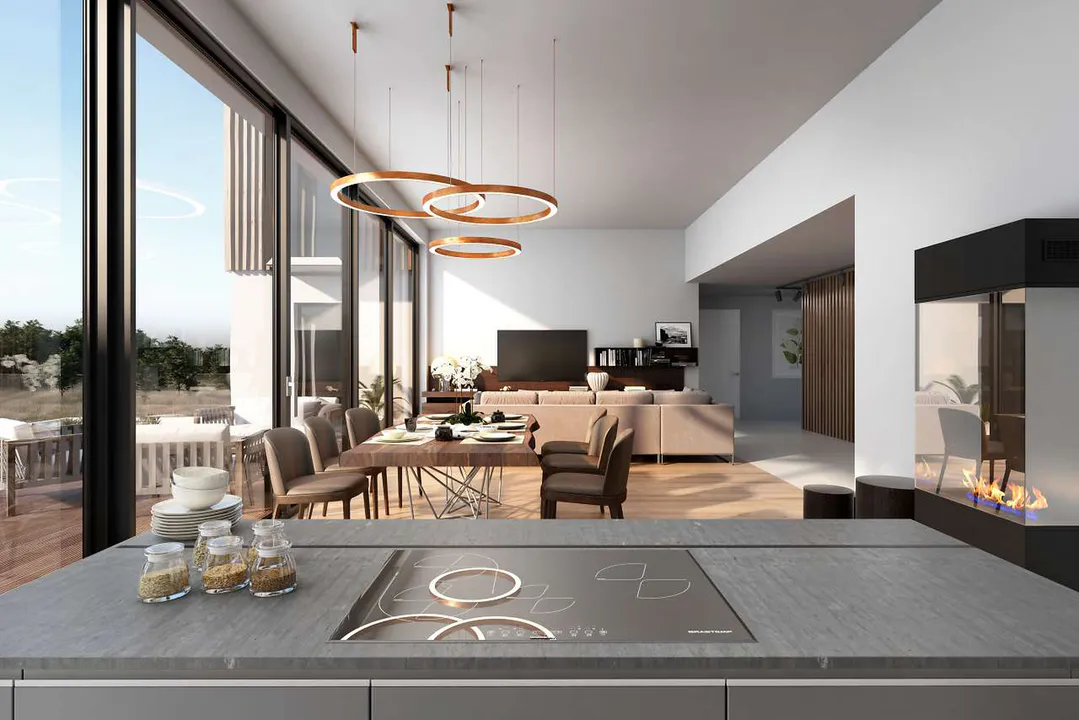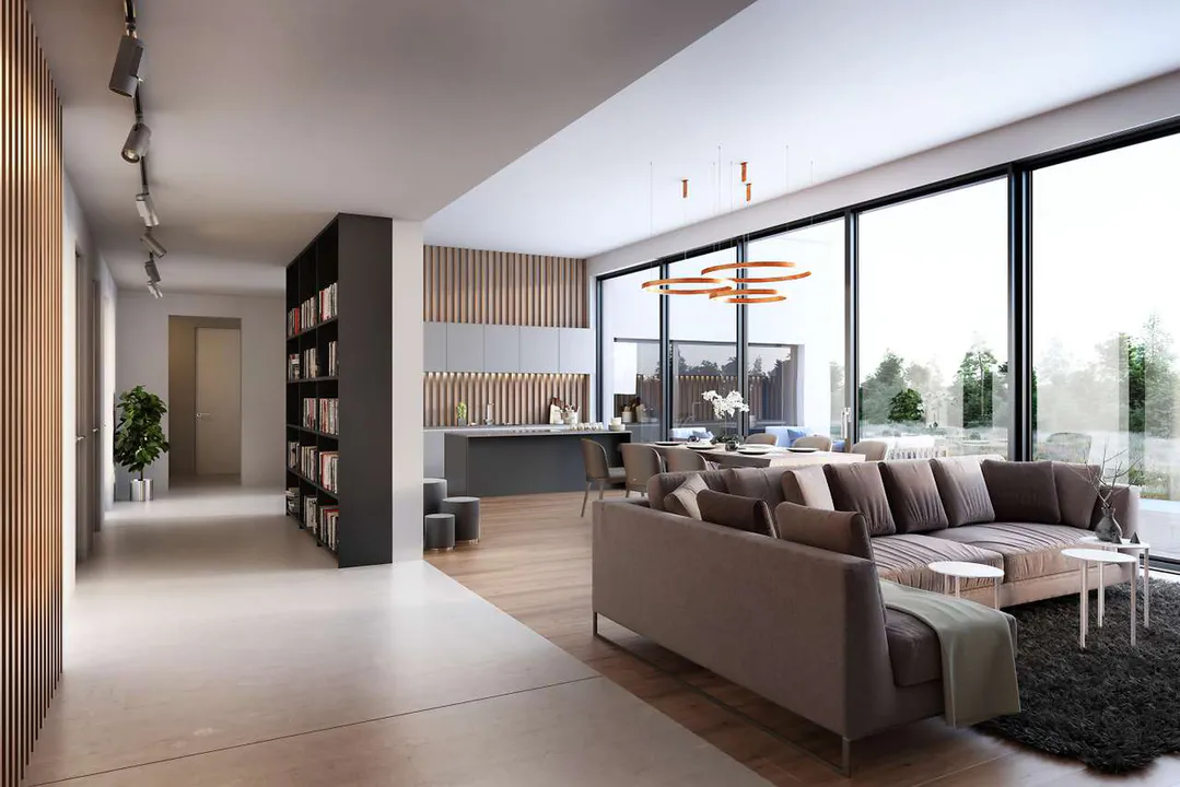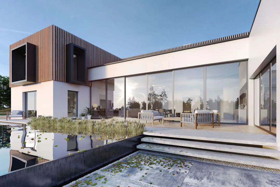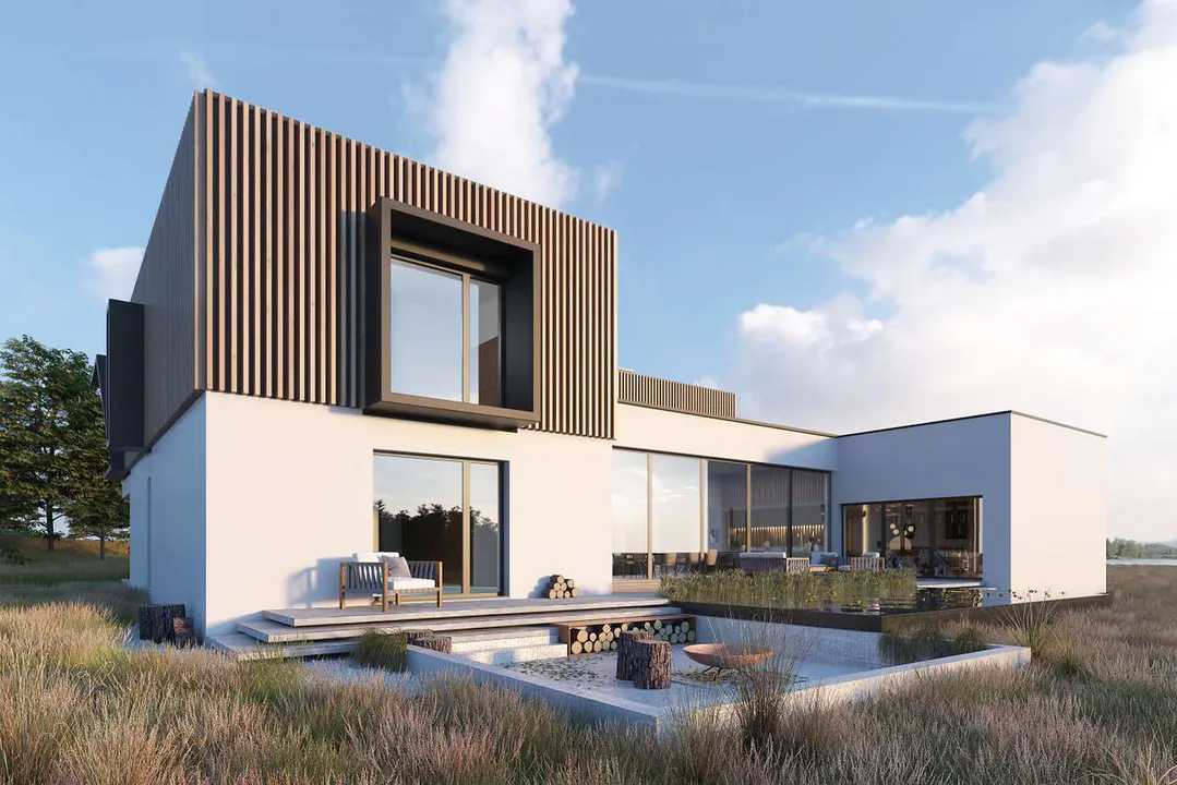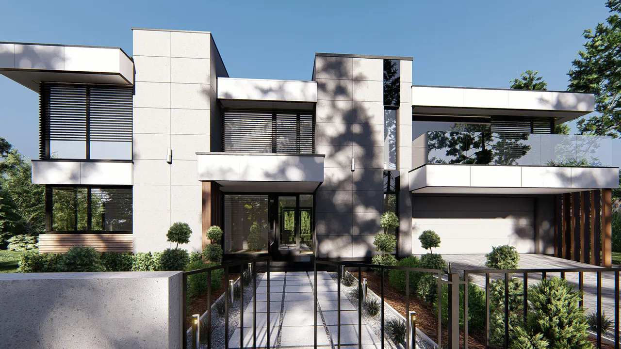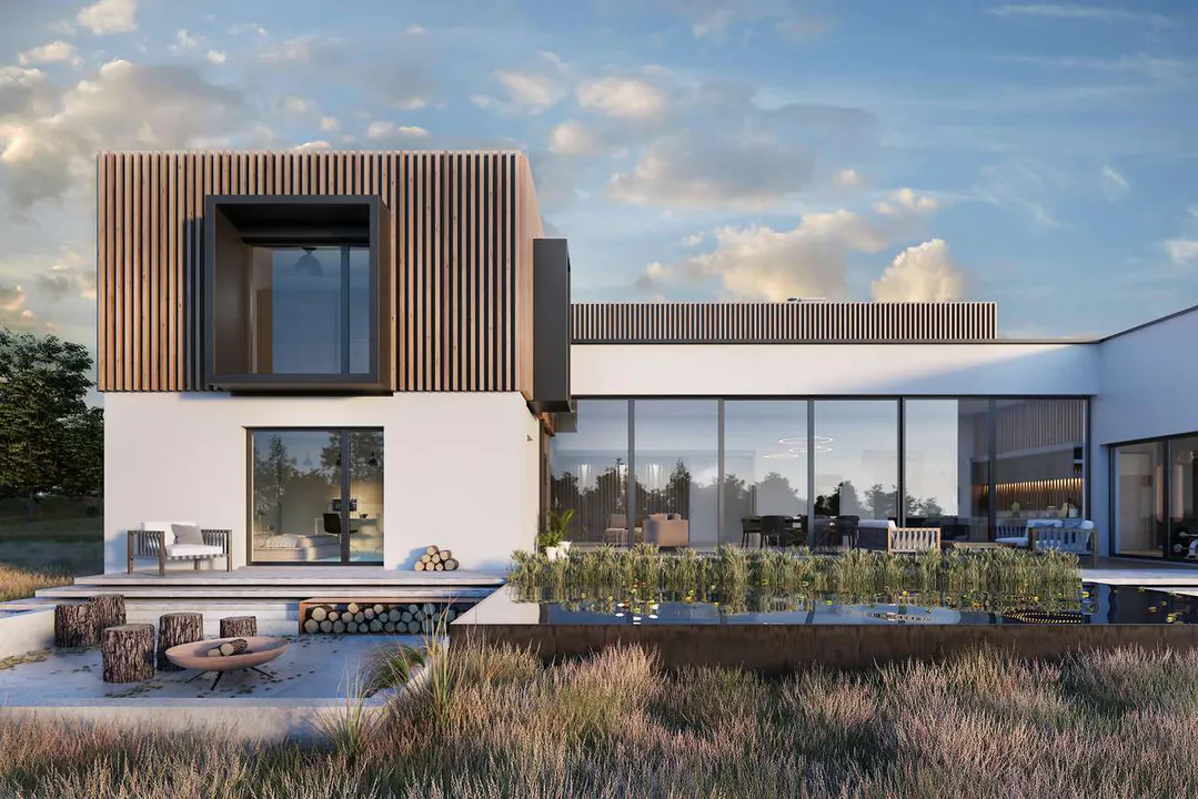 Современный проект дома выделяется архитектурой с чистыми линиями и минималистским дизайном, где гармонично сочетаются природные и искусственные элементы. Геометрические формы становятся частью фасада, а теплые и яркие цвета придают дому дружелюбный и гостеприимный облик.