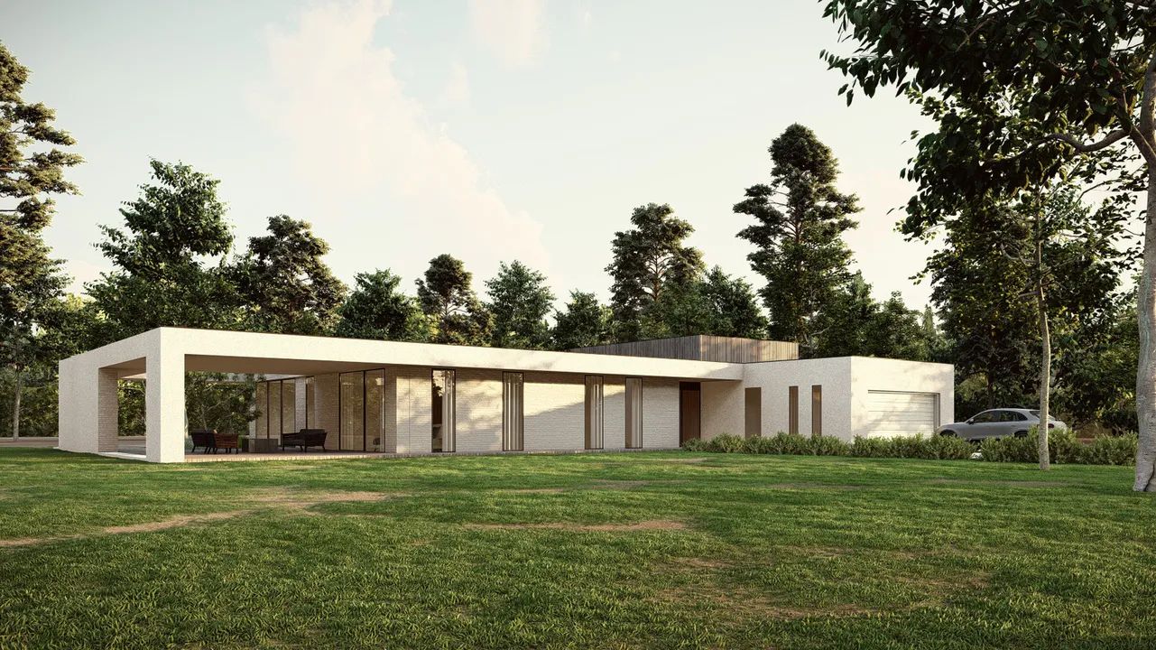 Дом с плоской крышей, четкими линиями и простыми формами, что характерно для Хайтек.
