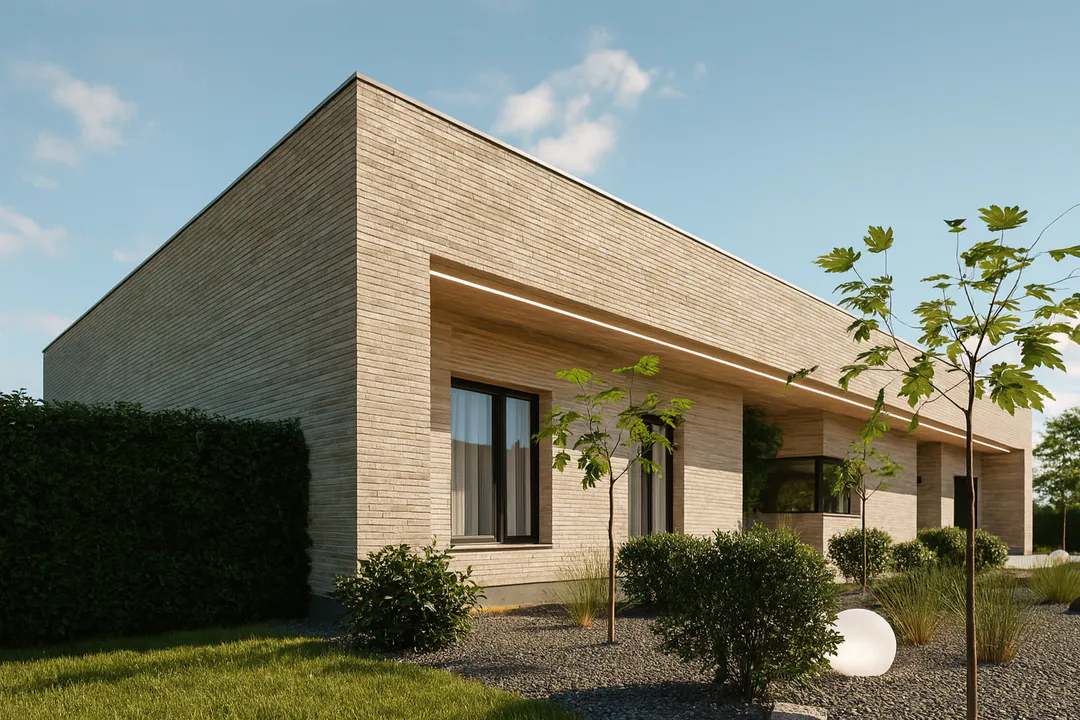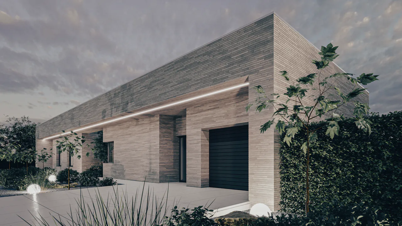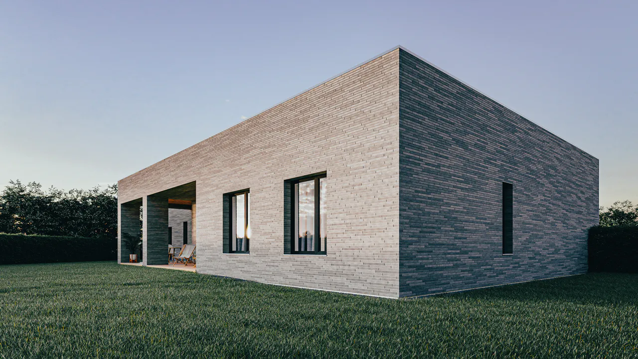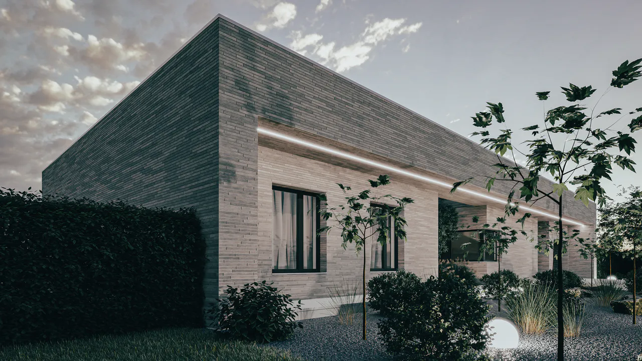 Фасад покрыт единым отделочным материалом, которым является минеральная плитка в форме длинного кирпича. Фасад имеет акцент в виде зеленого патио, ограничивающего вид на гостиную.