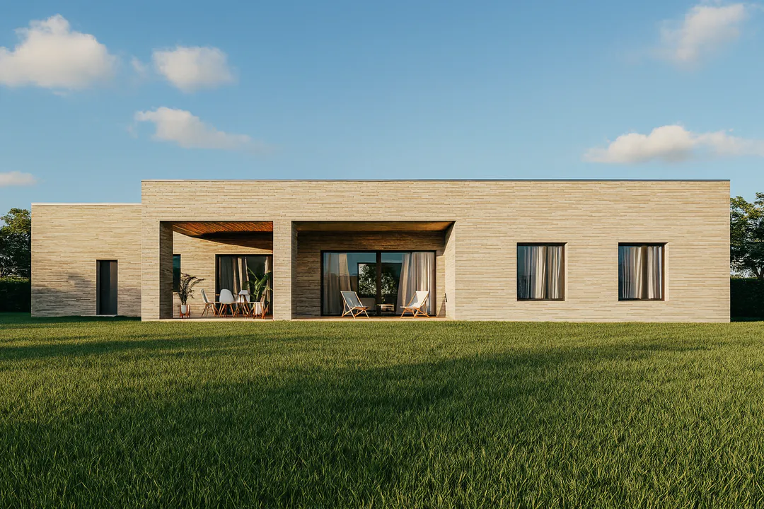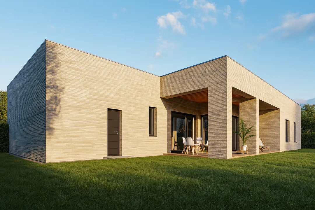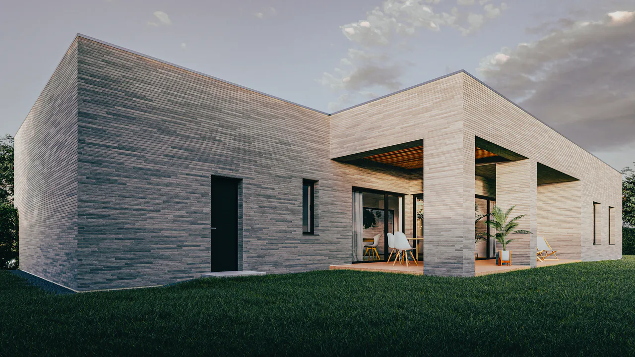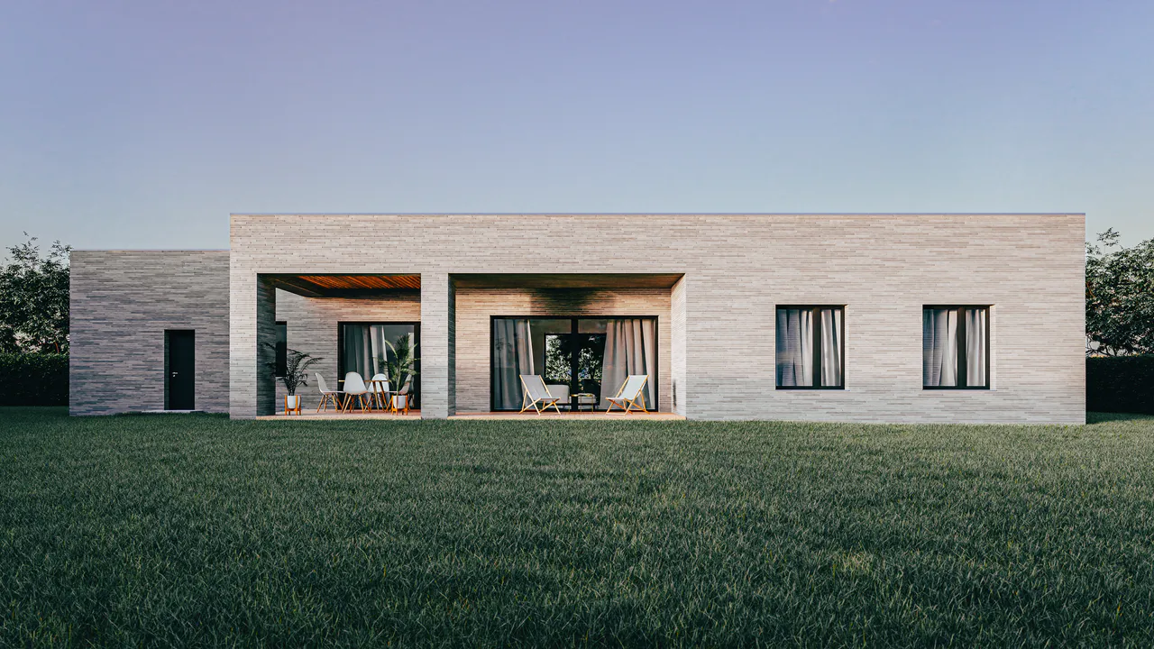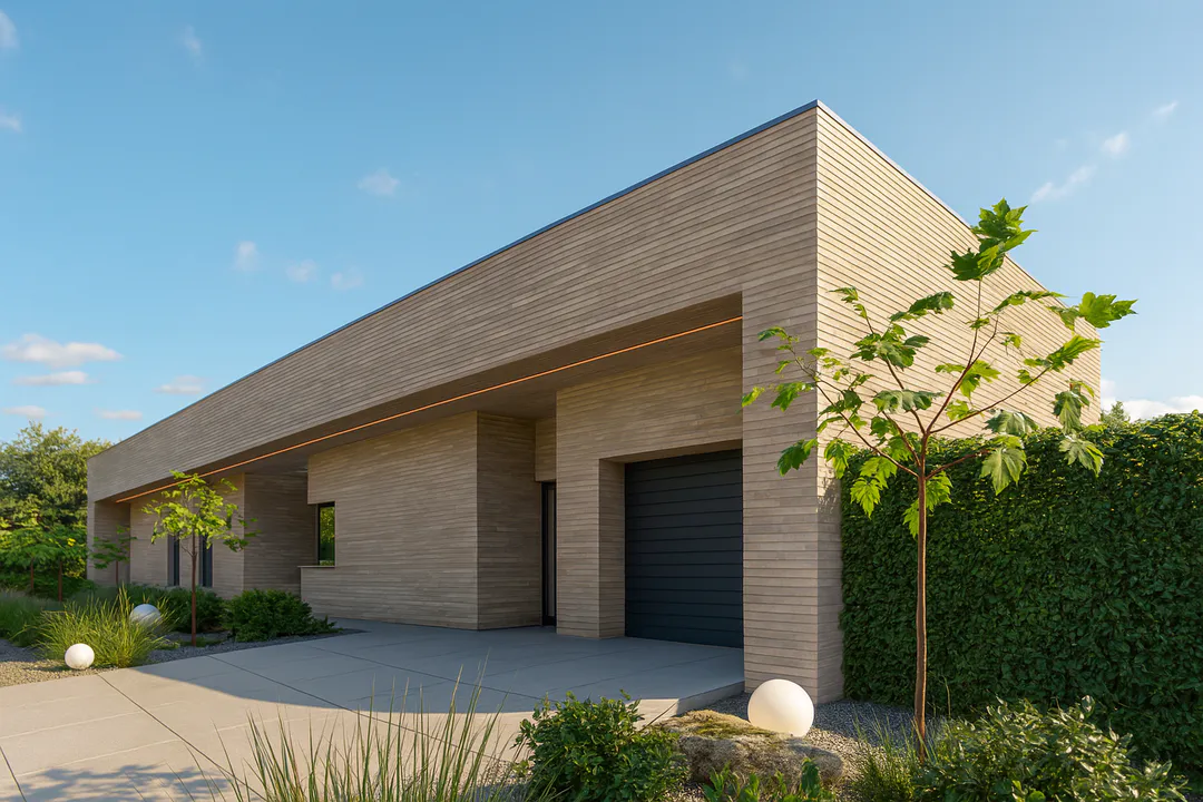 Фасад покрыт единым отделочным материалом, которым является минеральная плитка в форме длинного кирпича. Фасад имеет акцент в виде зеленого патио, ограничивающего вид на гостиную.