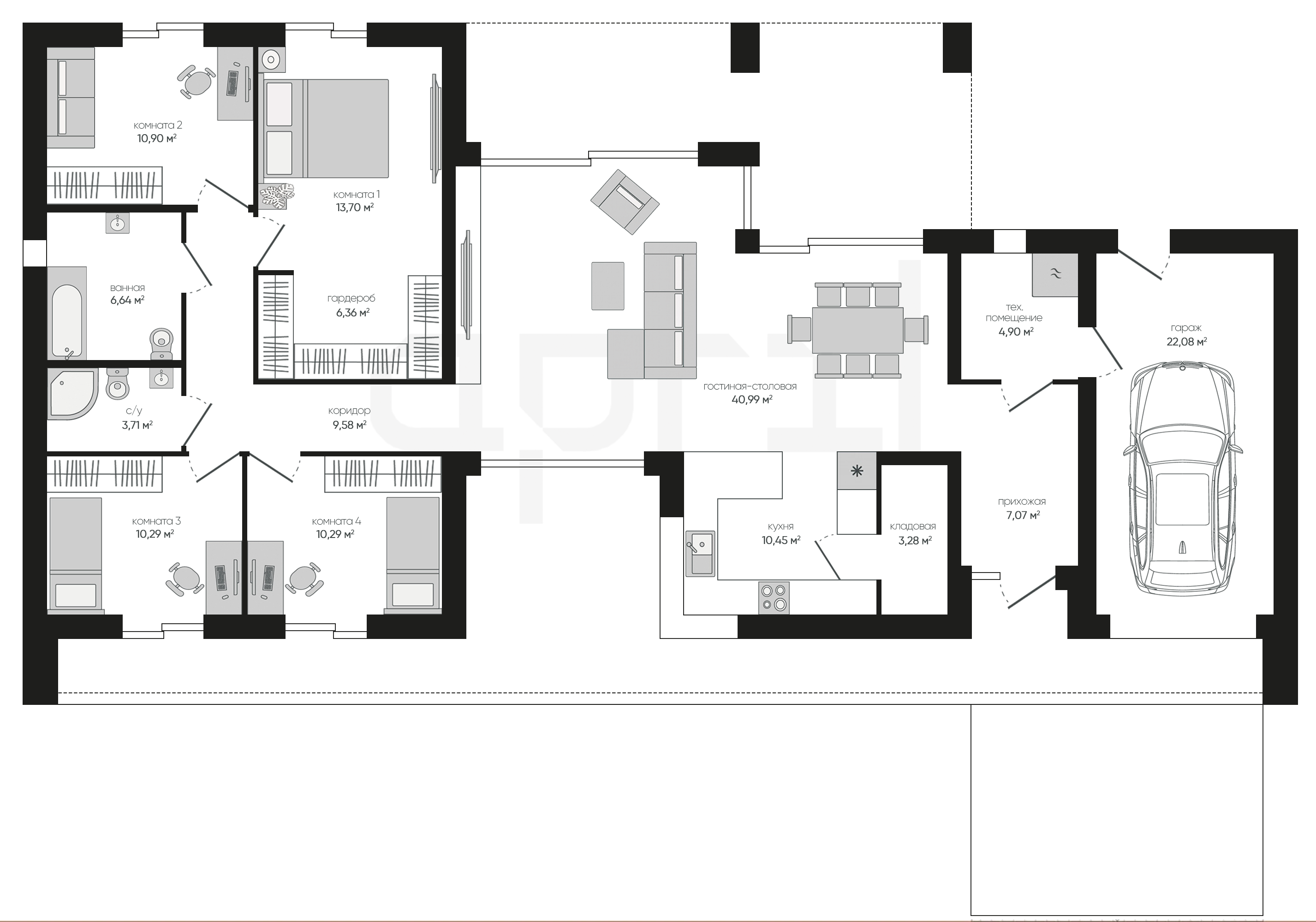 Проект современного одноэтажного дома с плоской крышей, встроенным гаражом и террасой.