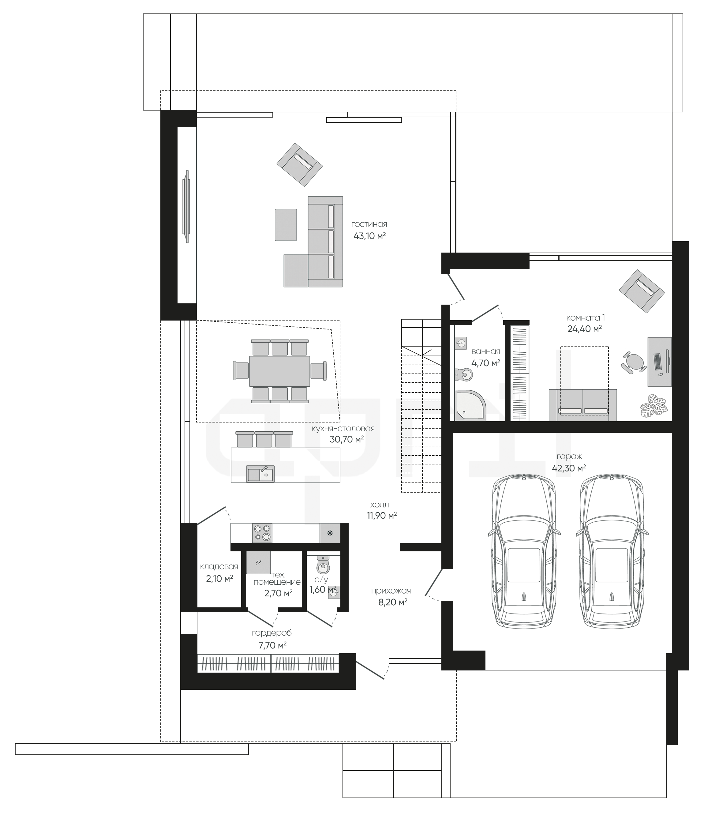 Проект двухэтажного дома с просторным гаражом, плоской крышей и террасой.