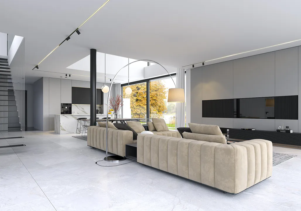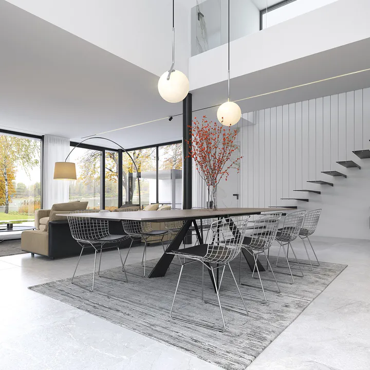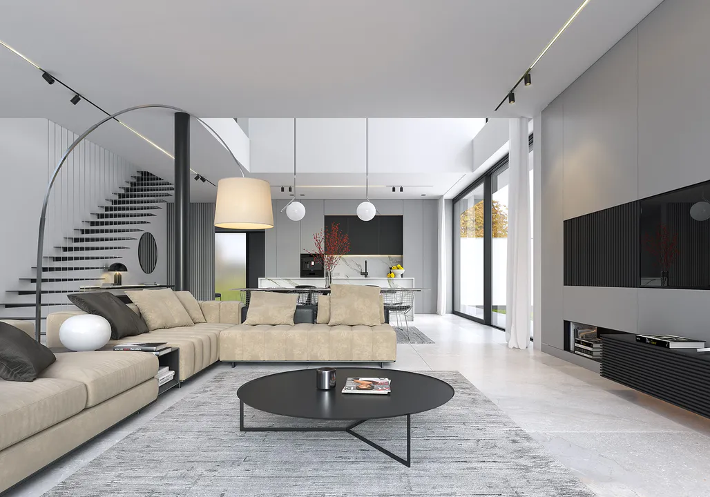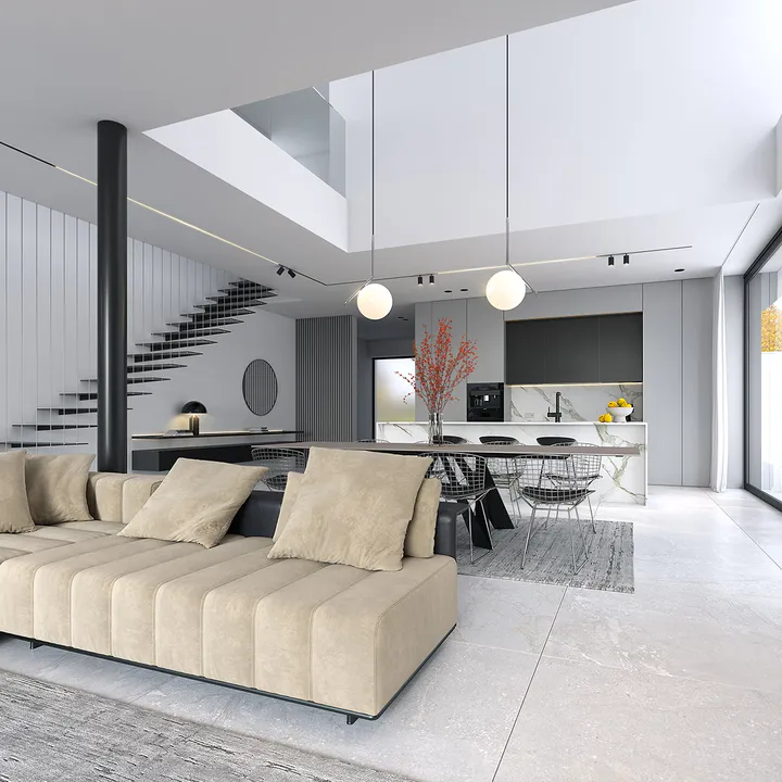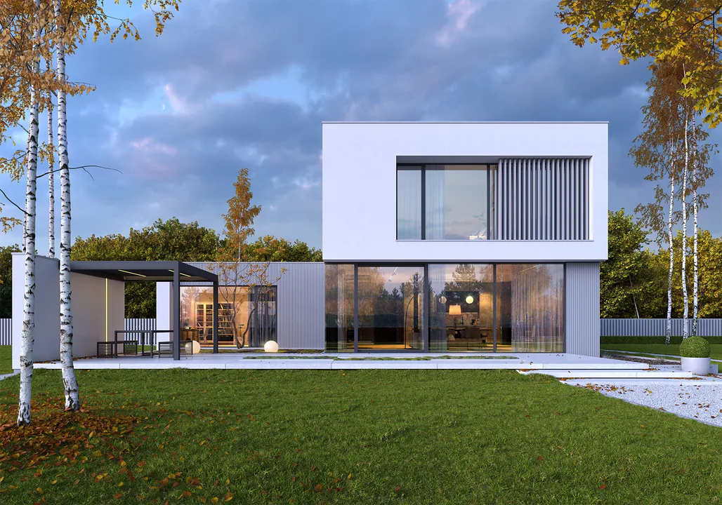 Дом имеет строгие геометрические формы, плоскую крышу и чистые линии, что является отличительной чертой современного минимализма.