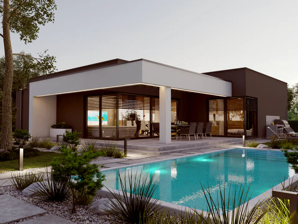 Проект отличается чистыми линиями, отсутствием скатной крыши и демонстрирует современный минималистский дизайн, сочетающий функциональность с эстетикой и создающий гармоничное пространство для жизни.