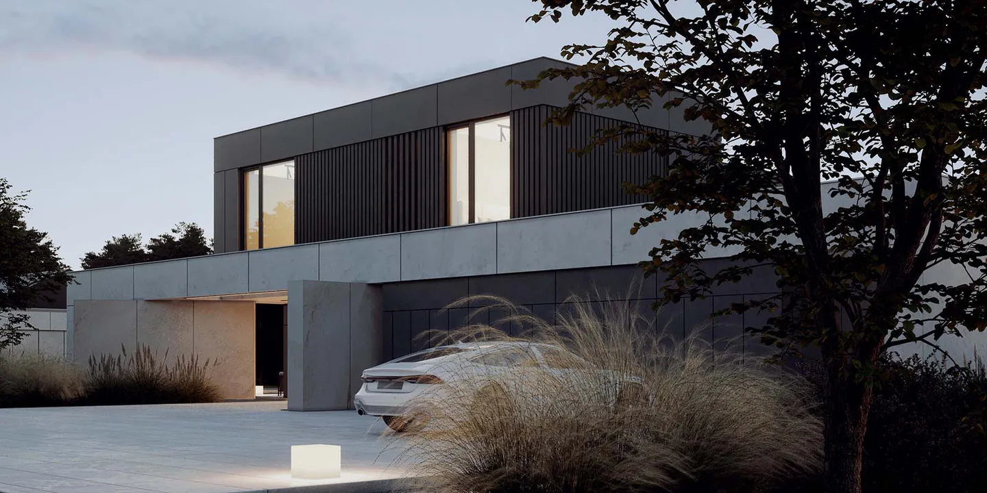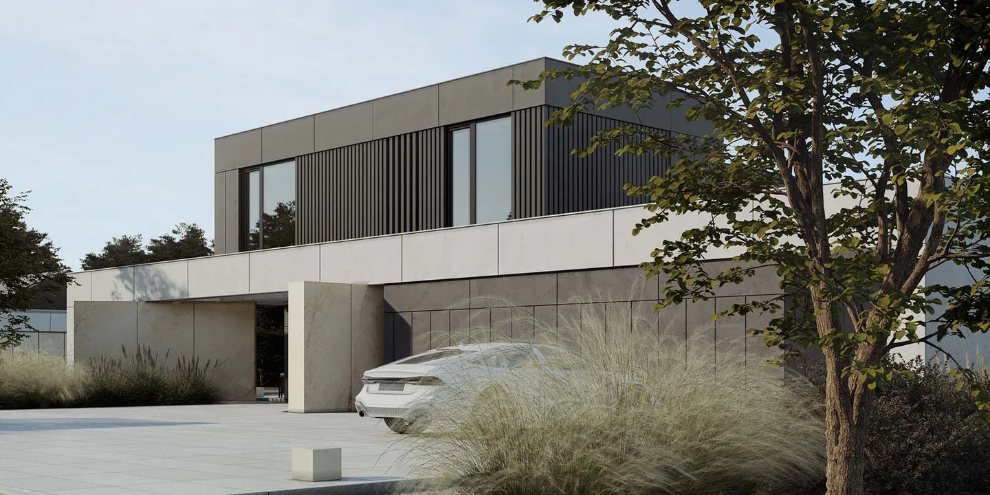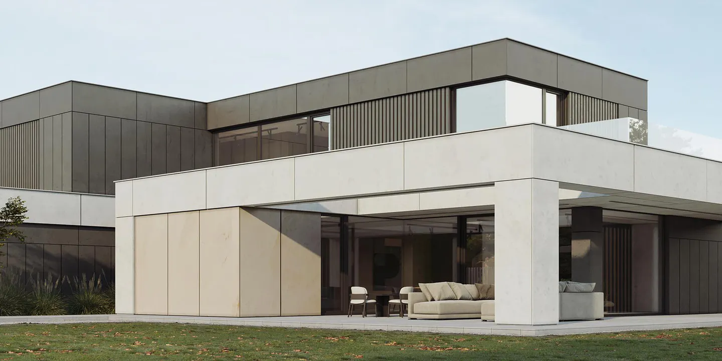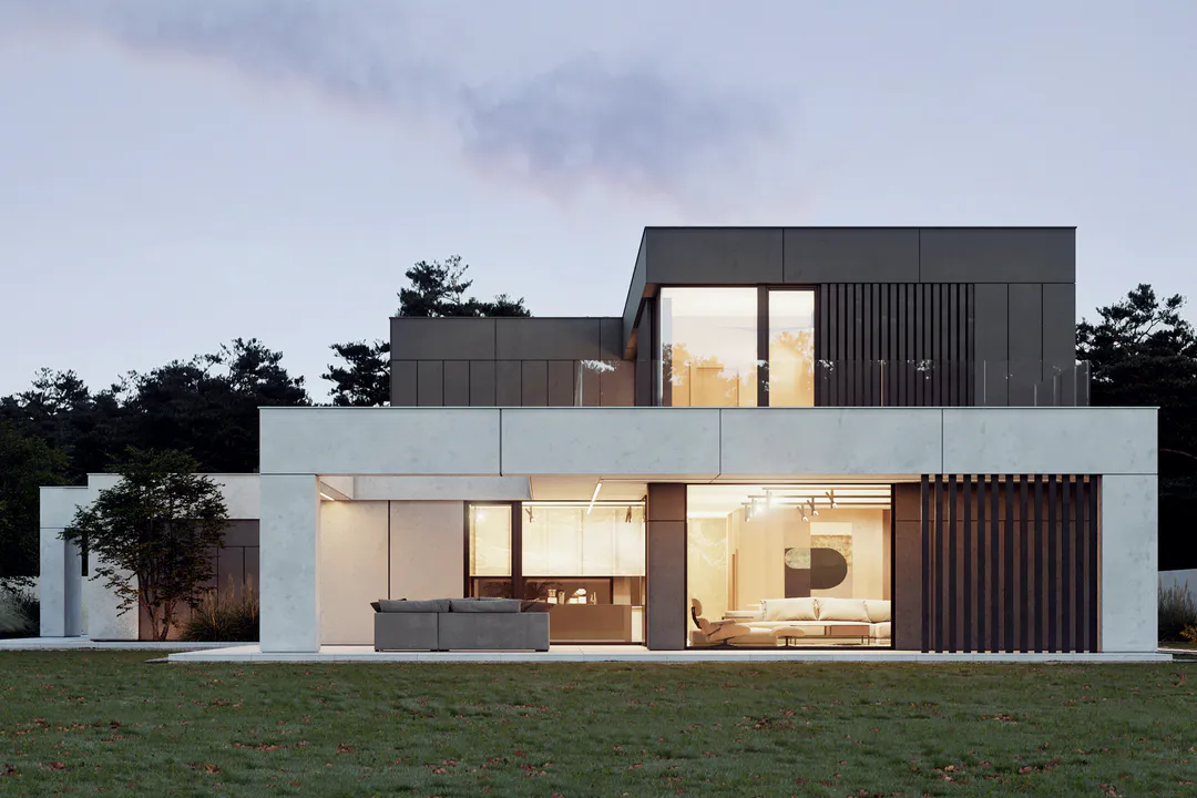 Дом состоит из нескольких прямоугольных объемов, умело скомбинированных для создания динамичной, но сбалансированной композиции.