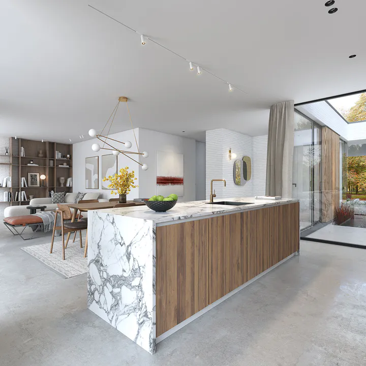 Фасад отделан белой клинкерной плиткой ручной формовки с элементами деревянных панелей, создающих контраст и добавляющих теплоту фасаду.