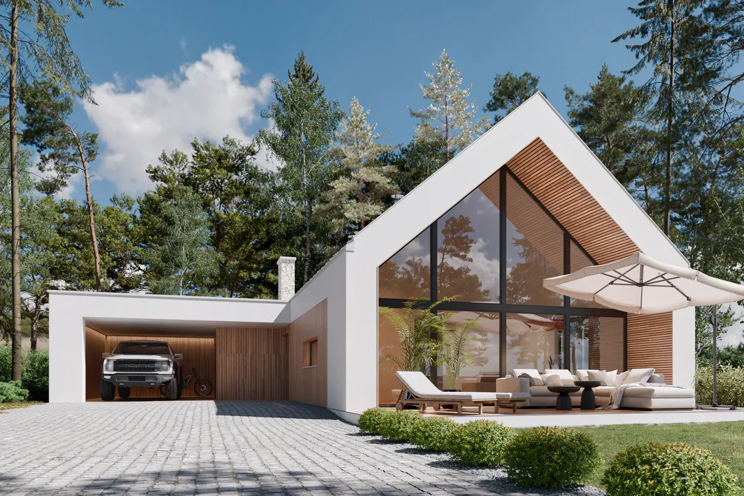 Отличительной особенностью дома является уникальная форма с крытым входом, предназначенным для парковки двух автомобилей и террасой за ней.