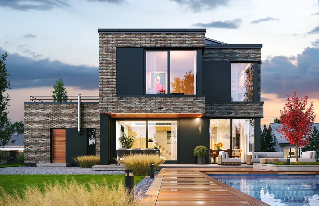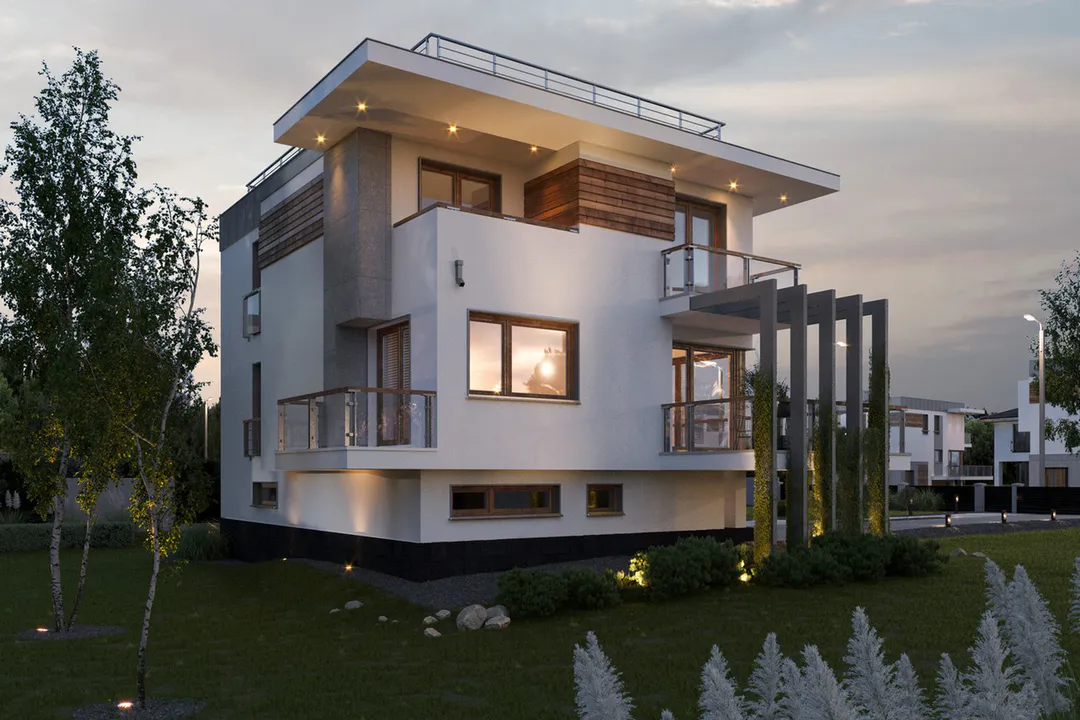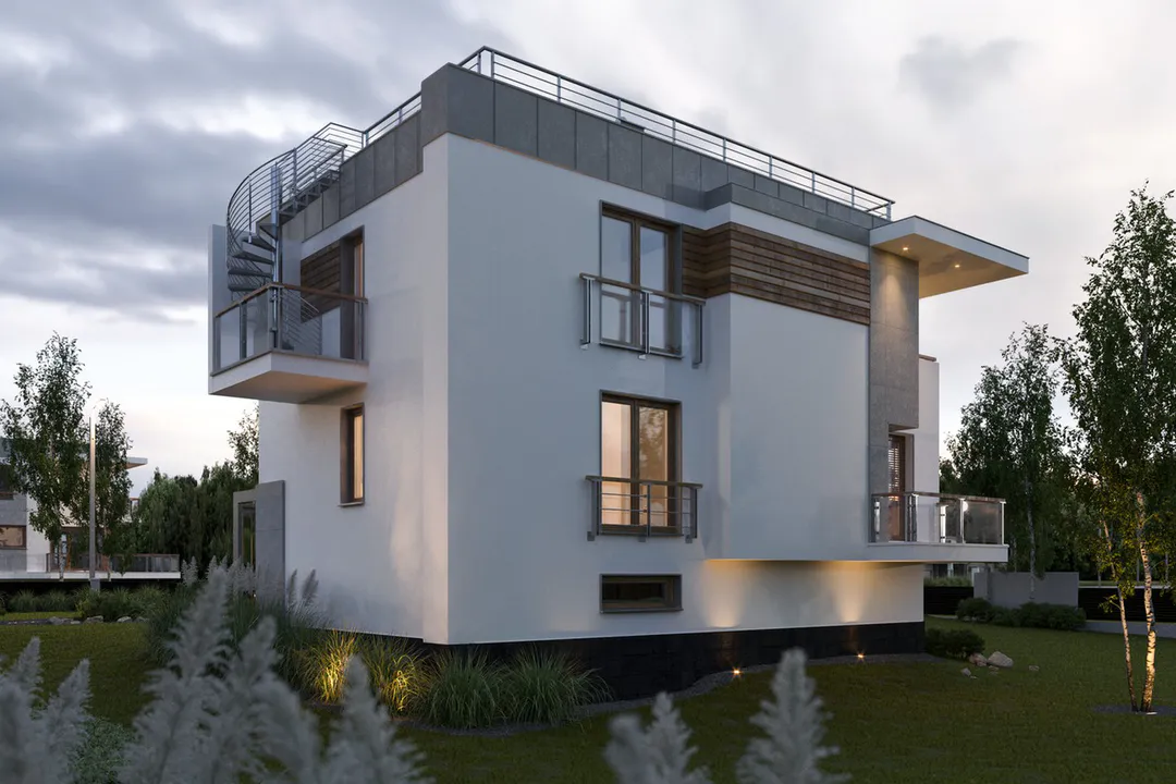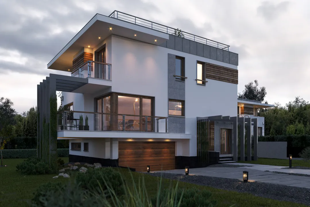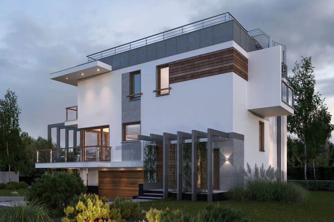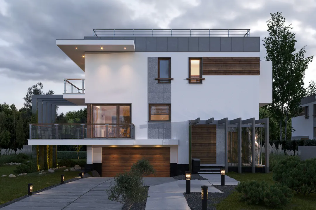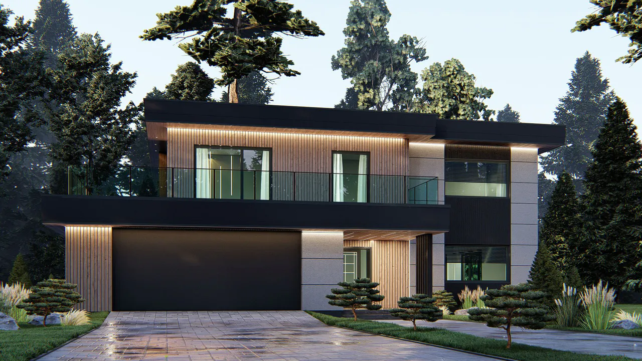 Дом выполнен в современном стиле Хайтек, характеризующемся чистыми линиями, большими окнами и использованием различных материалов, таких как штукатурка, дерево и бетон.