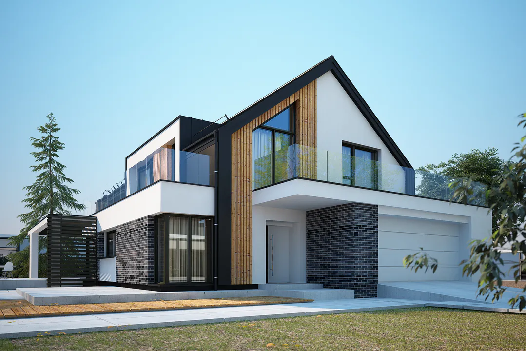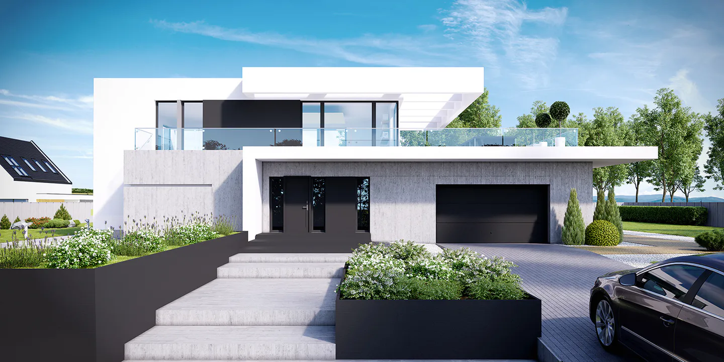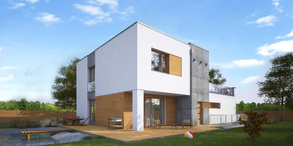 Дом в современном минималистичном стиле, характеризующийся чистыми линиями и простыми формами.