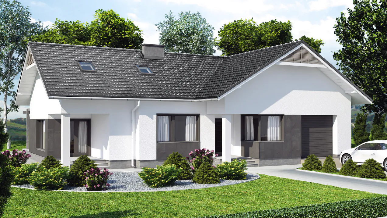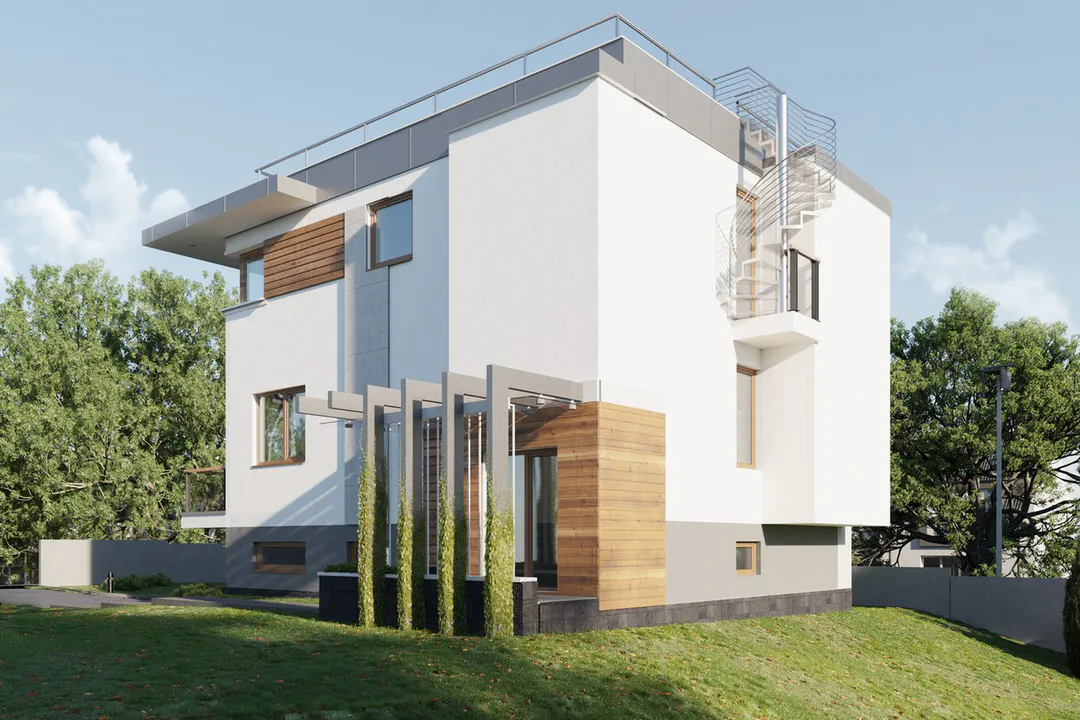 Дом спроектирован в современном стиле Хайтек, характеризующемся чистыми линиями, минималистичным дизайном и использованием контрастных материалов, таких как светлые оштукатуренные поверхности, деревянные элементы и серые акценты из камня.