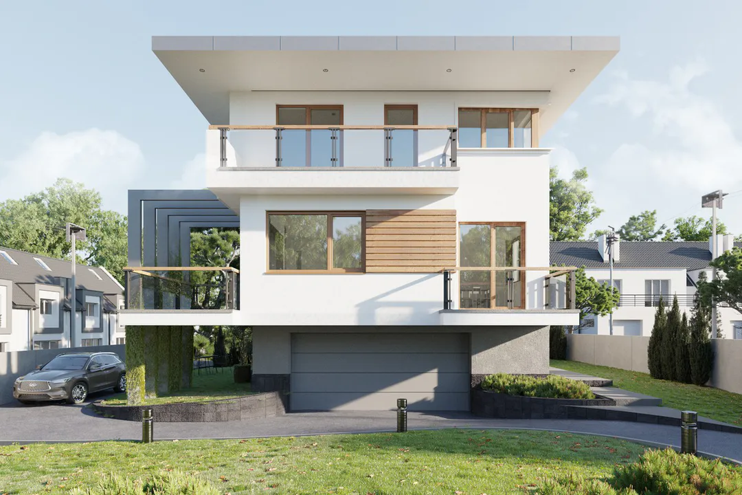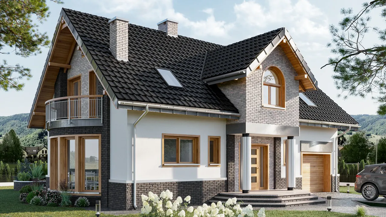 Наличие балконов, эксплуатируемой плоской крыши и гаража, интегрированного в цокольный этаж, повышает функциональность жилого пространства.