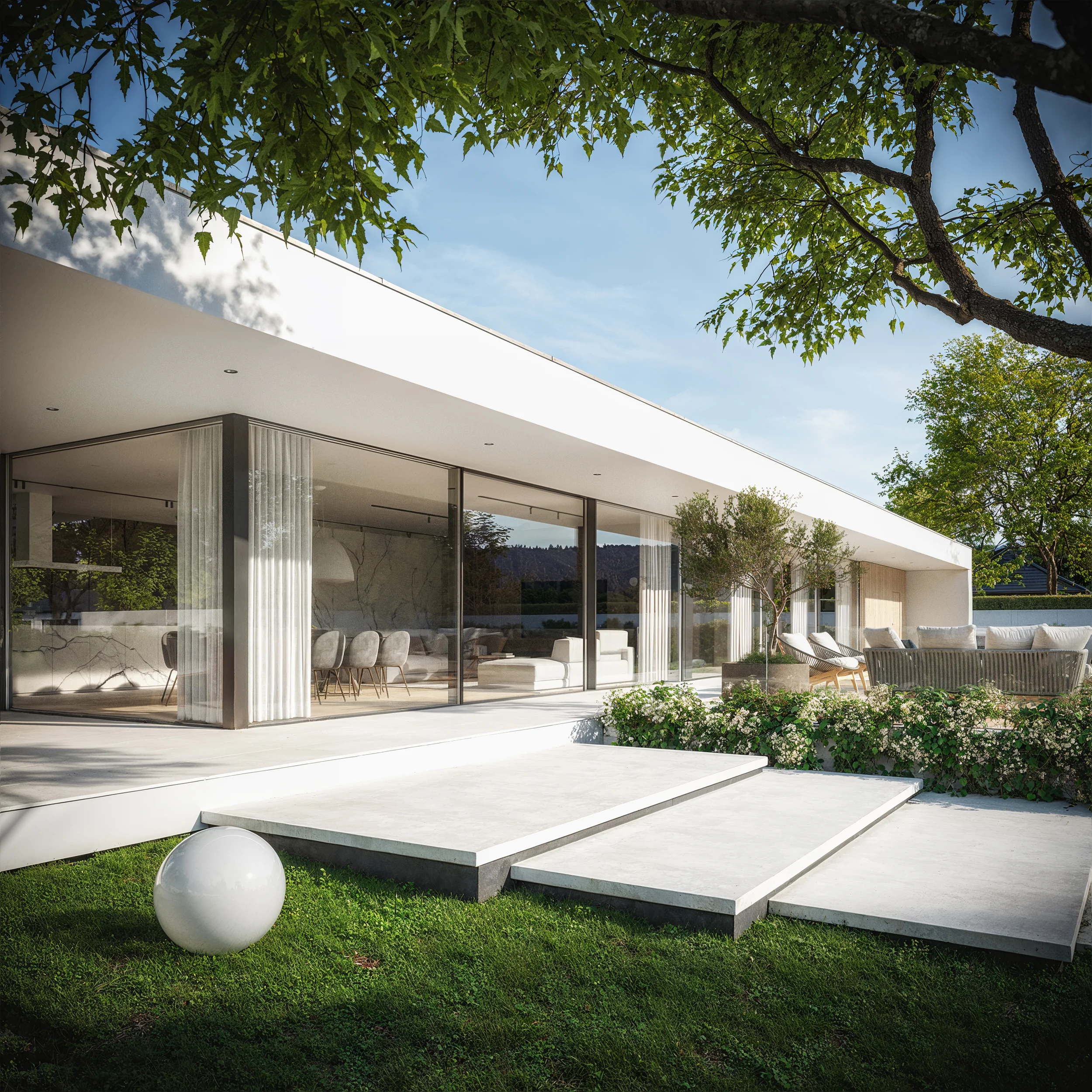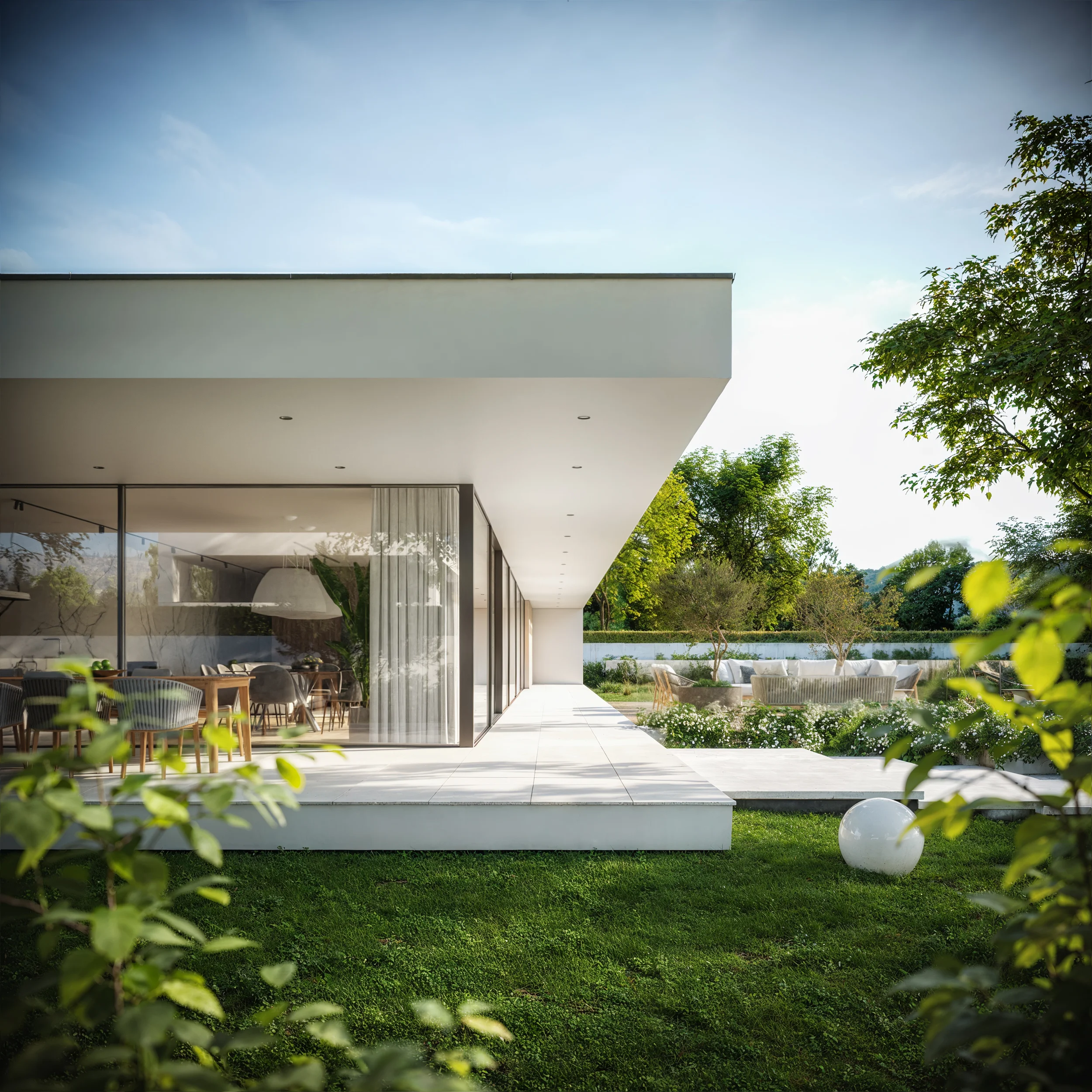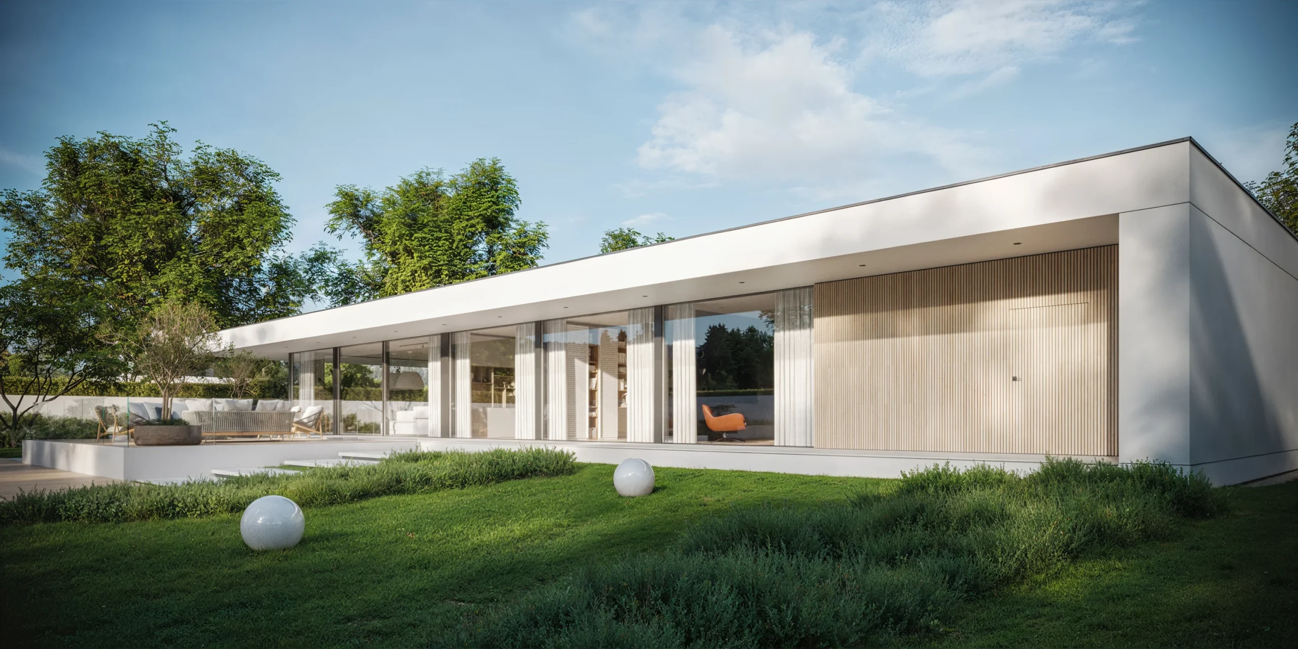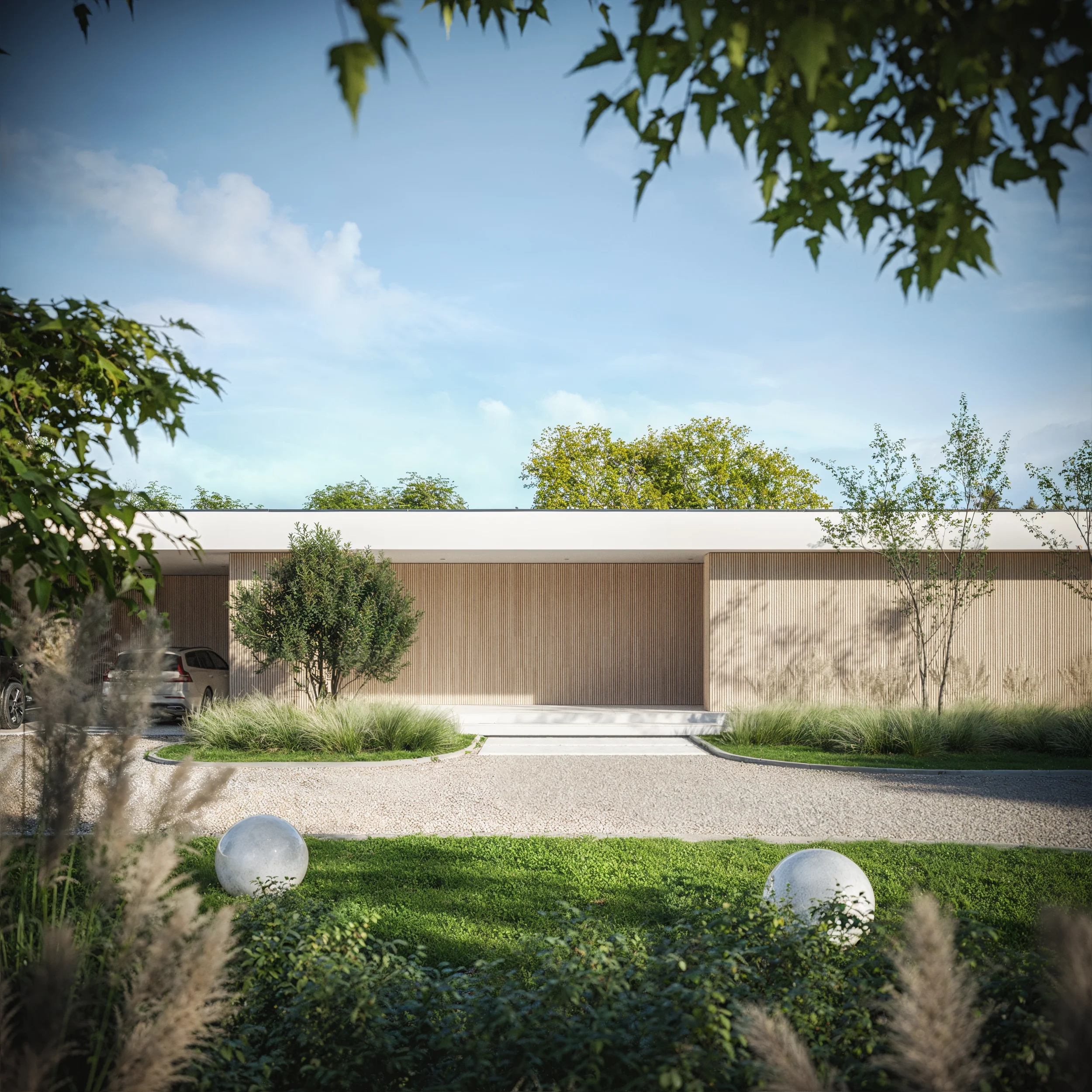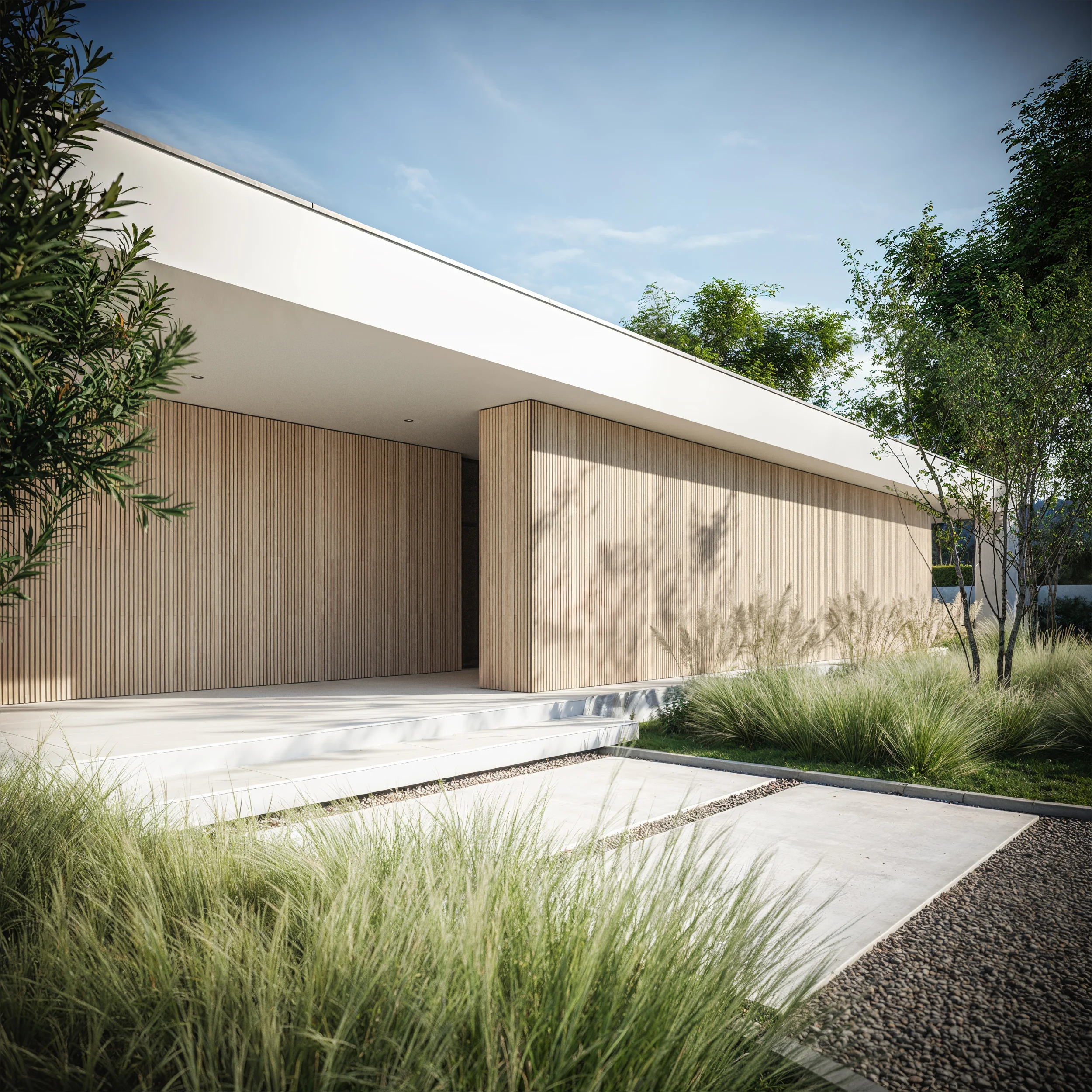 Фасад дома сочетает в себе светлые оштукатуренные поверхности с теплыми деревянными панелями, создавая приятный контраст текстур и оттенков. Большие панорамные окна со стороны террасы позволяют максимально использовать естественное освещение и добавляют современности.