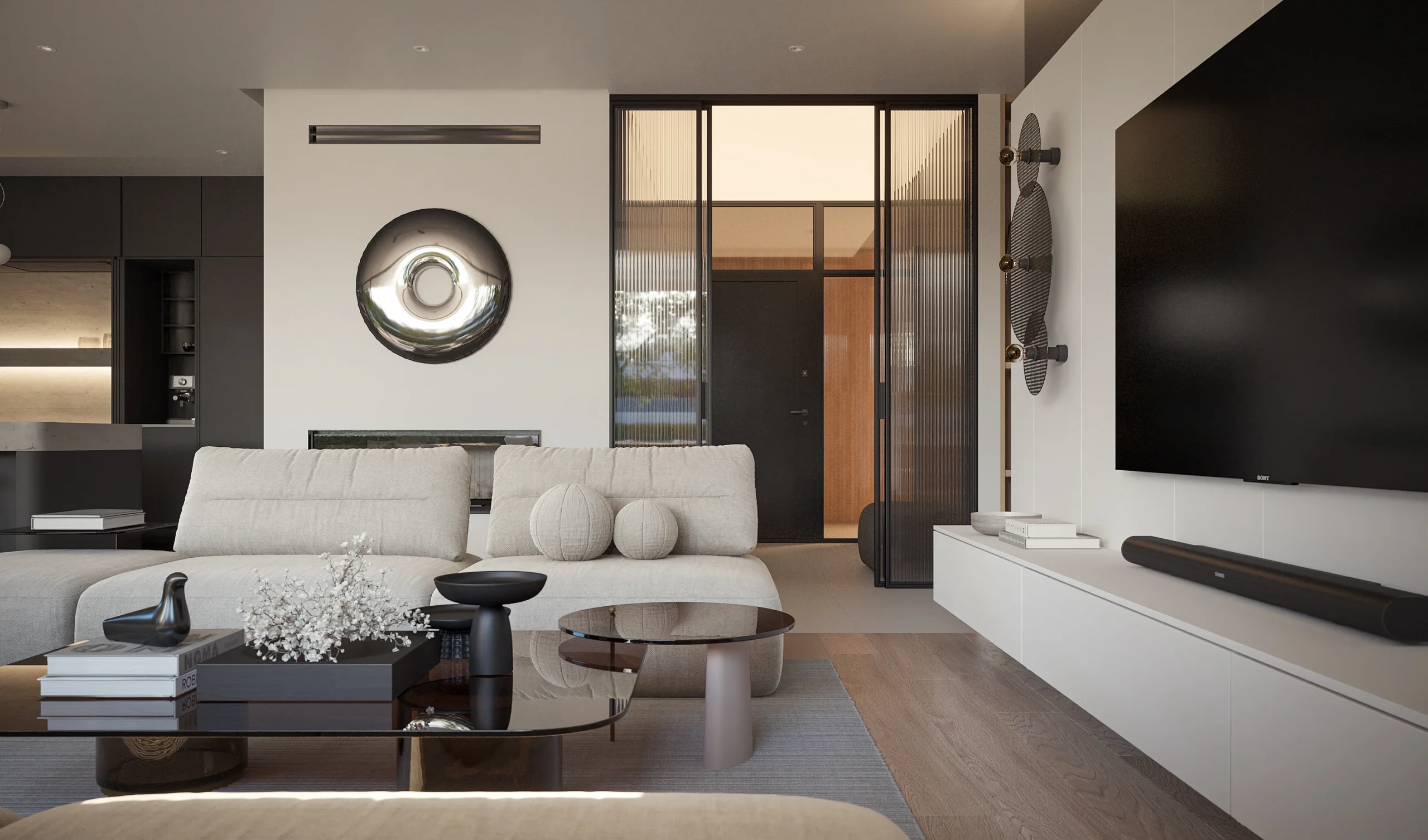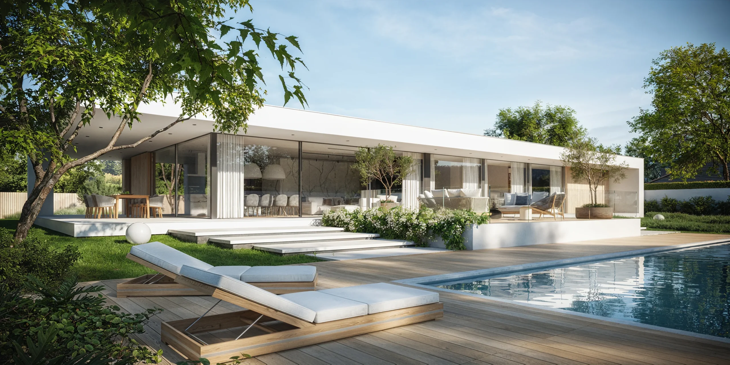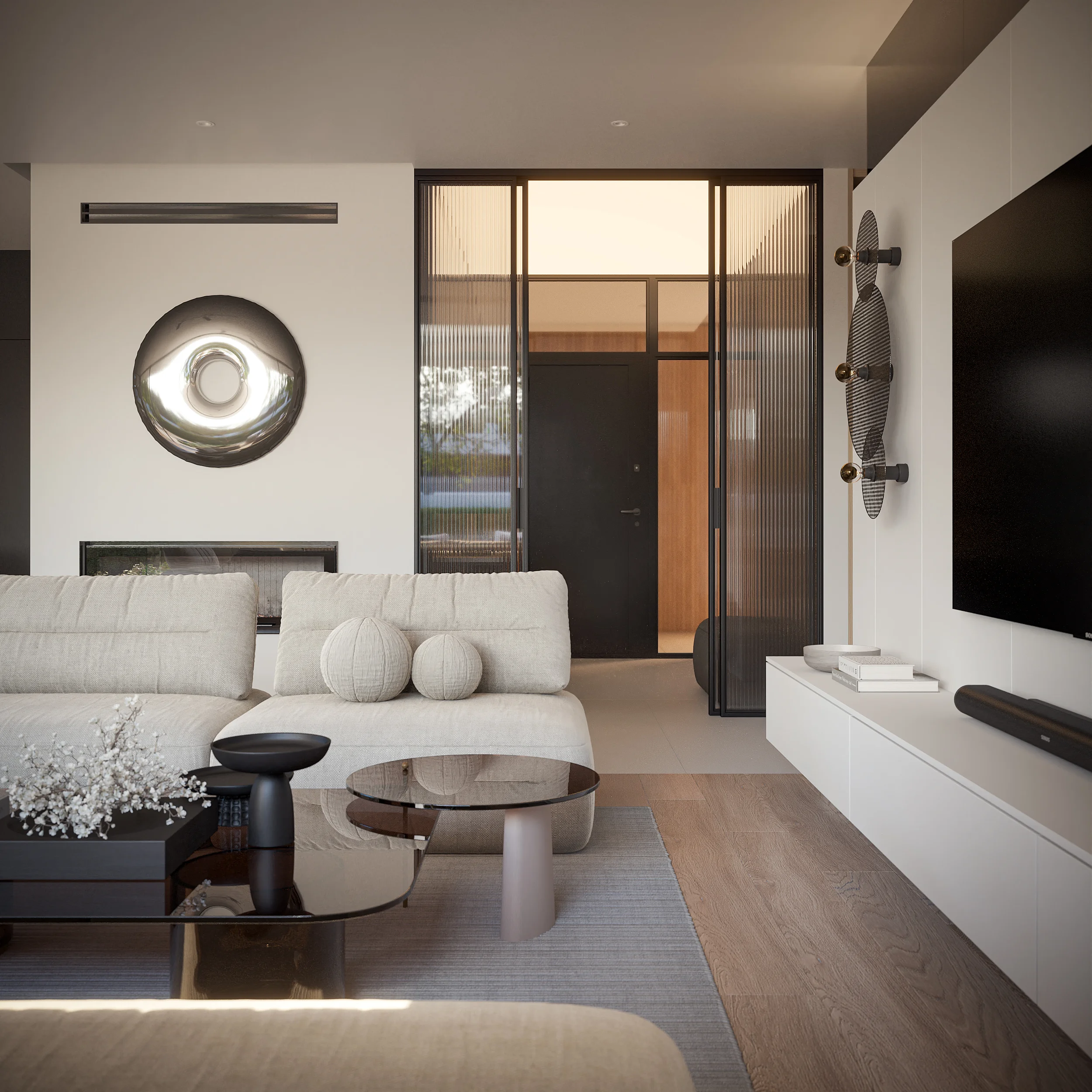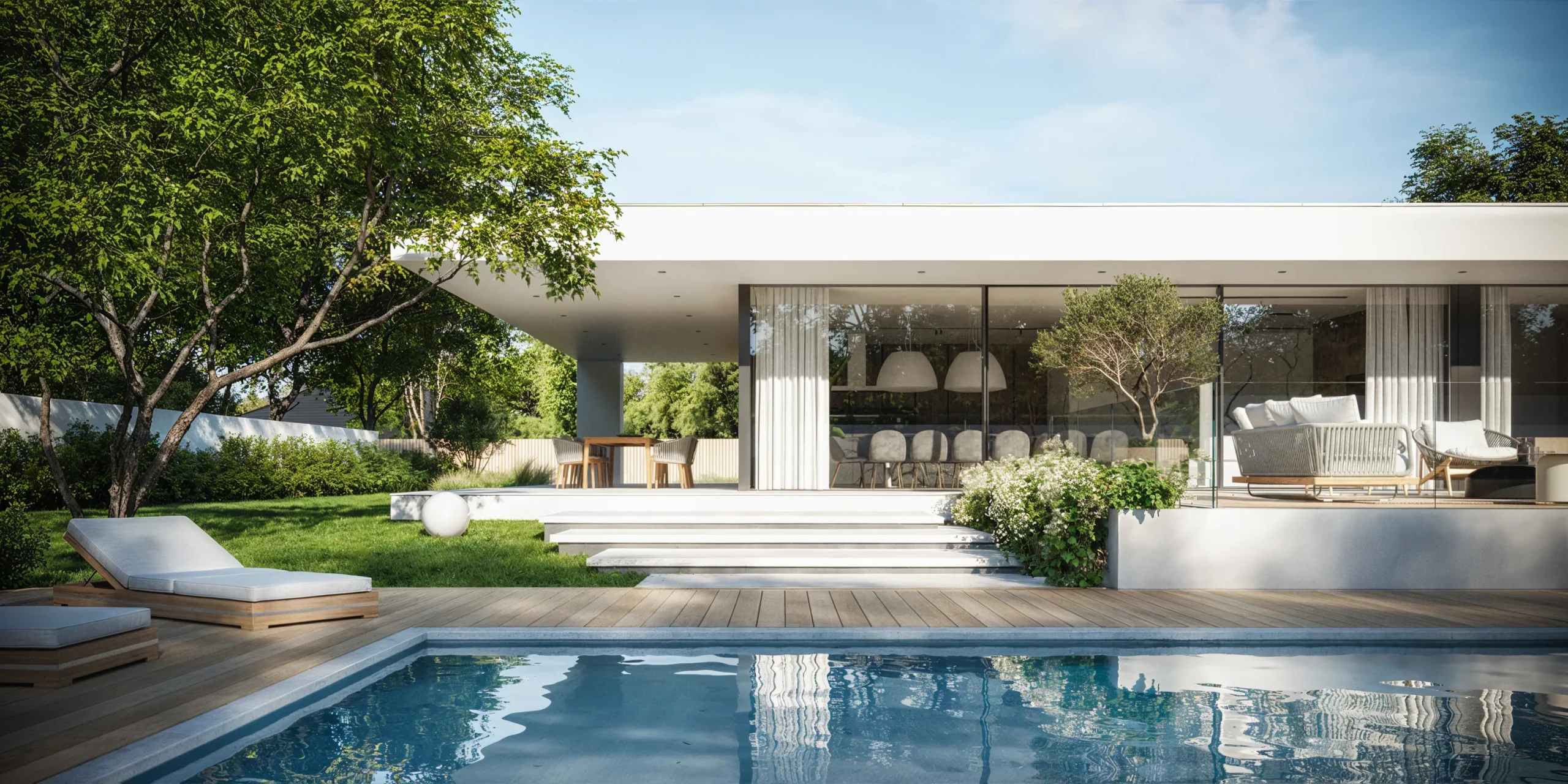 Фасад дома сочетает в себе светлые оштукатуренные поверхности с теплыми деревянными панелями, создавая приятный контраст текстур и оттенков. Большие панорамные окна со стороны террасы позволяют максимально использовать естественное освещение и добавляют современности.