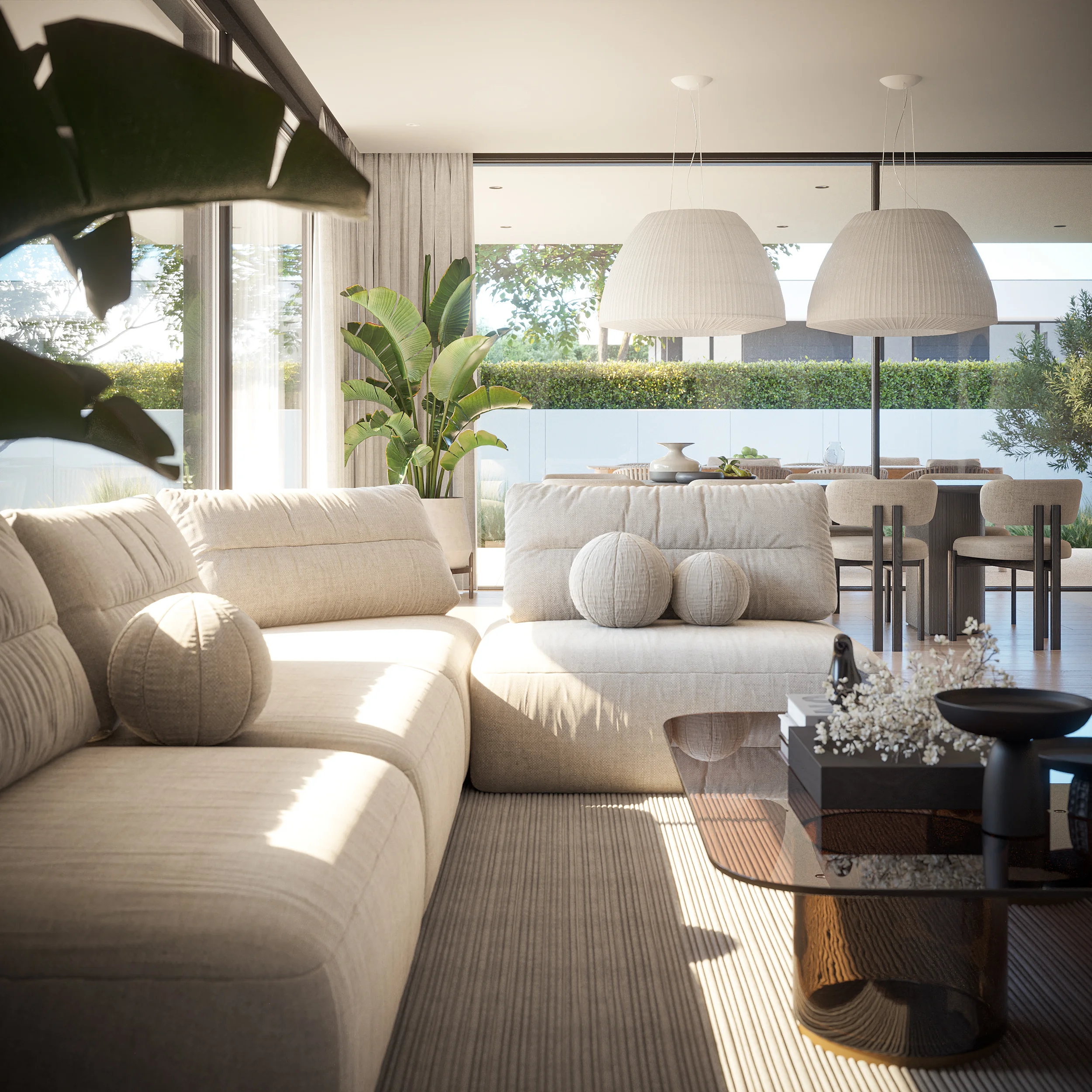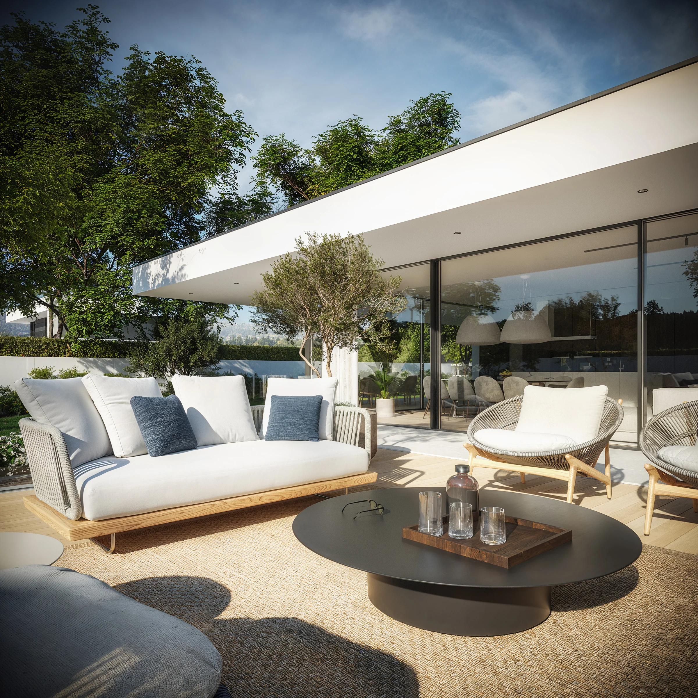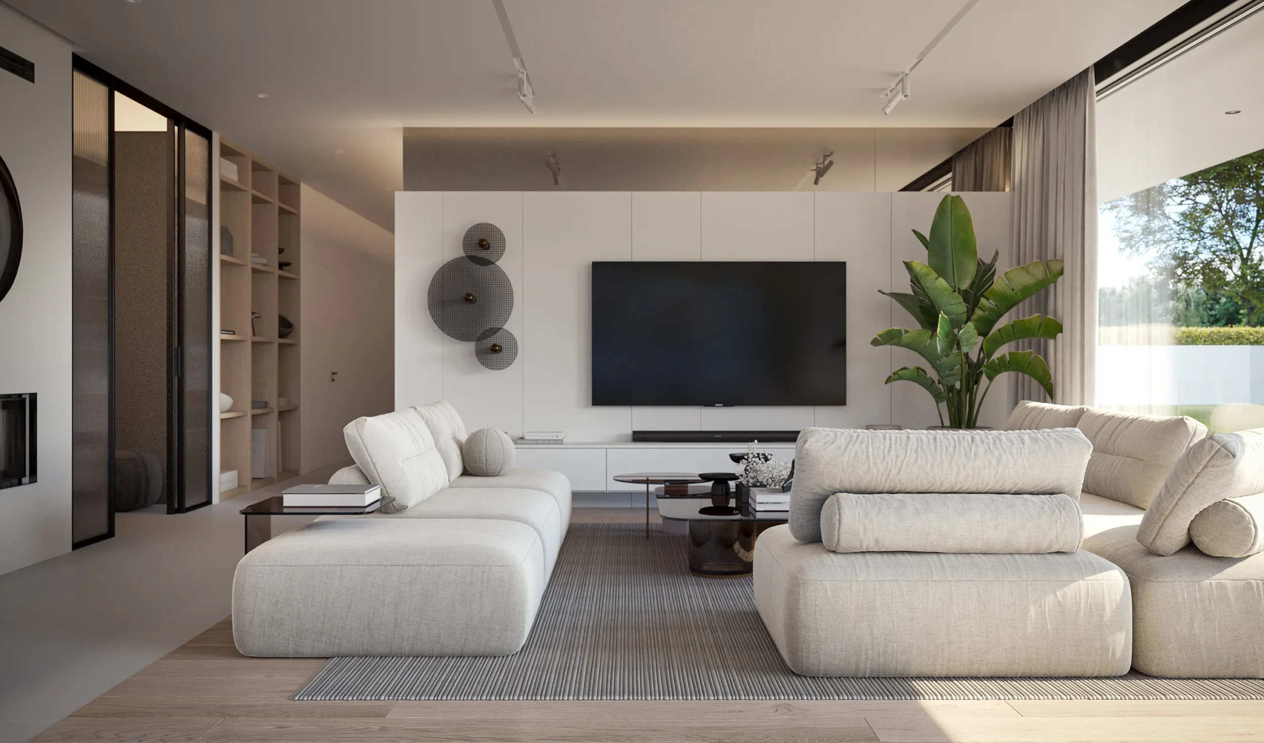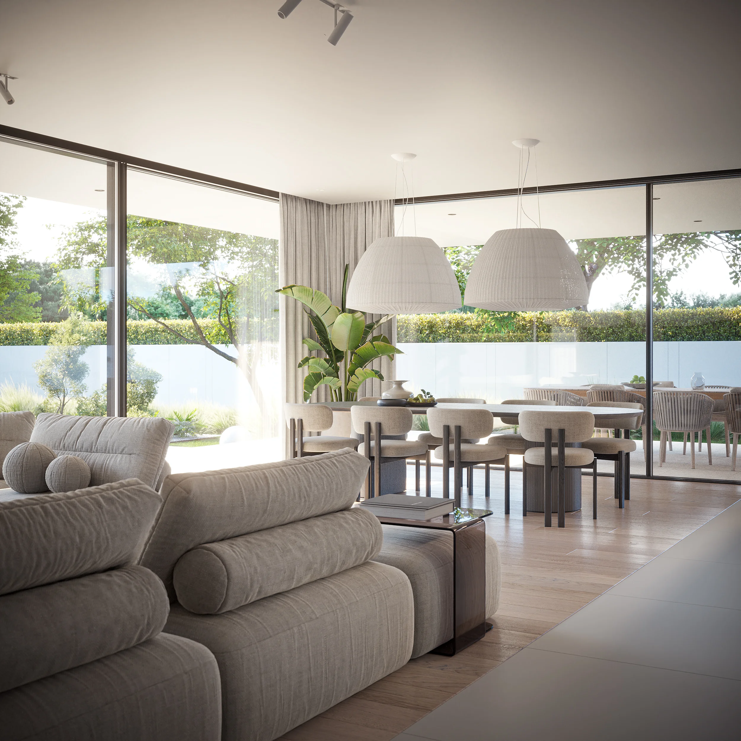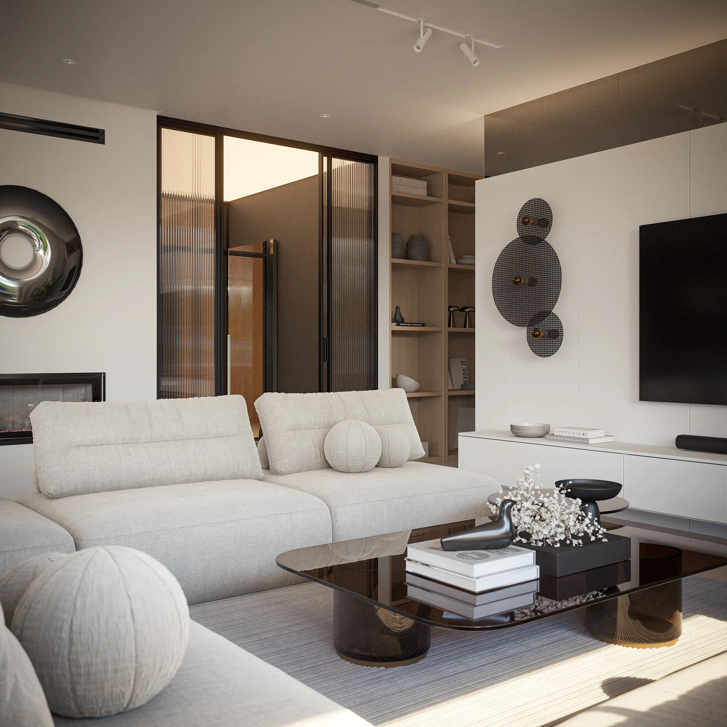 Фасад дома сочетает в себе светлые оштукатуренные поверхности с теплыми деревянными панелями, создавая приятный контраст текстур и оттенков. Большие панорамные окна со стороны террасы позволяют максимально использовать естественное освещение и добавляют современности.