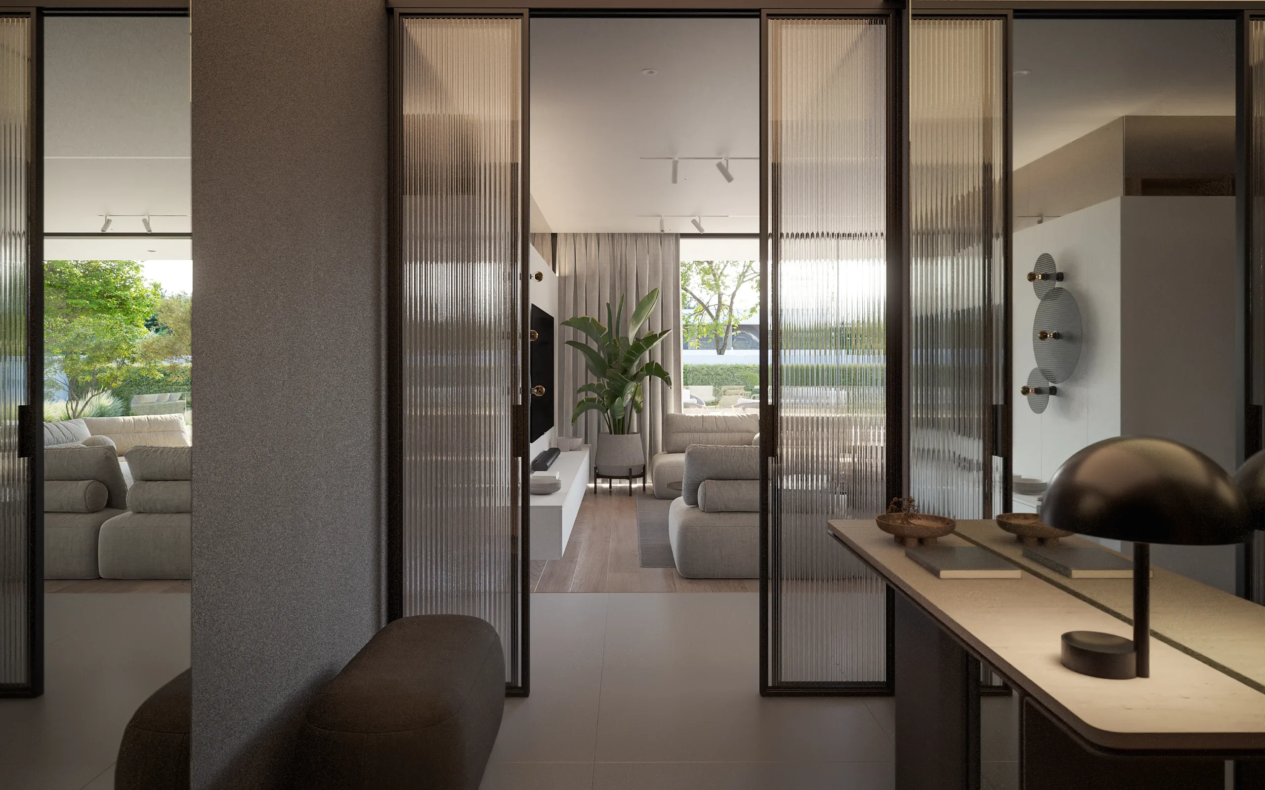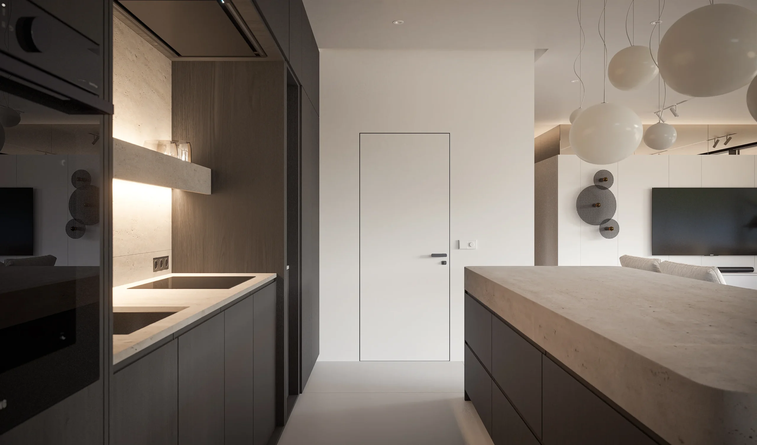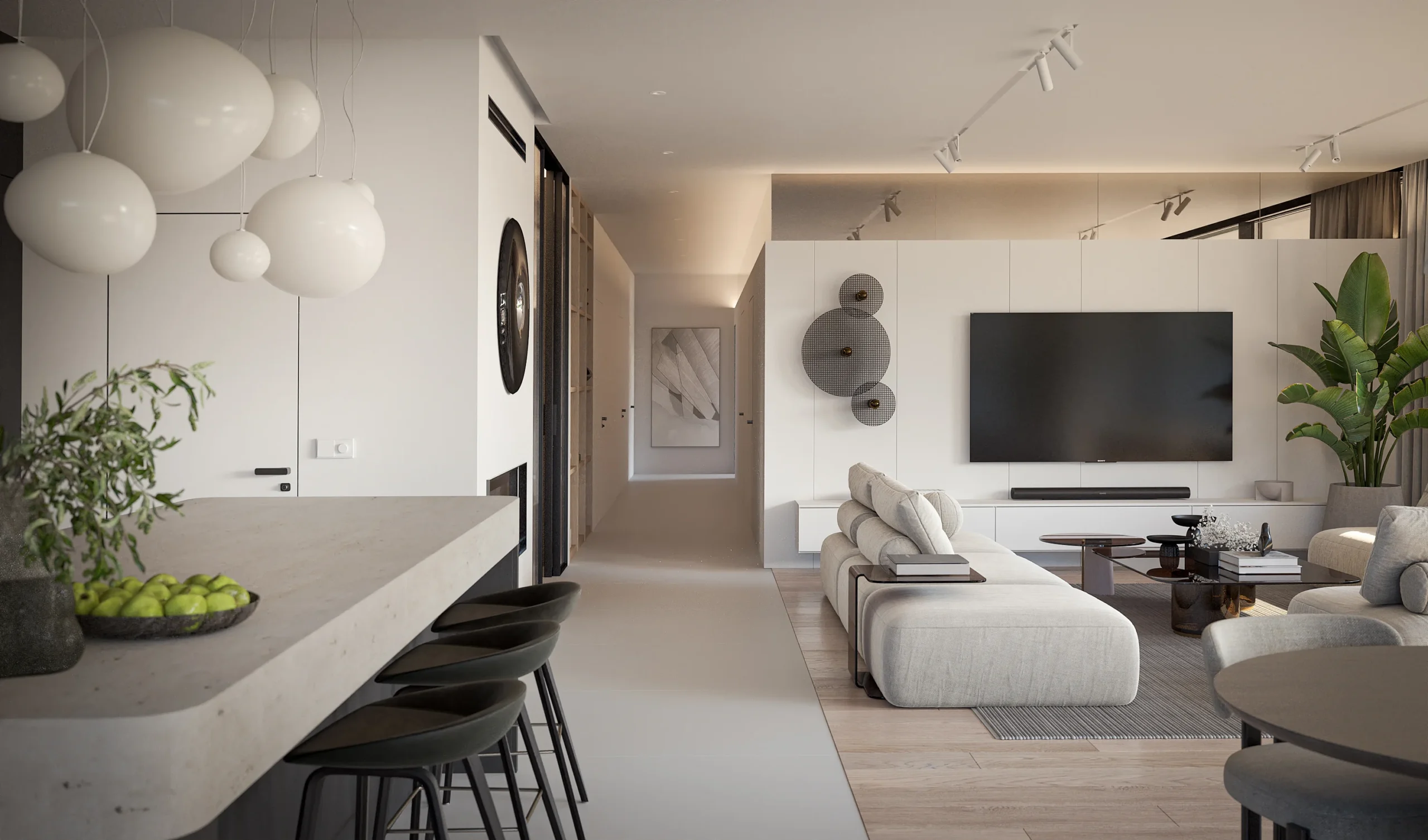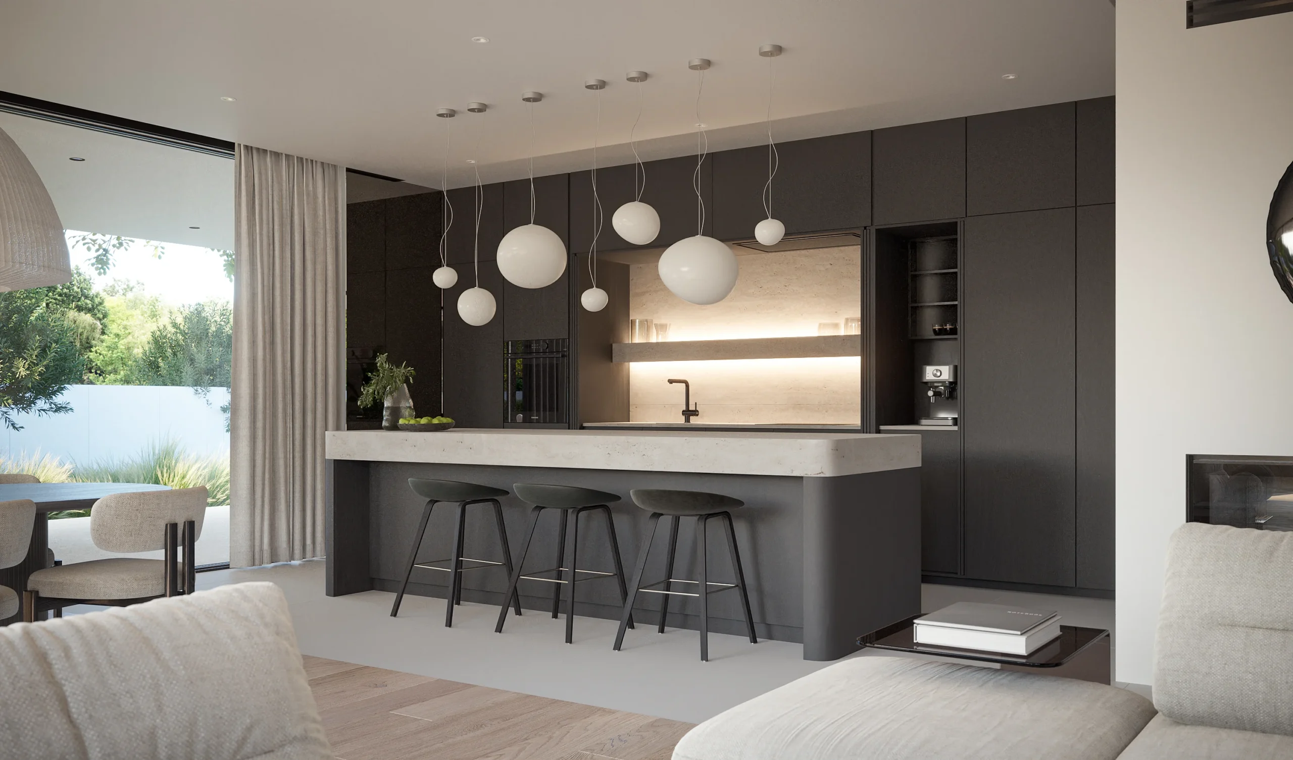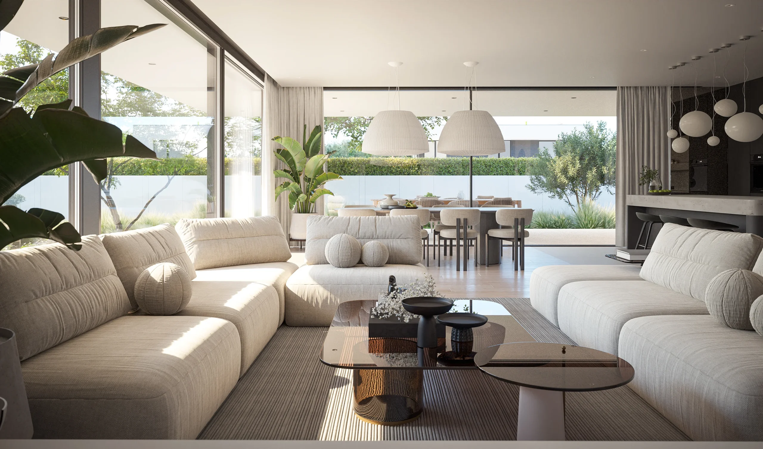 Фасад дома сочетает в себе светлые оштукатуренные поверхности с теплыми деревянными панелями, создавая приятный контраст текстур и оттенков. Большие панорамные окна со стороны террасы позволяют максимально использовать естественное освещение и добавляют современности.