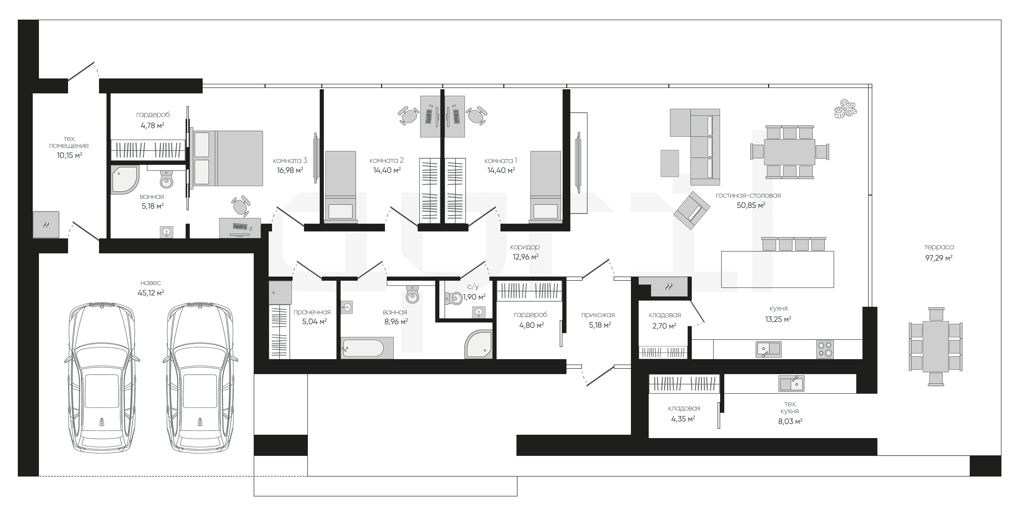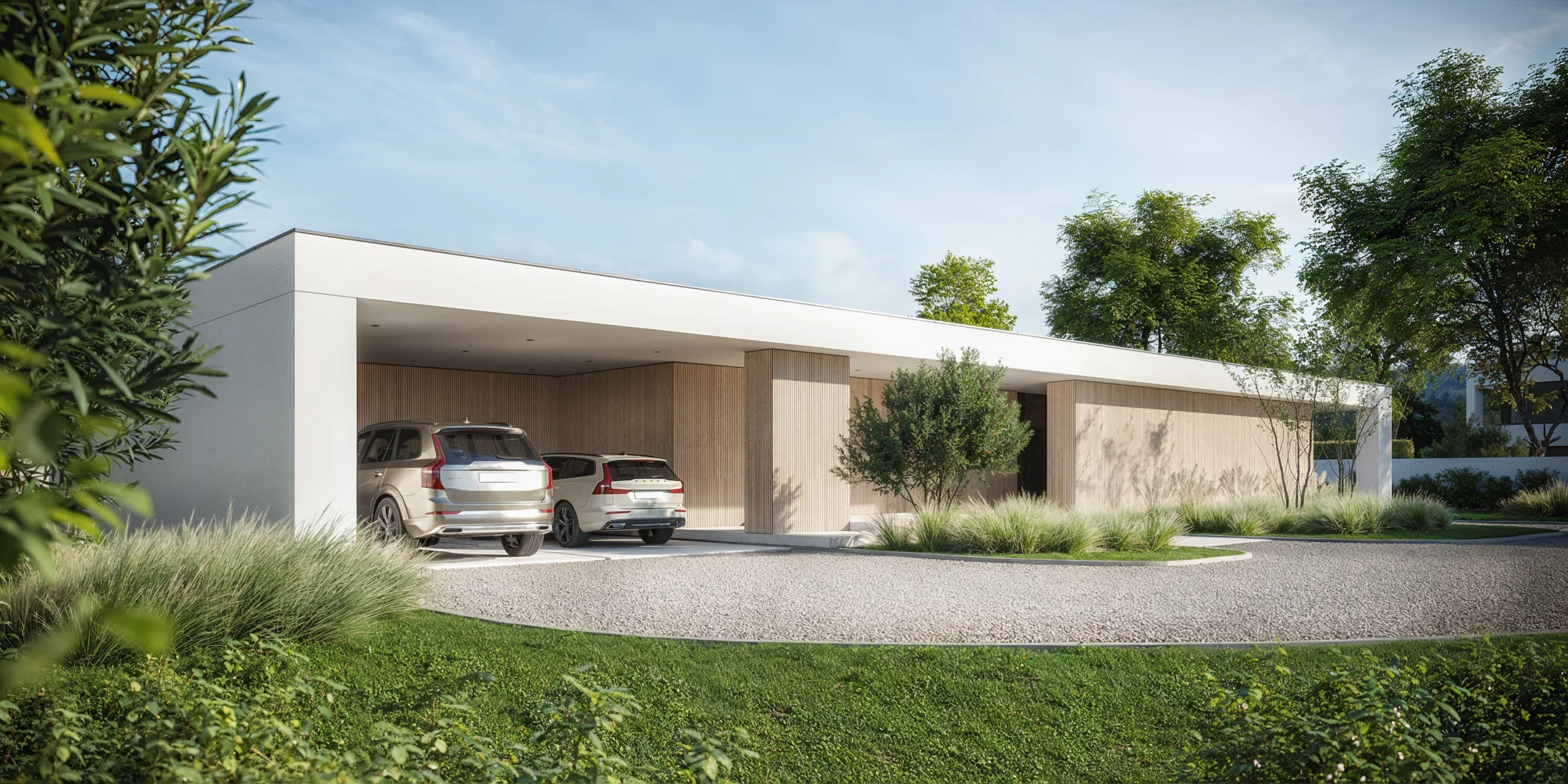 Проект современного одноэтажного дома с плоской крышей, гаражом и террасой.
