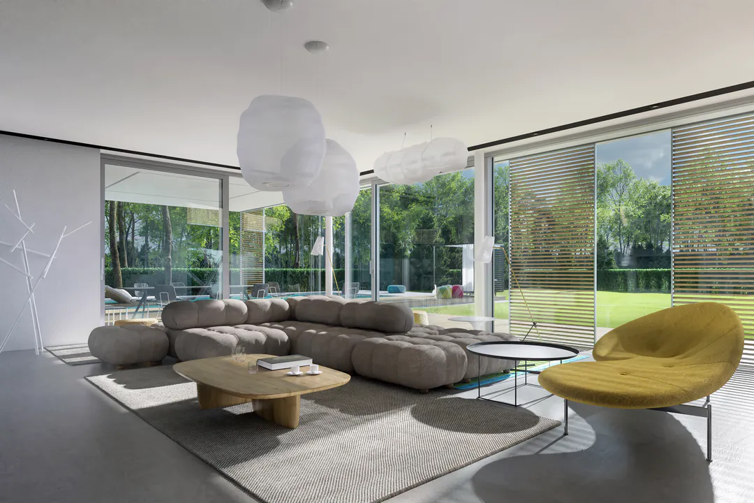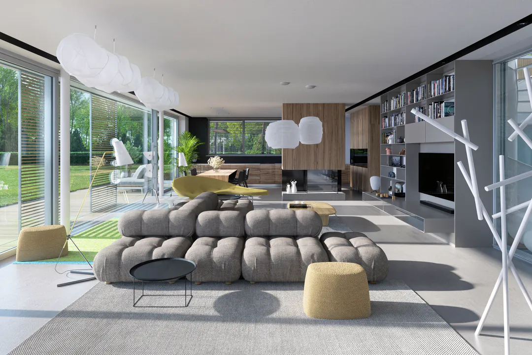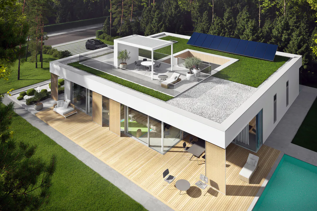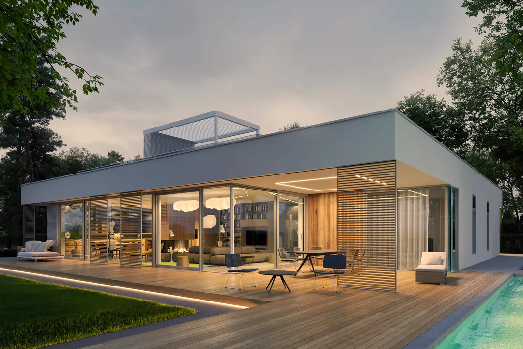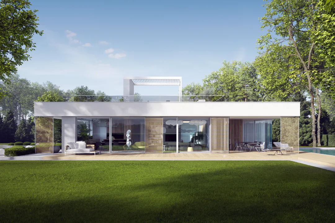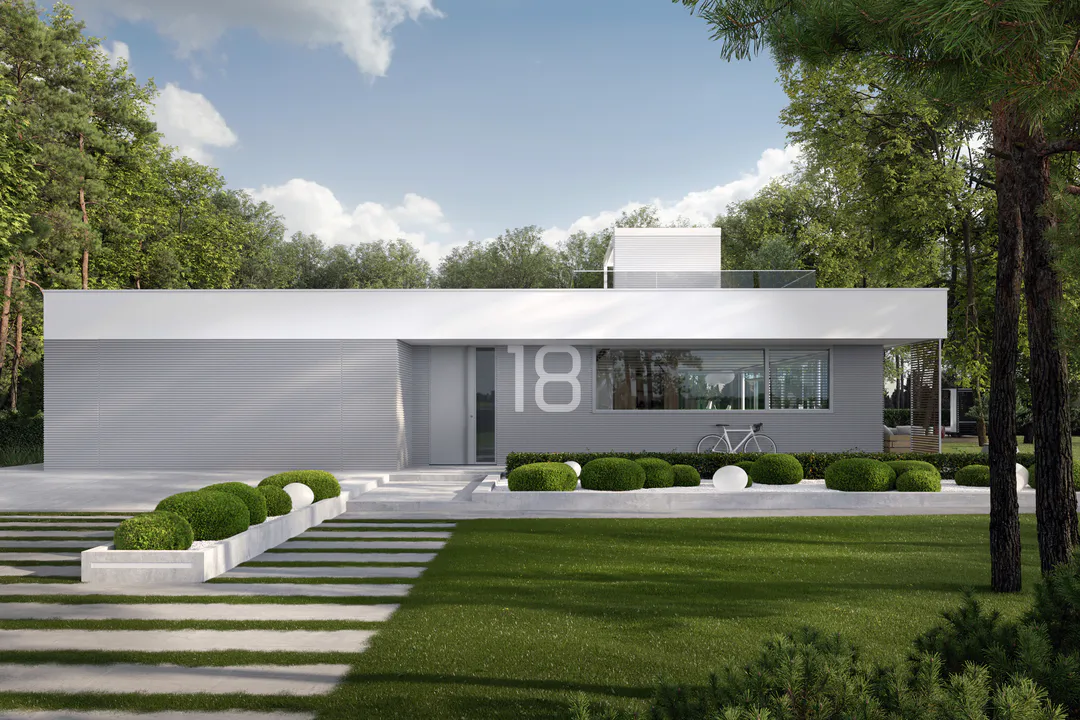 Дом имеет минималистичный дизайн с большими окнами, плоской крышей и преимущественно серой цветовой гаммой.