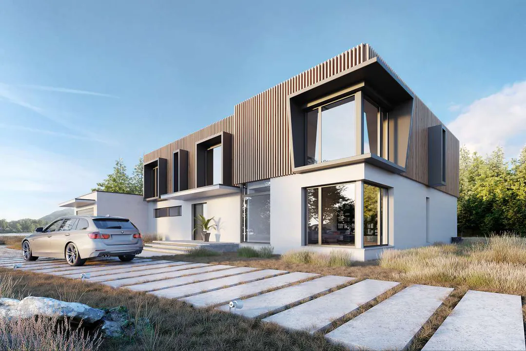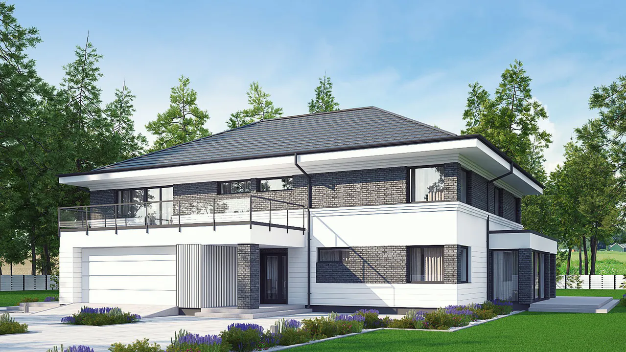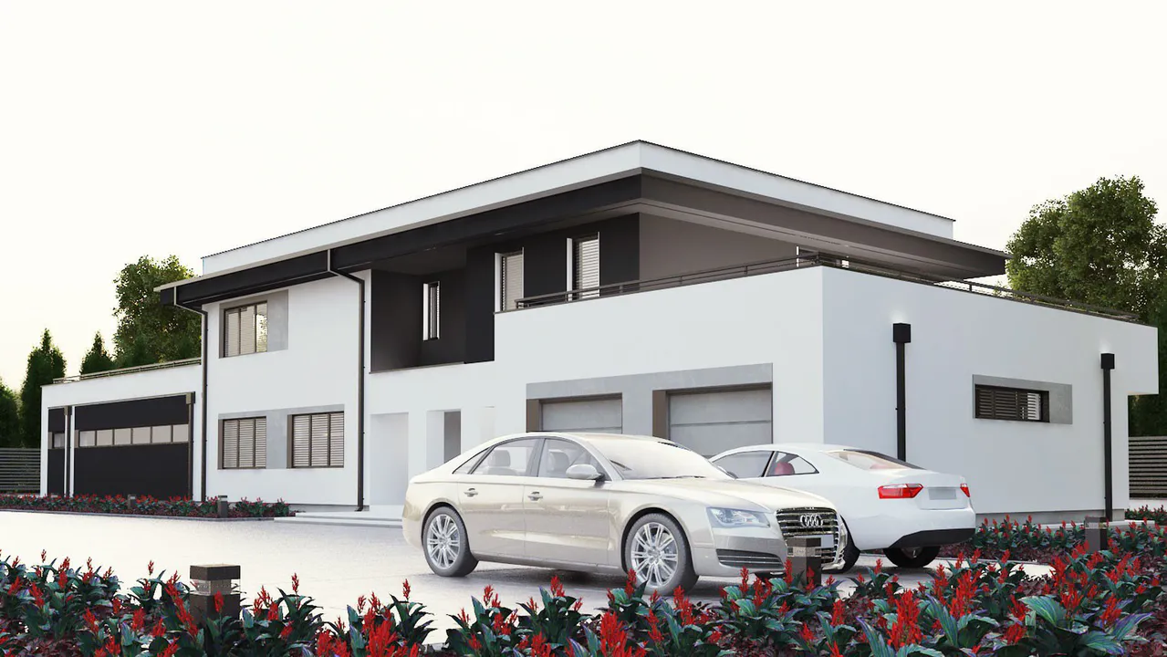 Проект трехэтажного современного двухквартирного дома с гаражом и террасой.