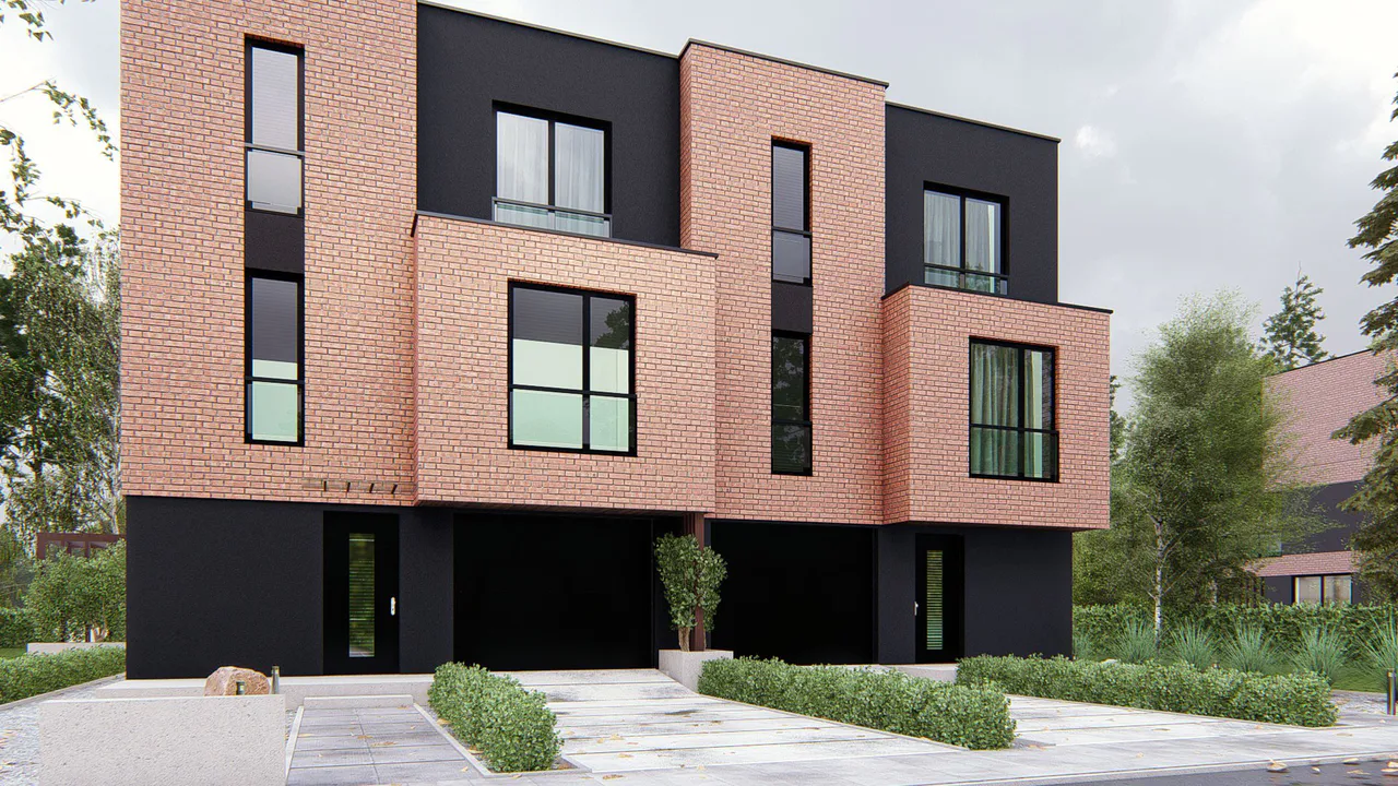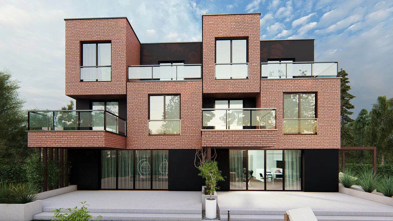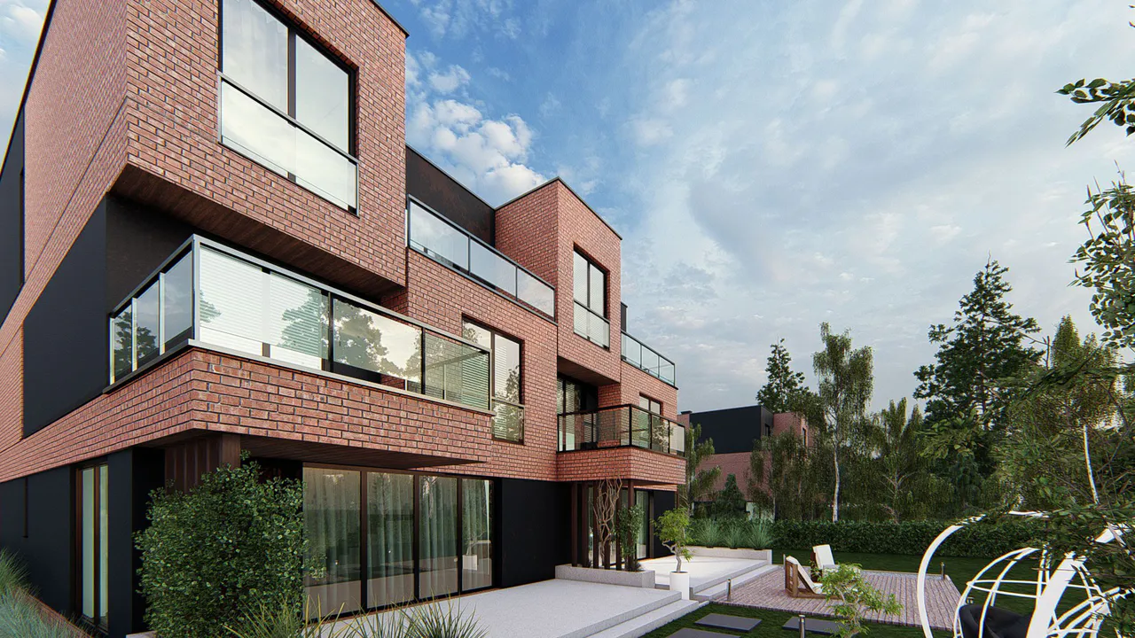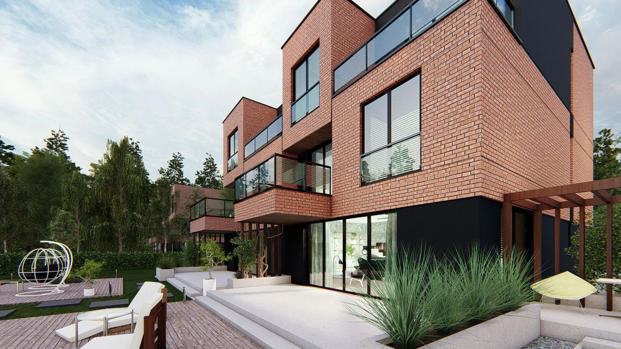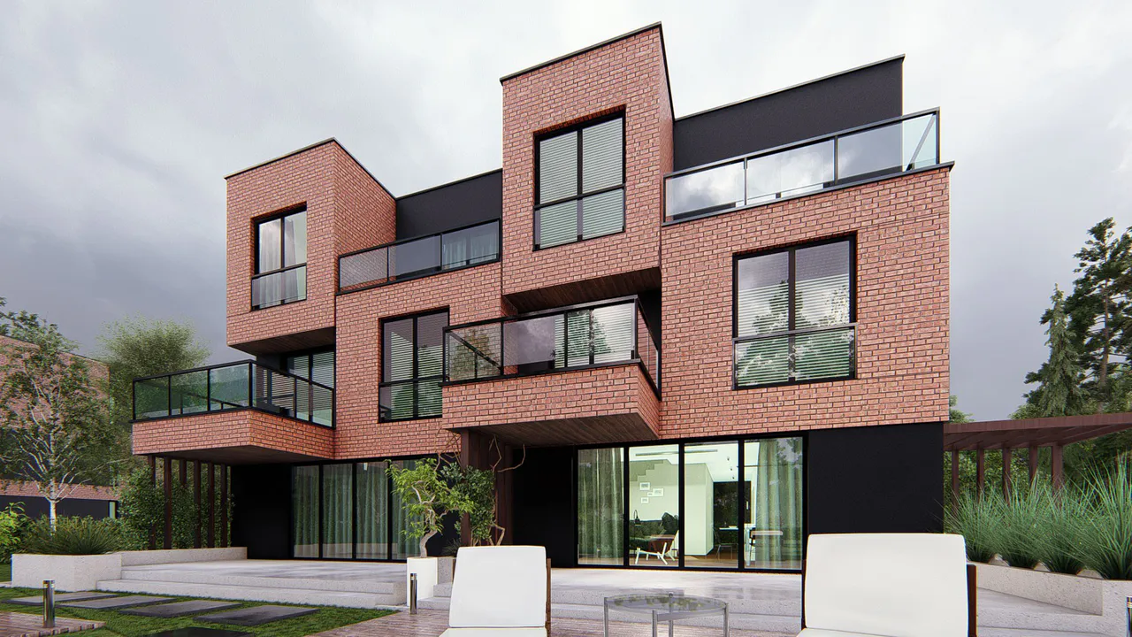 Фасад облицован терракотовым кирпичом, придающим зданию теплоту и текстуру, в то время как темные акценты штукатурки создают четкие линии и подчеркивают геометрию объемов.