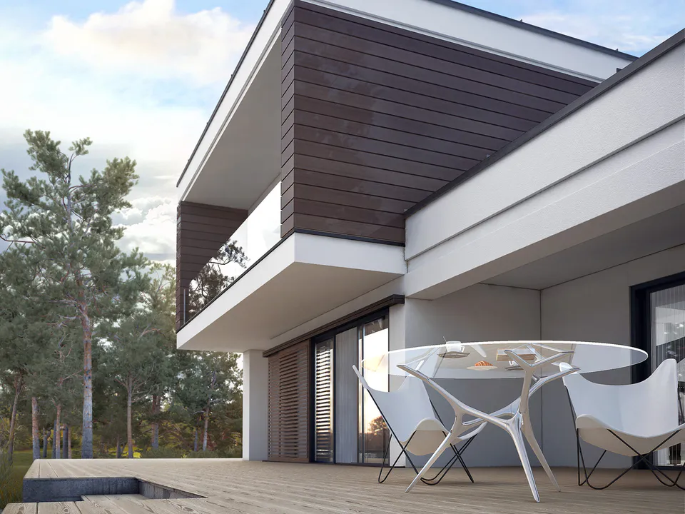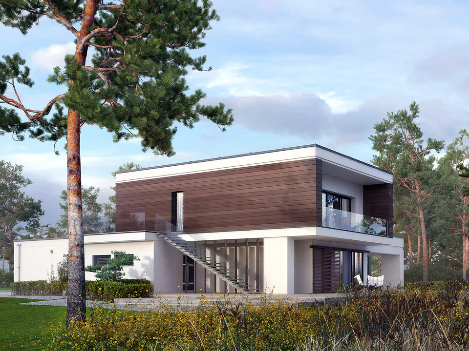 Проект двухэтажного дома в стиле Хайтек с плоской крышей, террасой и гаражом.