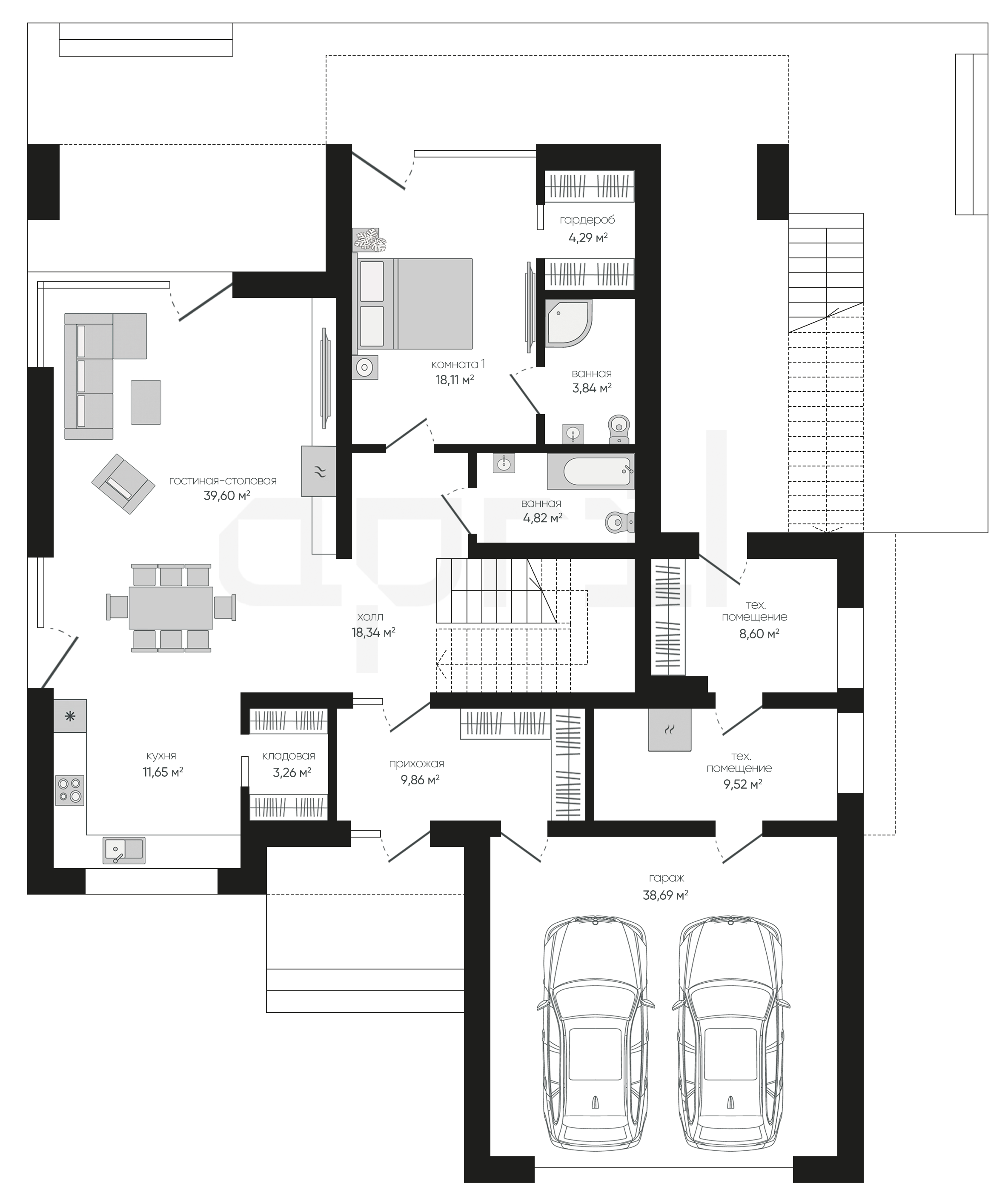 Проект современный, с чистыми линиями и минималистичным дизайном. Дом имеет два этажа и пристроенный гараж, интегрированный в общий дизайн.