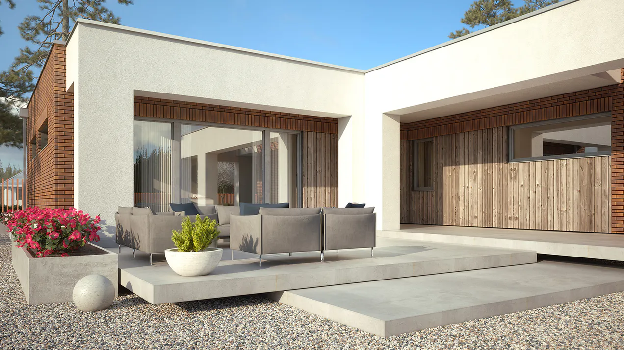 Элегантная терраса дополняет дизайн дома и предоставляет приятное место для отдыха и общения на свежем воздухе.