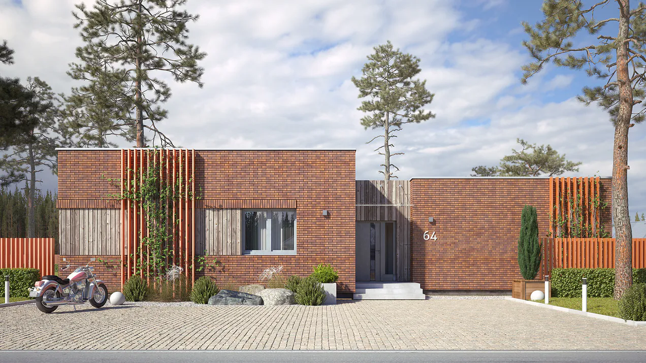 Фасад выполнен в основном из красного кирпича с элементами отделки из дерева и белой штукатурки со стороны террасы.