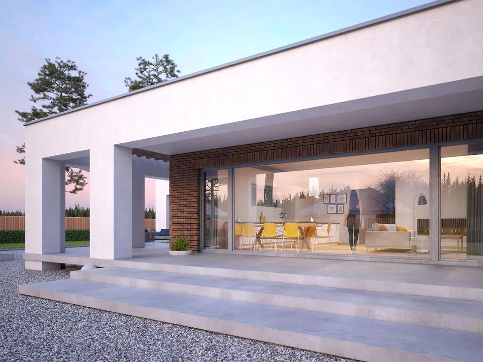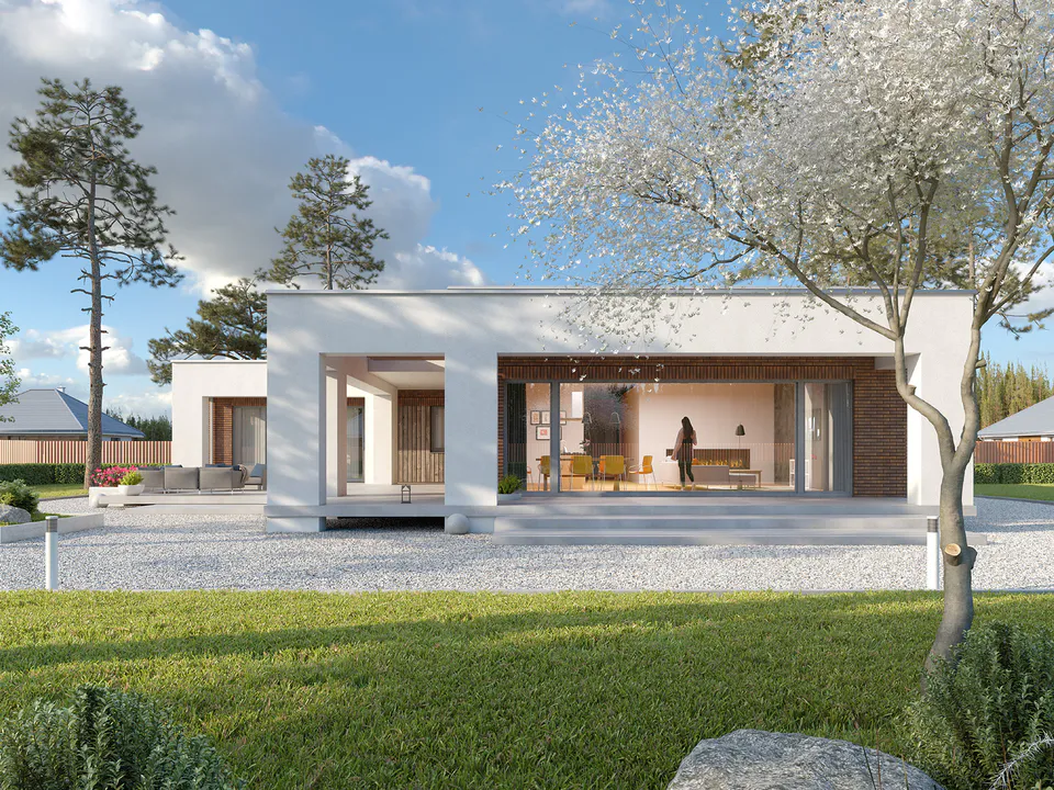 Проект современного одноэтажного дома с плоской крышей и террасой.