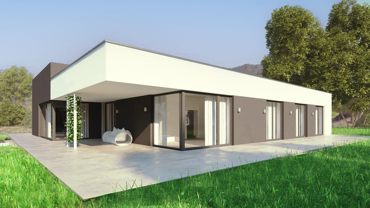 Проект современного одноэтажного дома с плоской крышей, террасой и гаражом.