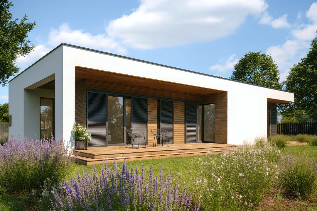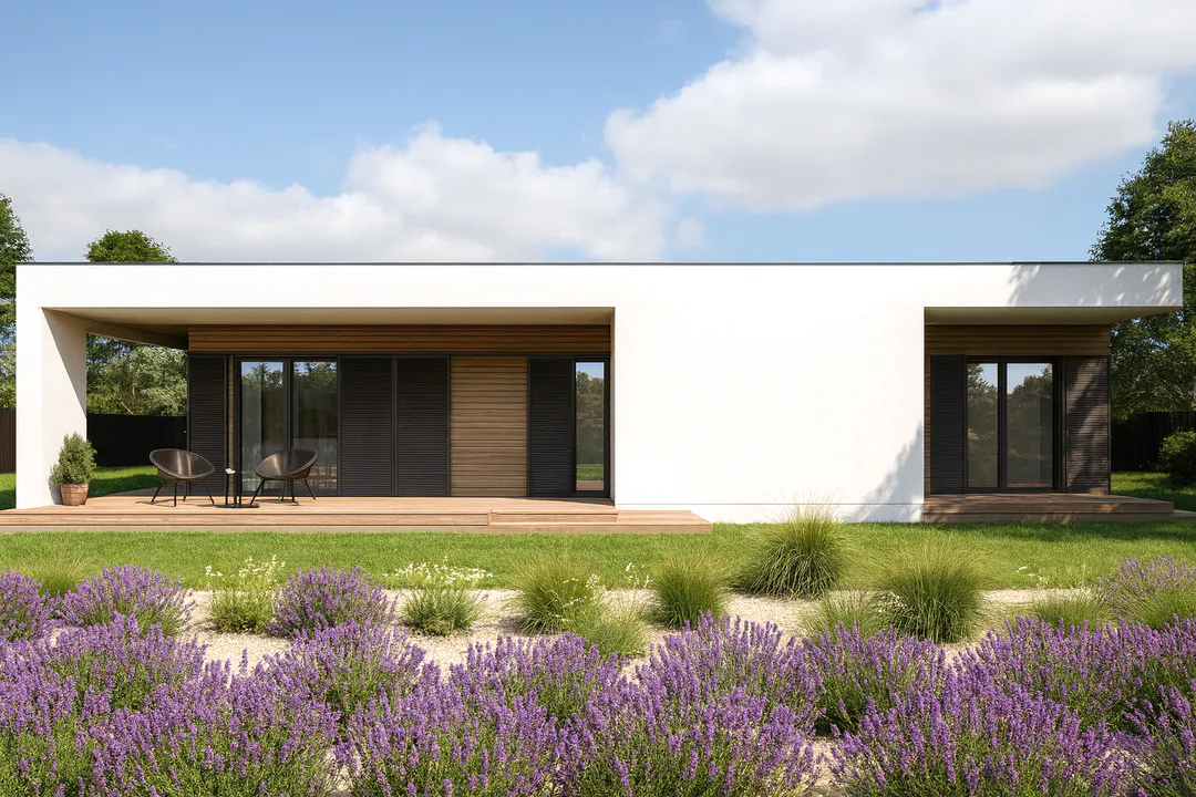 Проект современного одноэтажного дома с плоской крышей и террасой.