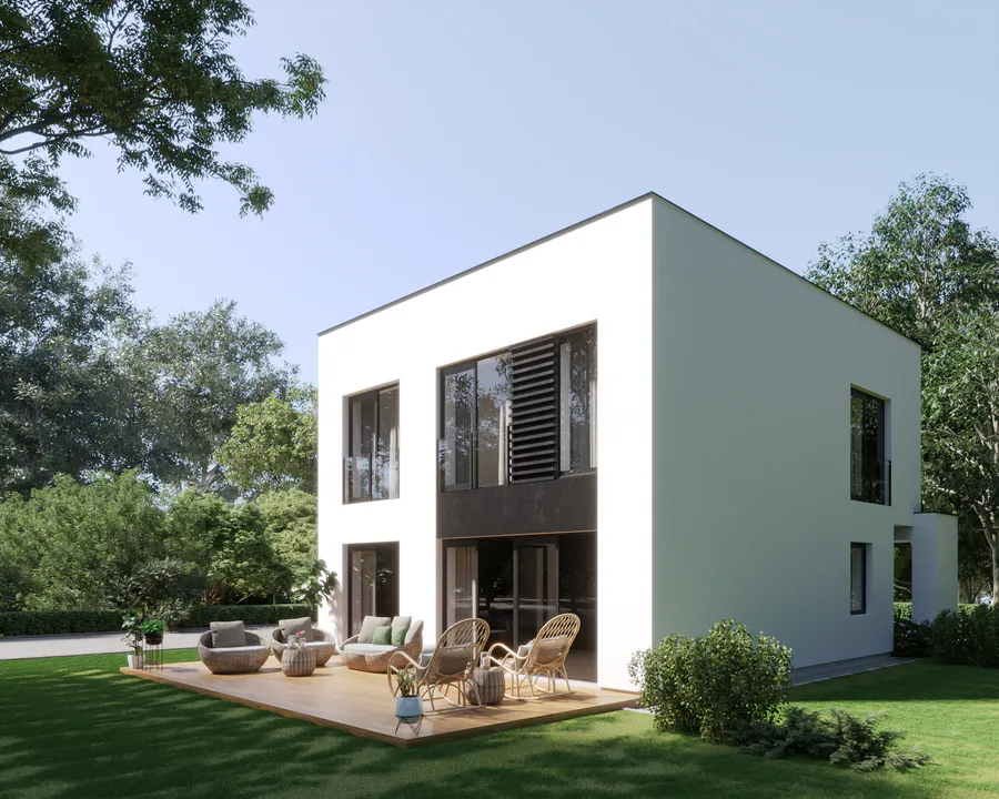 Проект современный в стиле Хайтек, с чистыми линиями и геометрическими формами. Отсутствие скатной крыши и декоративных элементов подчеркивает минимализм.