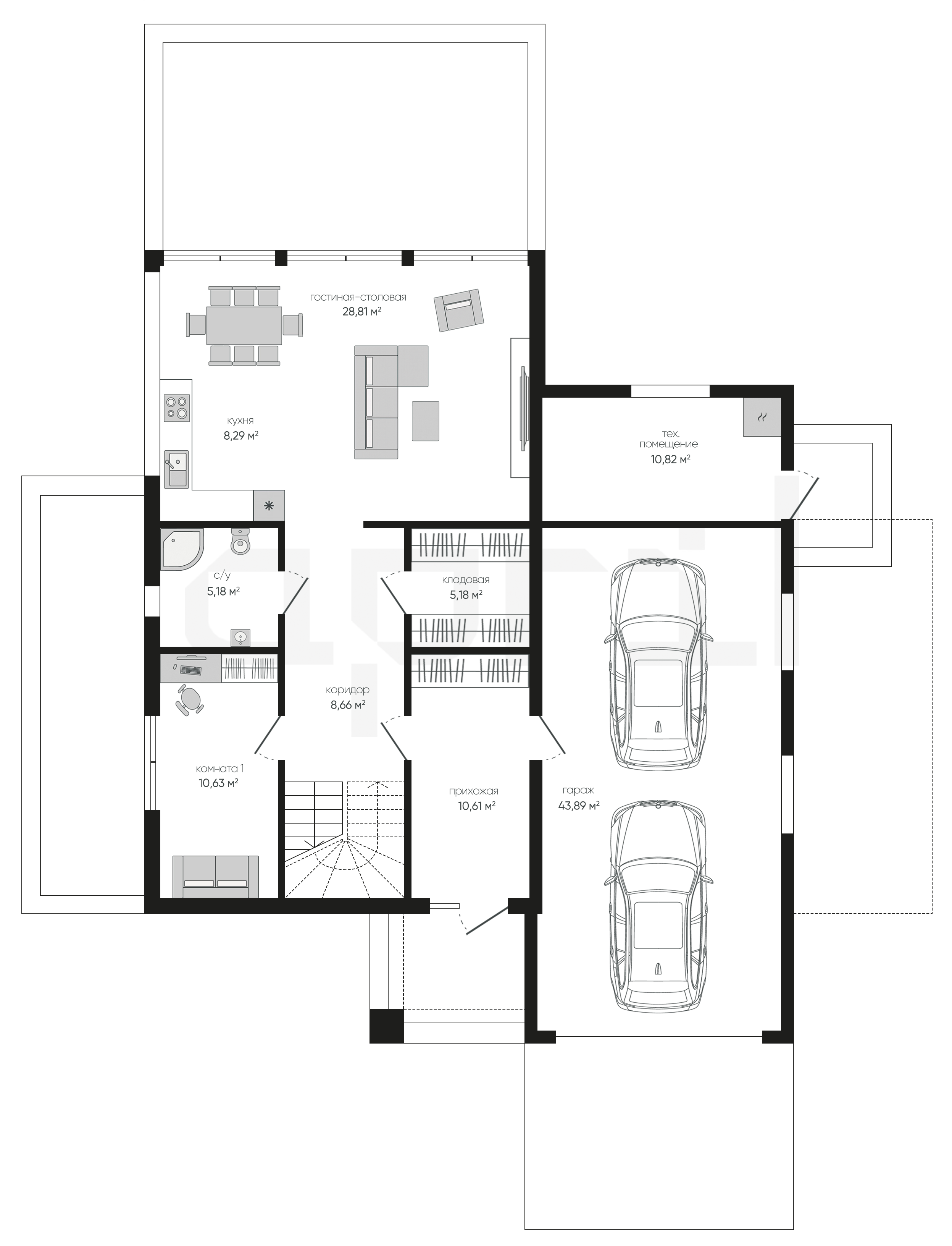 Плоская крыша, чистые формы и линии очерчивают силуэт дома, придавая ему современный и элегантный вид.