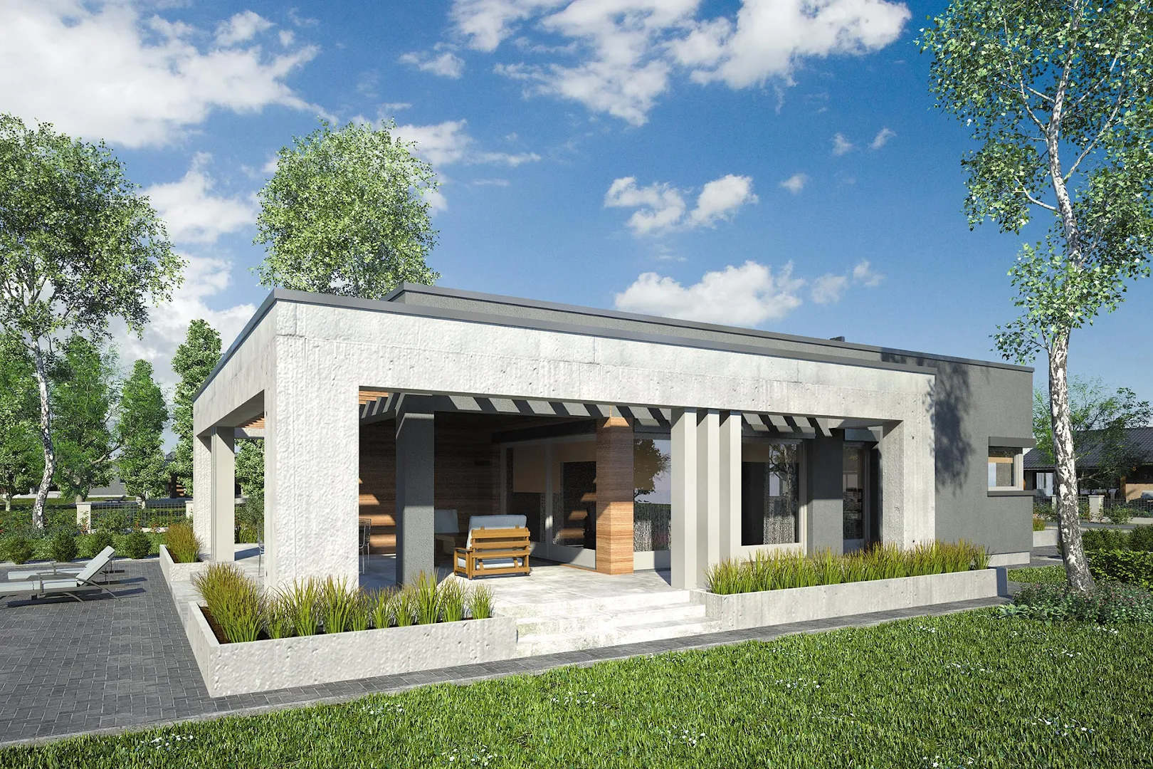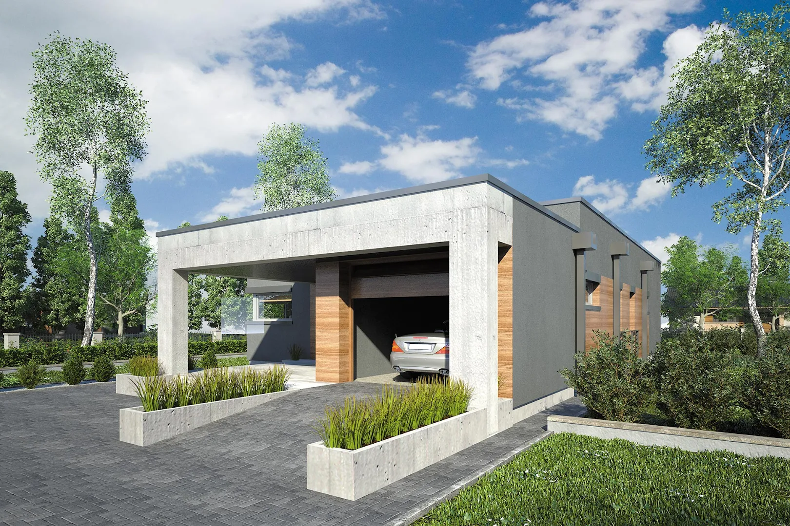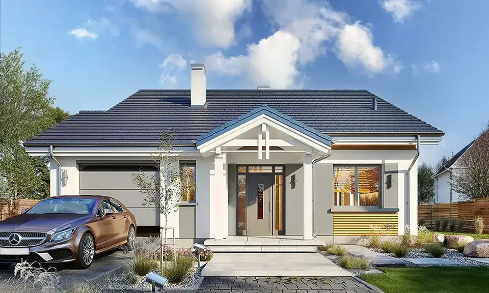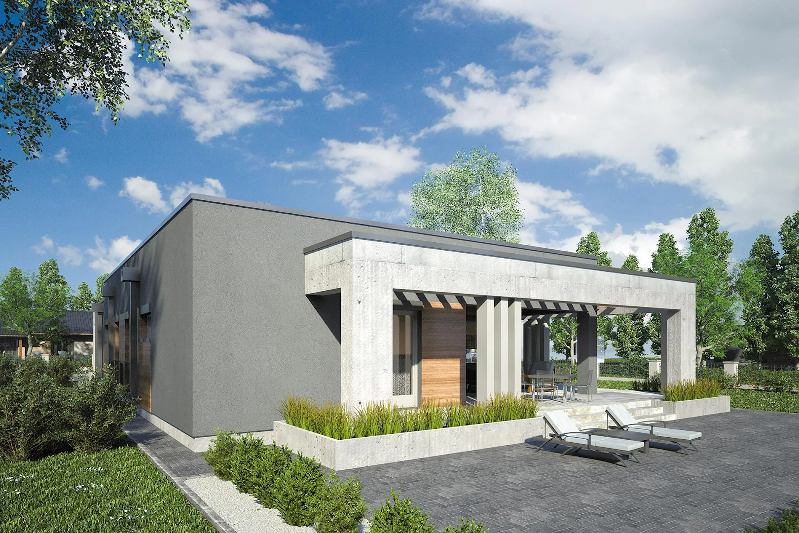 Проект современного одноэтажного дома с плоской крышей, оригинальной террасой, покрытой перголой и гаражом на одну машину.