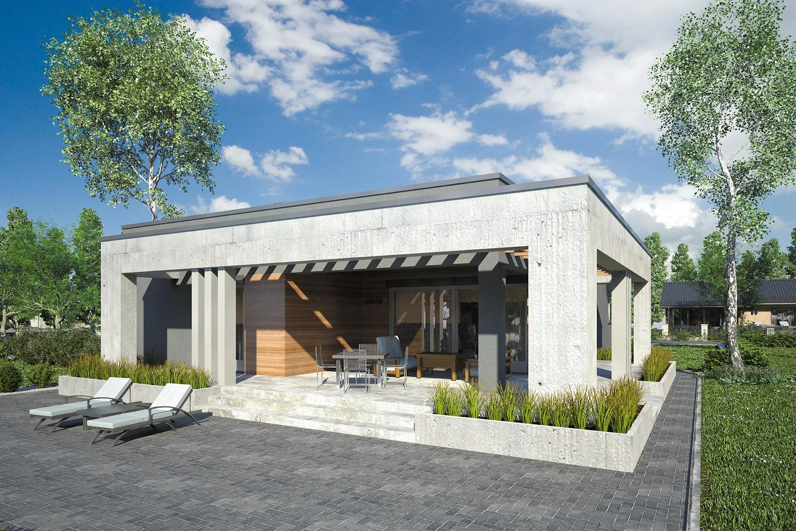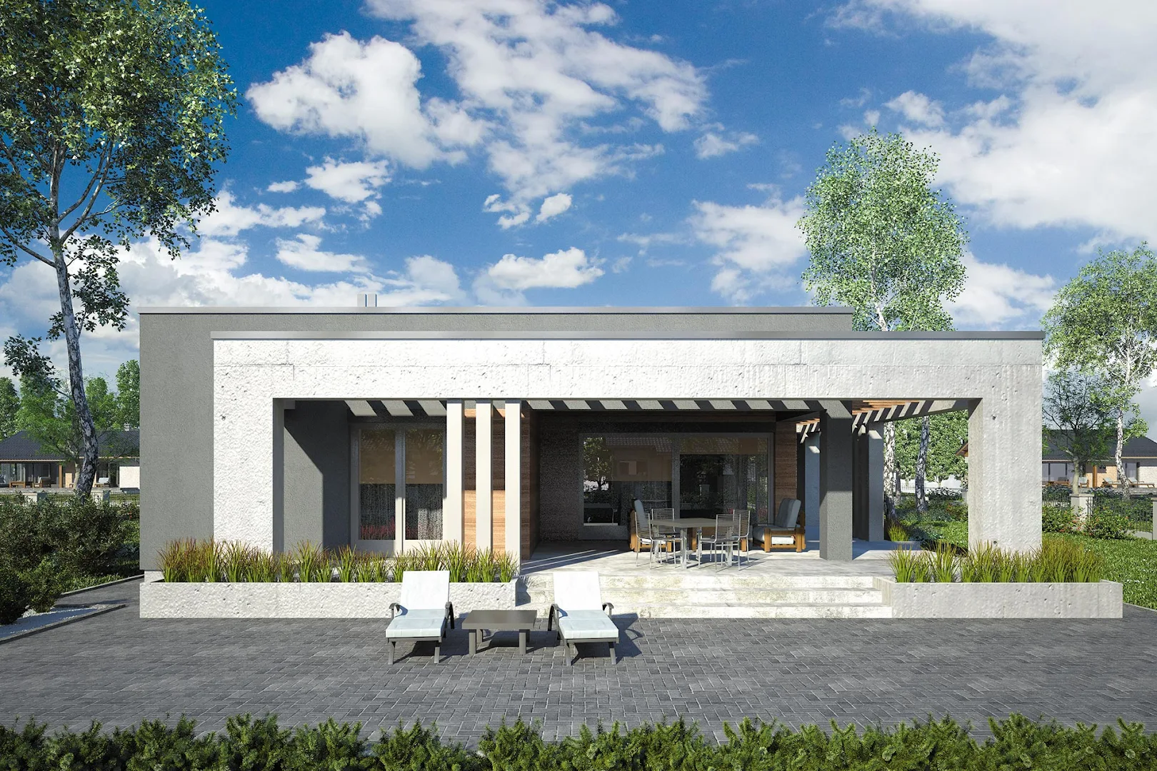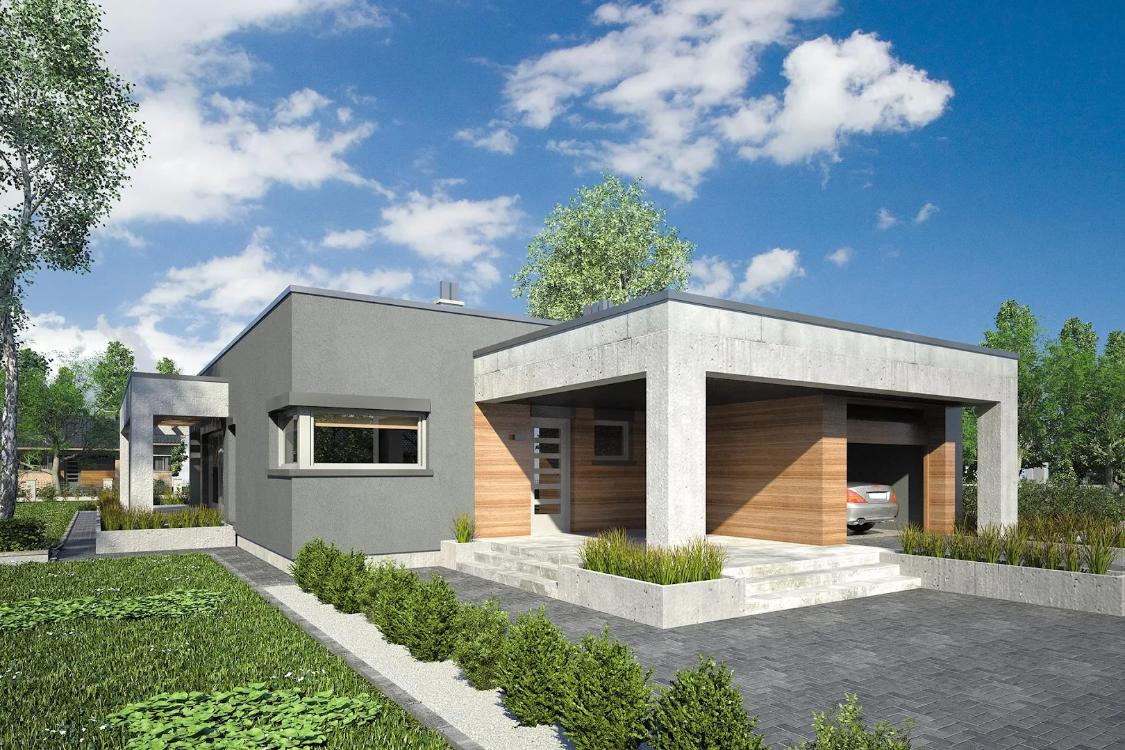Проект современного одноэтажного дома с плоской крышей, оригинальной террасой, покрытой перголой и гаражом на одну машину.
