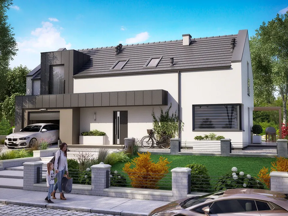 Основная часть дома имеет отделку штукатуркой актуального серого цвета. Навес и часть фасада отделаны материалами, имитирующими бетон и дерево, что создает контраст и добавляет теплоты в общий облик.