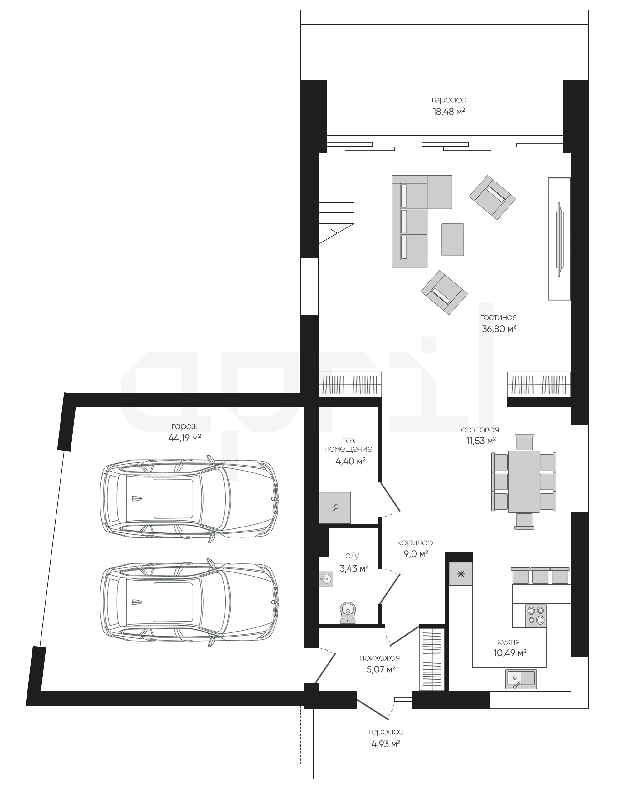 Дом имеет строгую, кубическую форму с плоской крышей и большими окнами, что характерно для современного архитектурного стиля Хайтек с минималистичным дизайном.
